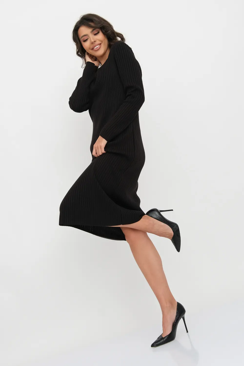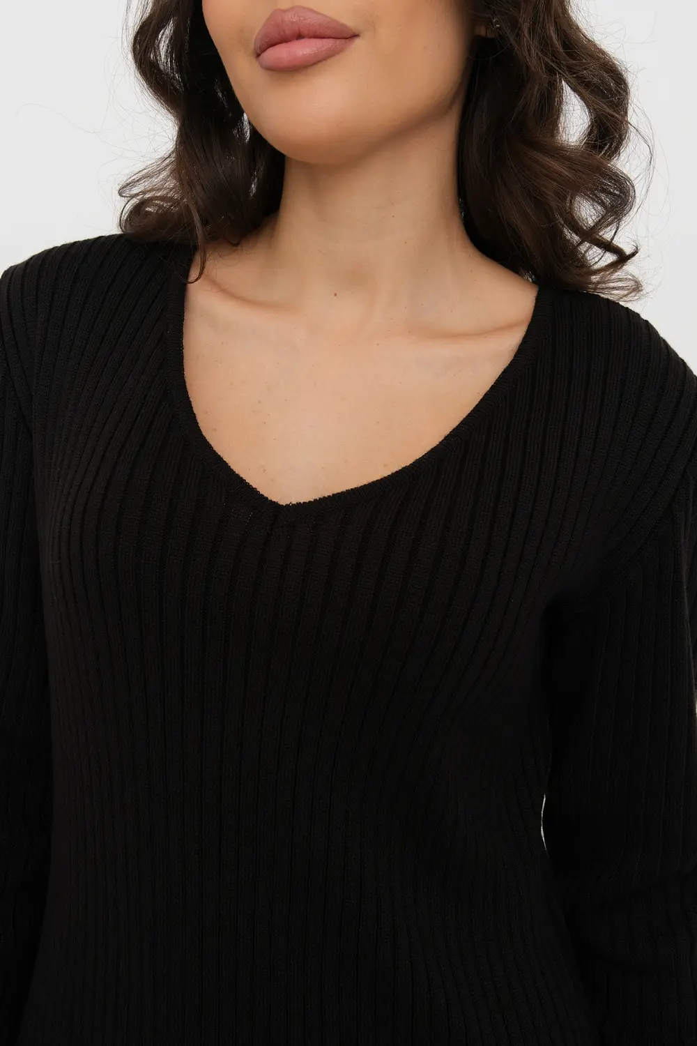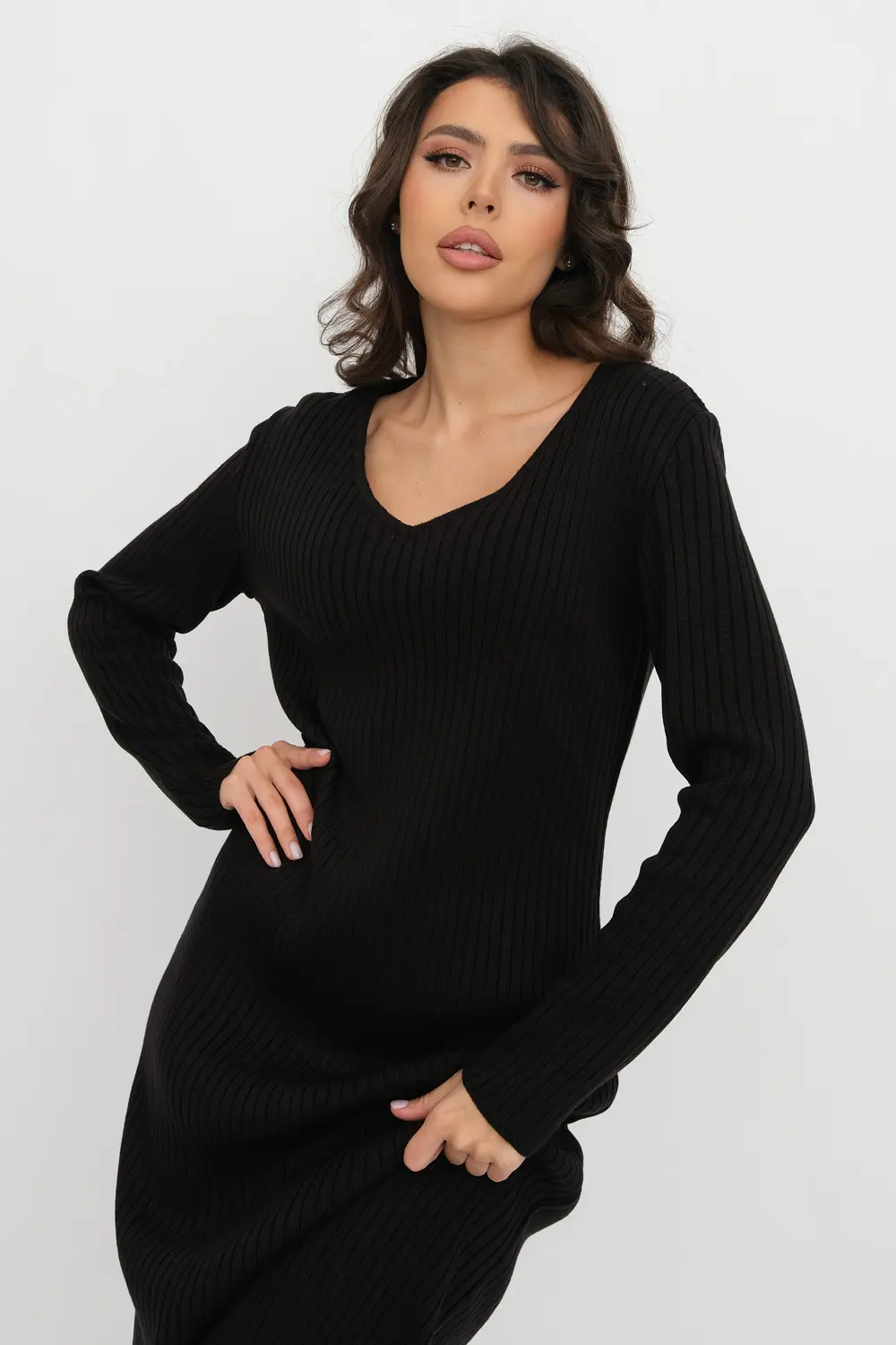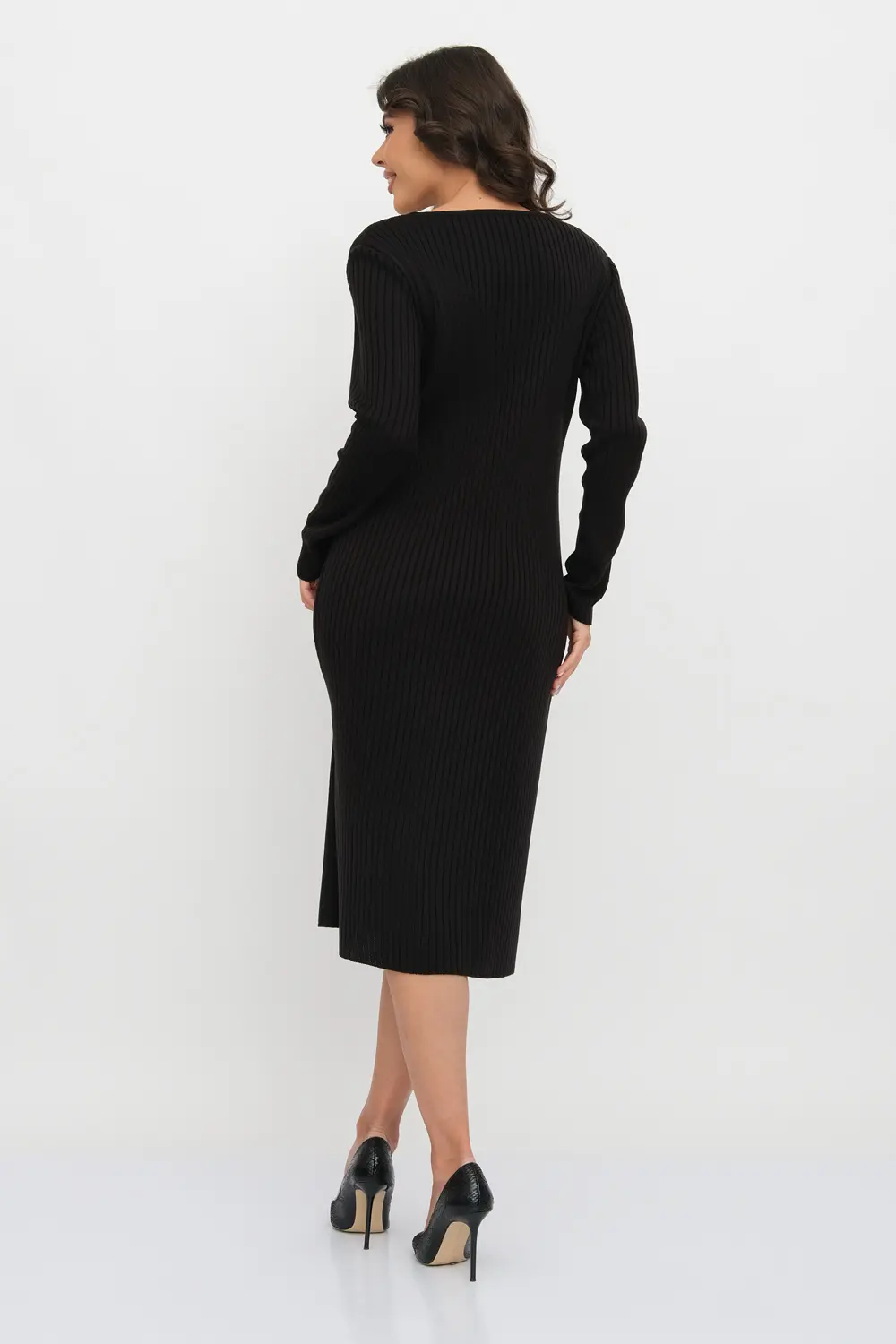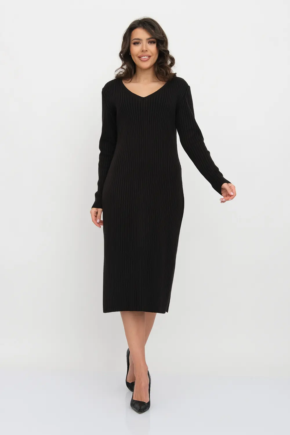 Трикотажное платье облегающего силуэта длиной немного ниже колена с V-образным вырезом. Рукава втачные длинные. Платье выполнено переплетением "лапша".