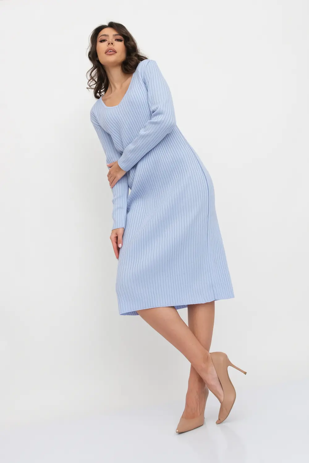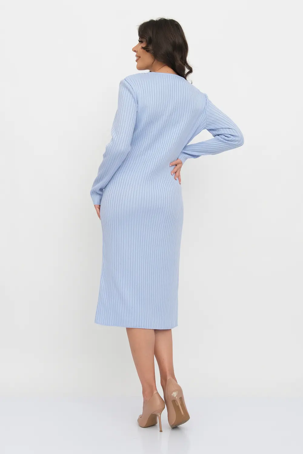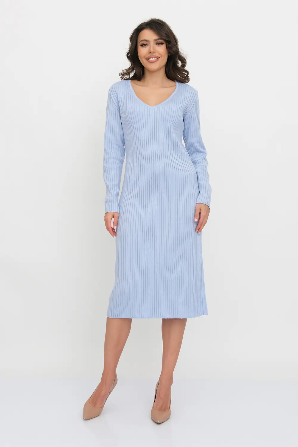 Трикотажное платье облегающего силуэта длиной немного ниже колена с V-образным вырезом. Рукава втачные длинные. Платье выполнено переплетением "лапша".