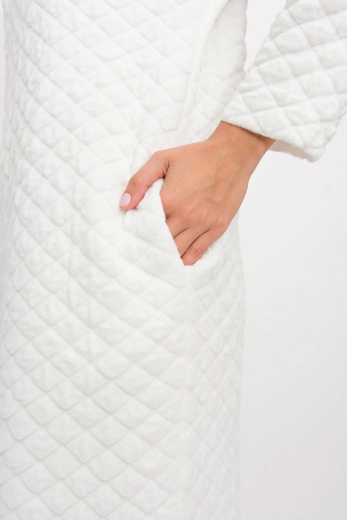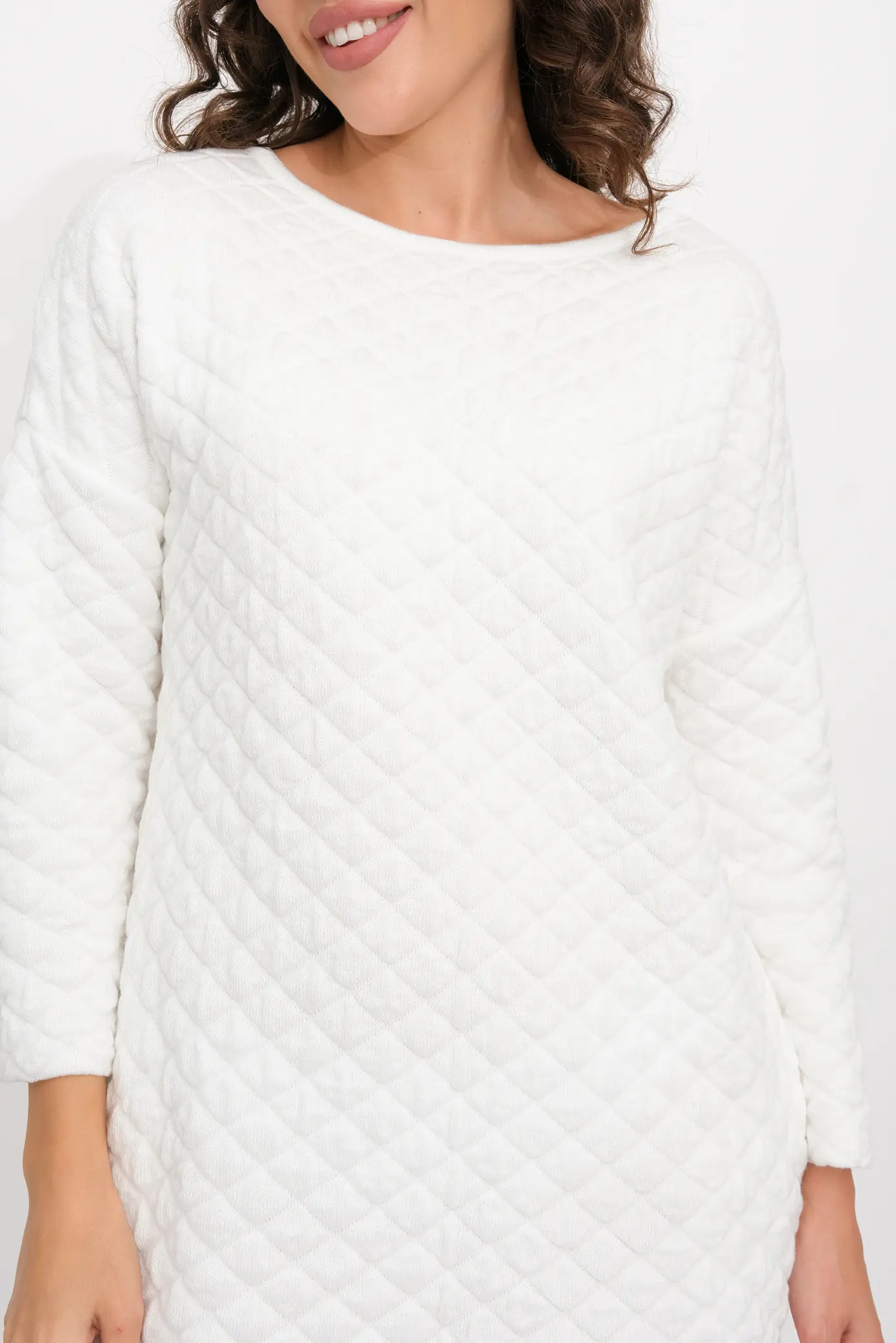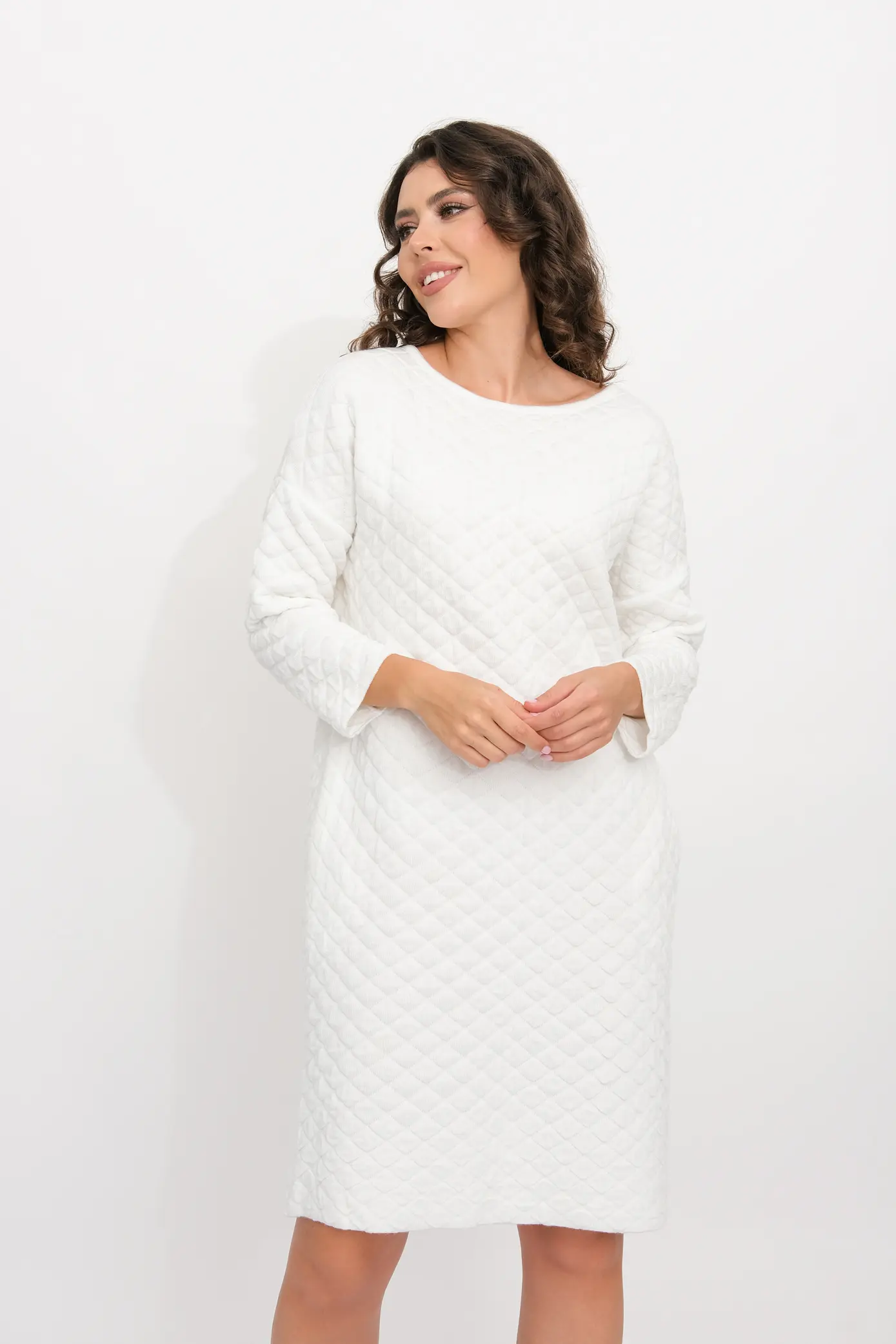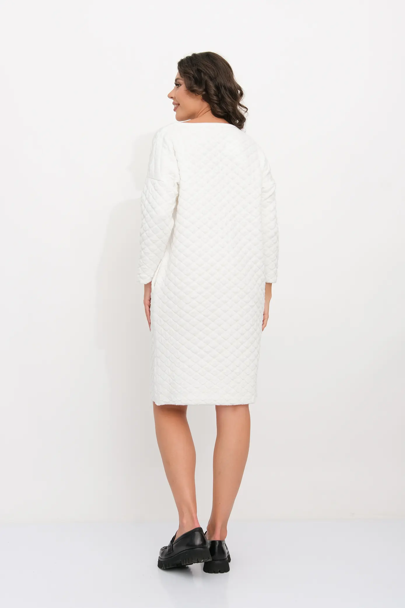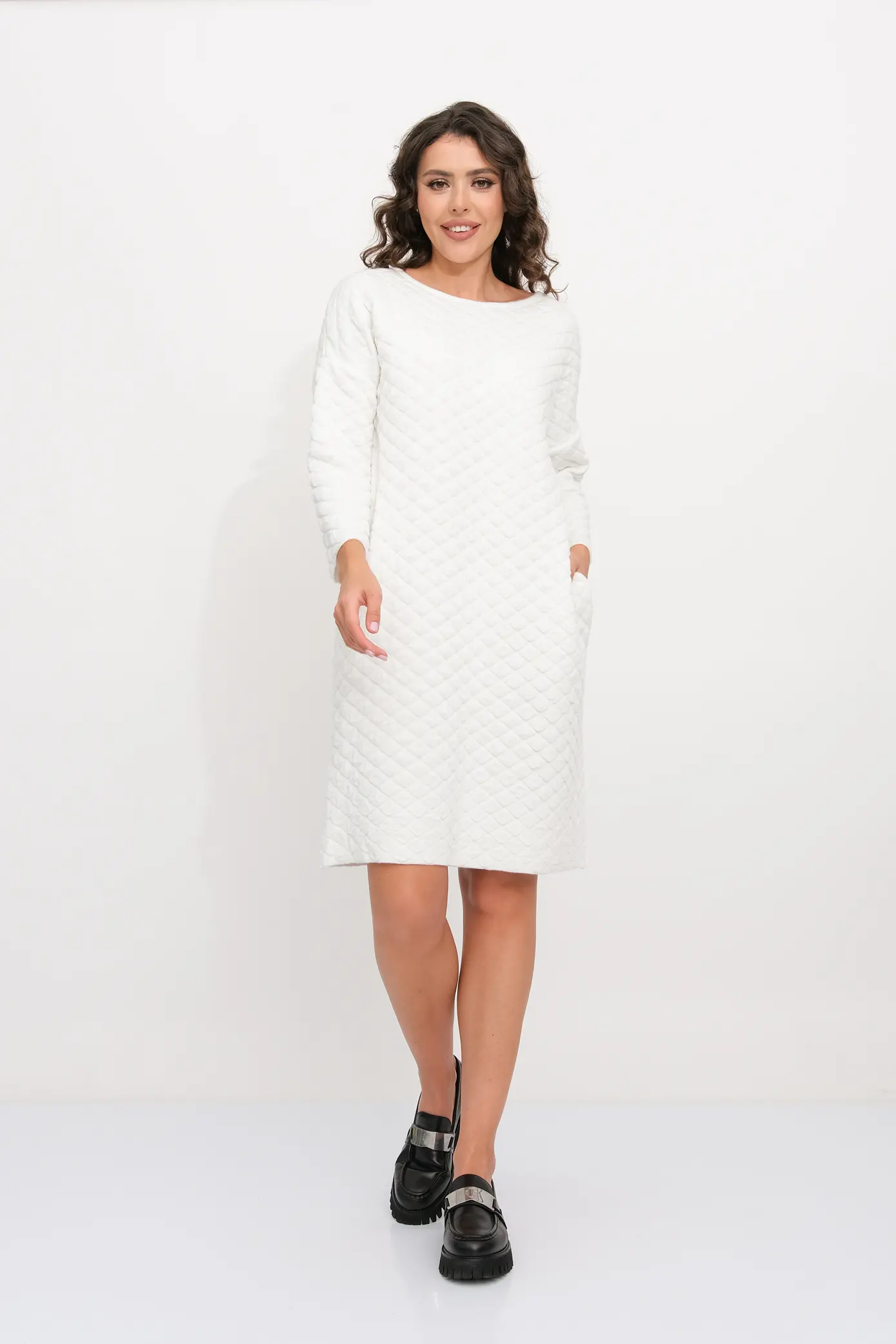 Женское трикотажное платье свободного силуэта. Вырез горловины круглый, рукава втачные длинные со спущенным плечом. Платье выполнено жаккардовым переплетением, образуя диагональные немного выпуклые ромбы.