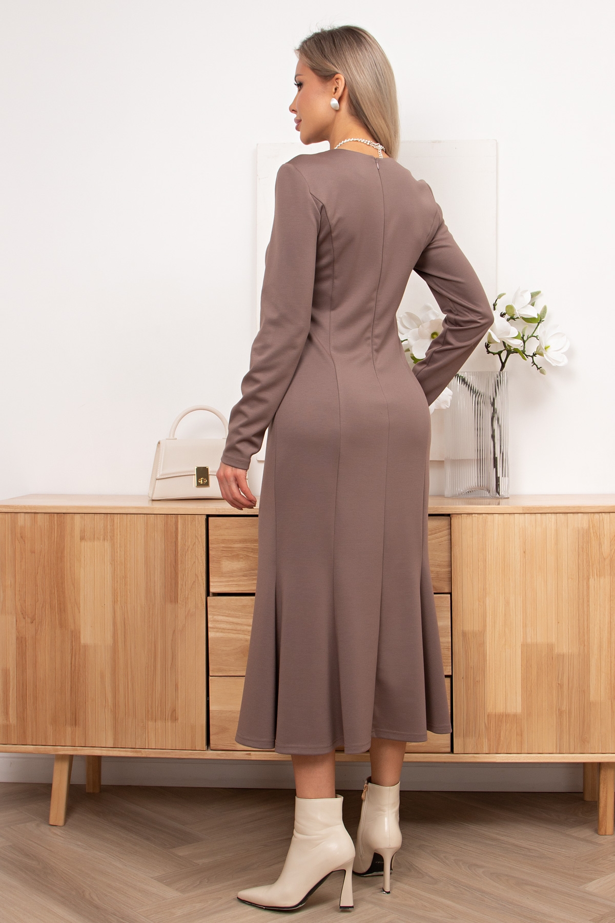 Платье прилегающего силуэта из однотонного трикотажного полотна. V - образная горловина на внутренней обтачке. В среднем шве спинки расположена застежка на потайную молнию. Длинный втачной рукав. Платье облегающее и подчёркивающее бёдра и затем расширяющееся внизу, — один из самых женственных фасонов для платьев.