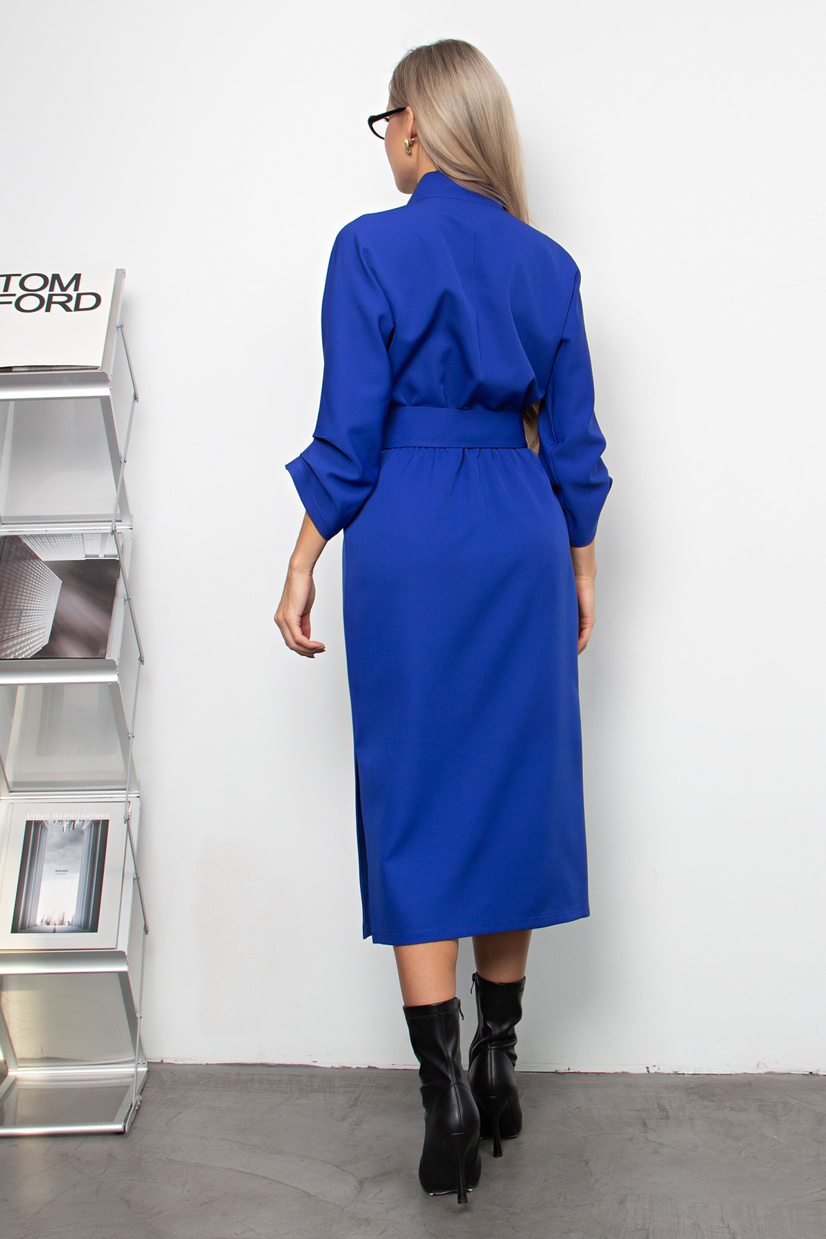 Женственное платье полуприлегающего силуэта изготовлено из плательно-костюмной ткани. Цельнокроенный рукав по низу зафиксирован защипами. Горловина оформлена воротником-стойка По переду планка с застежкой на петли и пуговицы. Модель отрезная по линии талии. Низ ровный, с боку разрез. Модель дополняет пояс с застежкой на петли и пуговицы.