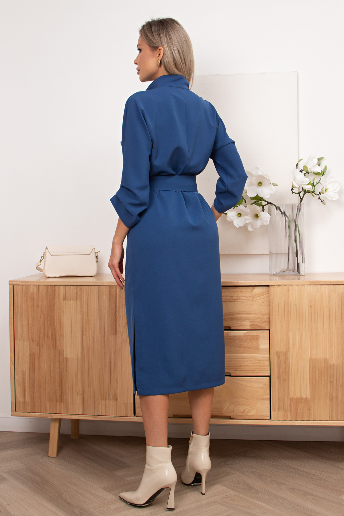 Женственное платье полуприлегающего силуэта изготовлено из плательно-костюмной ткани. Цельнокроенный рукав по низу зафиксирован защипами. Горловина оформлена воротником-стойка По переду планка с застежкой на петли и пуговицы. Модель отрезная по линии талии. Низ ровный, с боку разрез. Модель дополняет пояс с застежкой на петли и пуговицы.