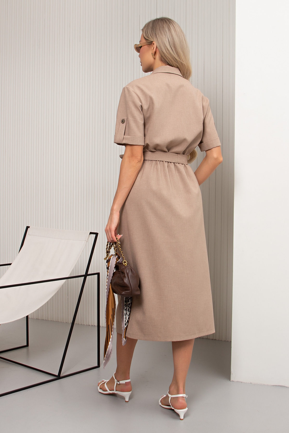 Комфортное платье - сафари изготовлено из текстильного полотна. Английский отложной воротник. По переду застежка на петли и пуговицы. Короткий втачной рукав с отложной манжетой и патой . Перед оформлен накладными клапанами. Модель отрезная по линии талии присобрана на эластичную резину. Низ ровный,по переду разрез . Пояс из основной ткани в комплекте.
