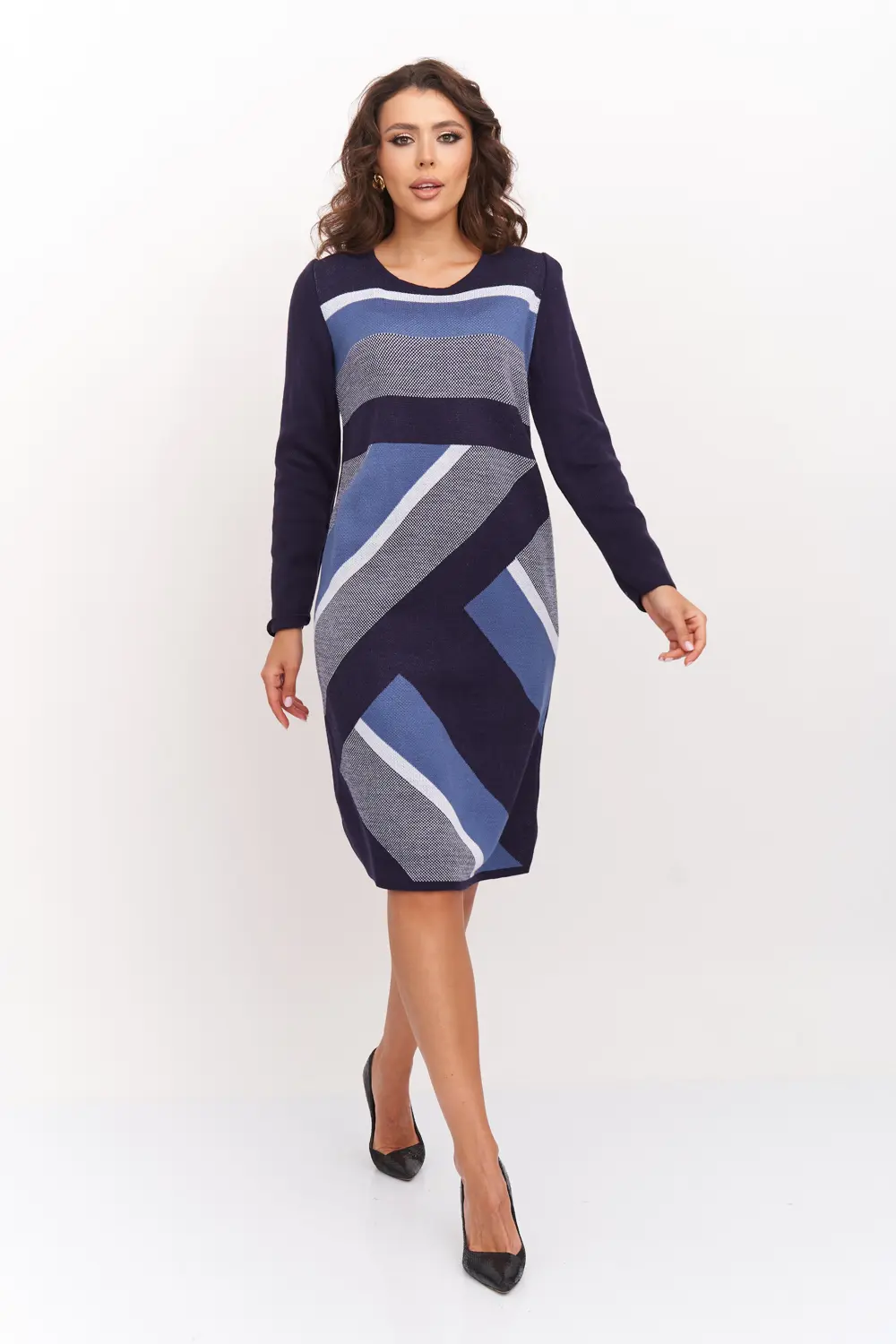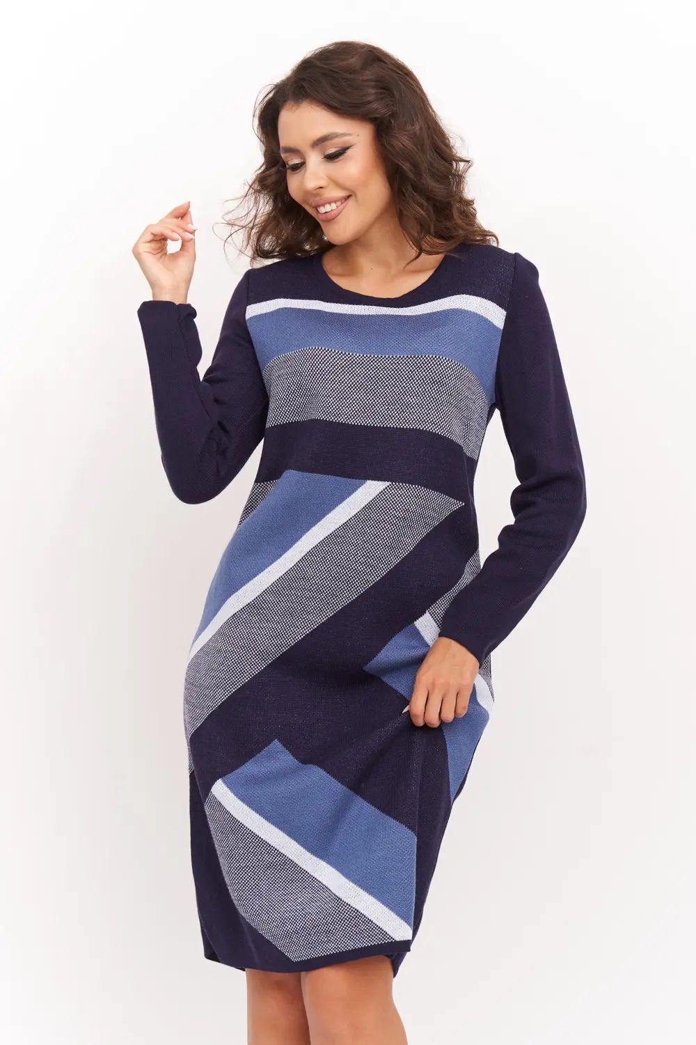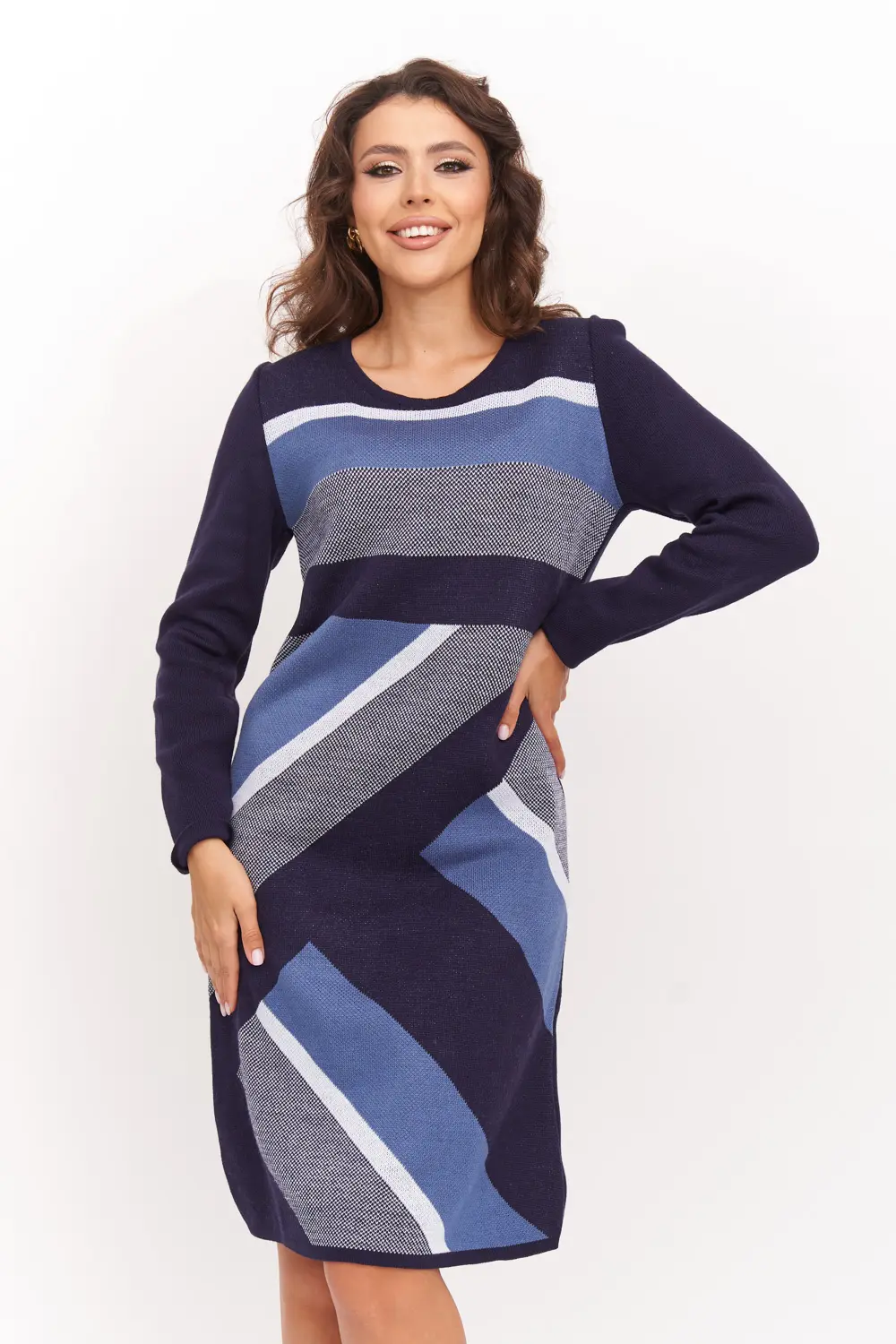 Вязаное платье женское полуприлегающего силуэта длиной до колена. Рукава втачные длинные. Горловина круглая, обработана бейкой. Жаккардовое переплетение из диагональных полос контрастного цвета. Платье вязаное из полушерстяной пряжи и подходит для использования в зимний период.