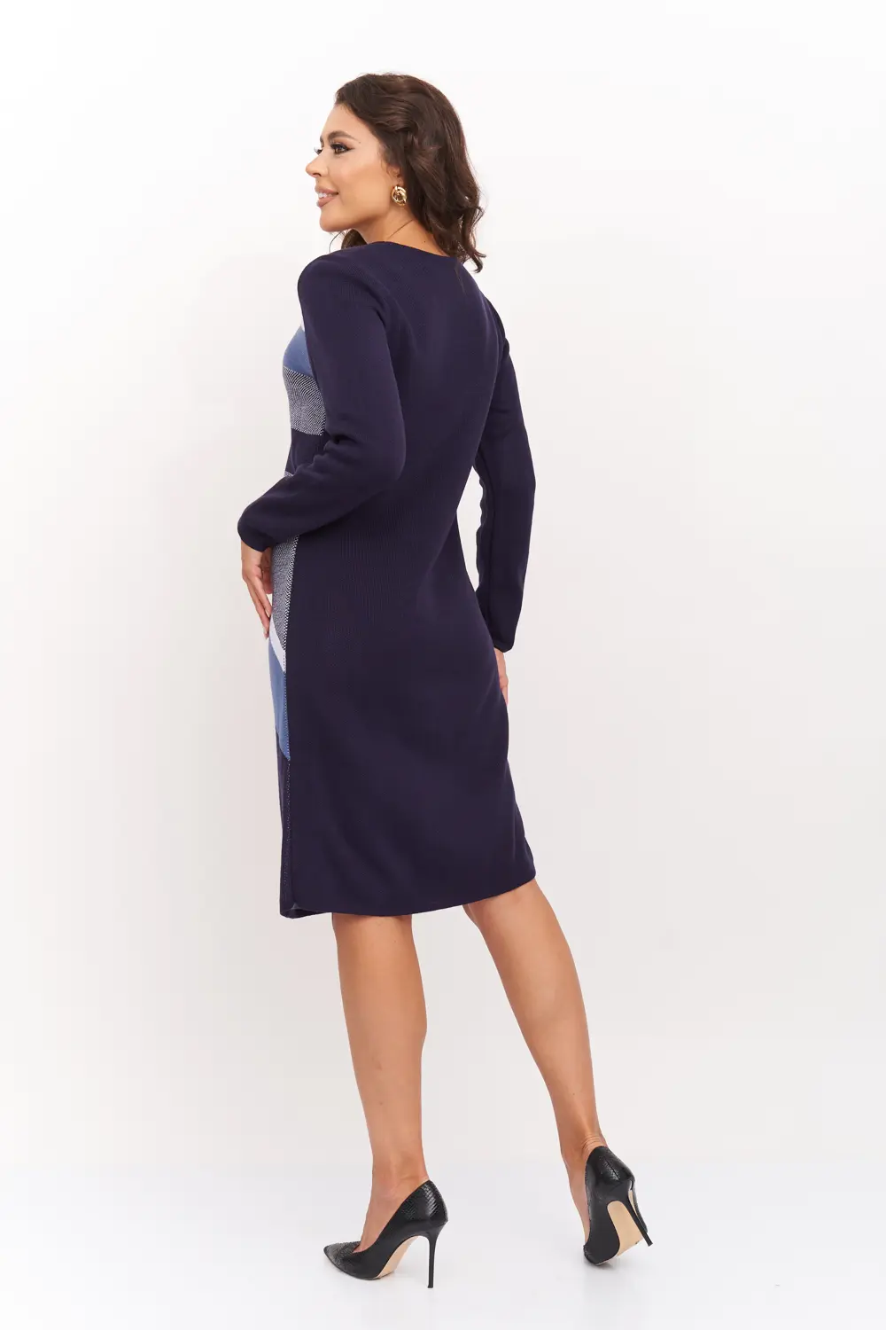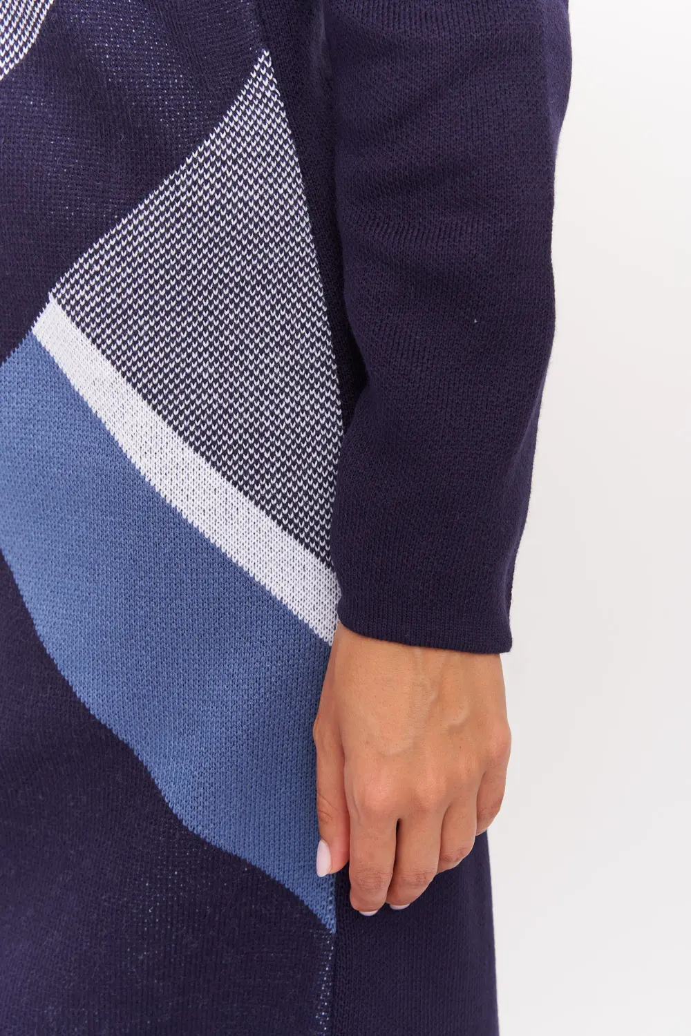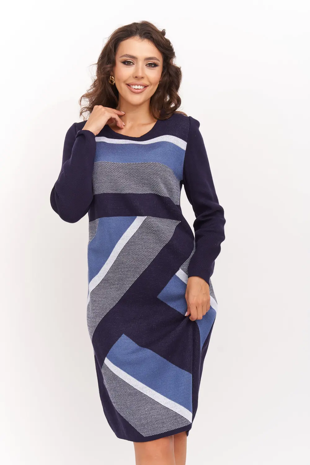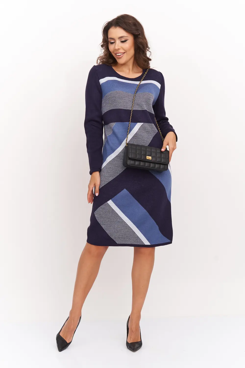 Вязаное платье женское полуприлегающего силуэта длиной до колена. Рукава втачные длинные. Горловина круглая, обработана бейкой. Жаккардовое переплетение из диагональных полос контрастного цвета. Платье вязаное из полушерстяной пряжи и подходит для использования в зимний период.