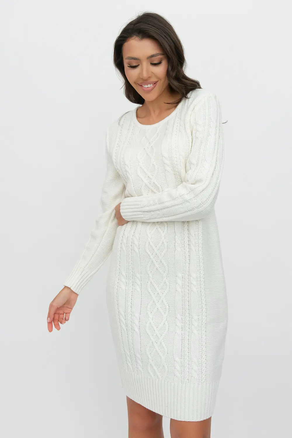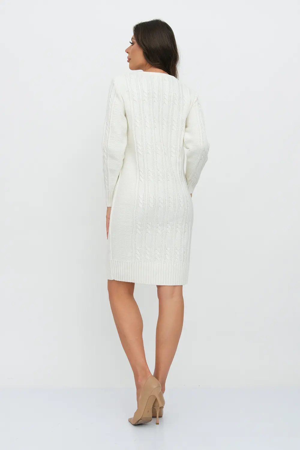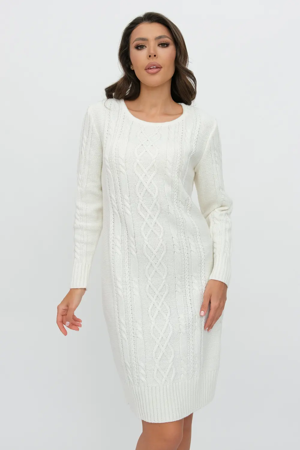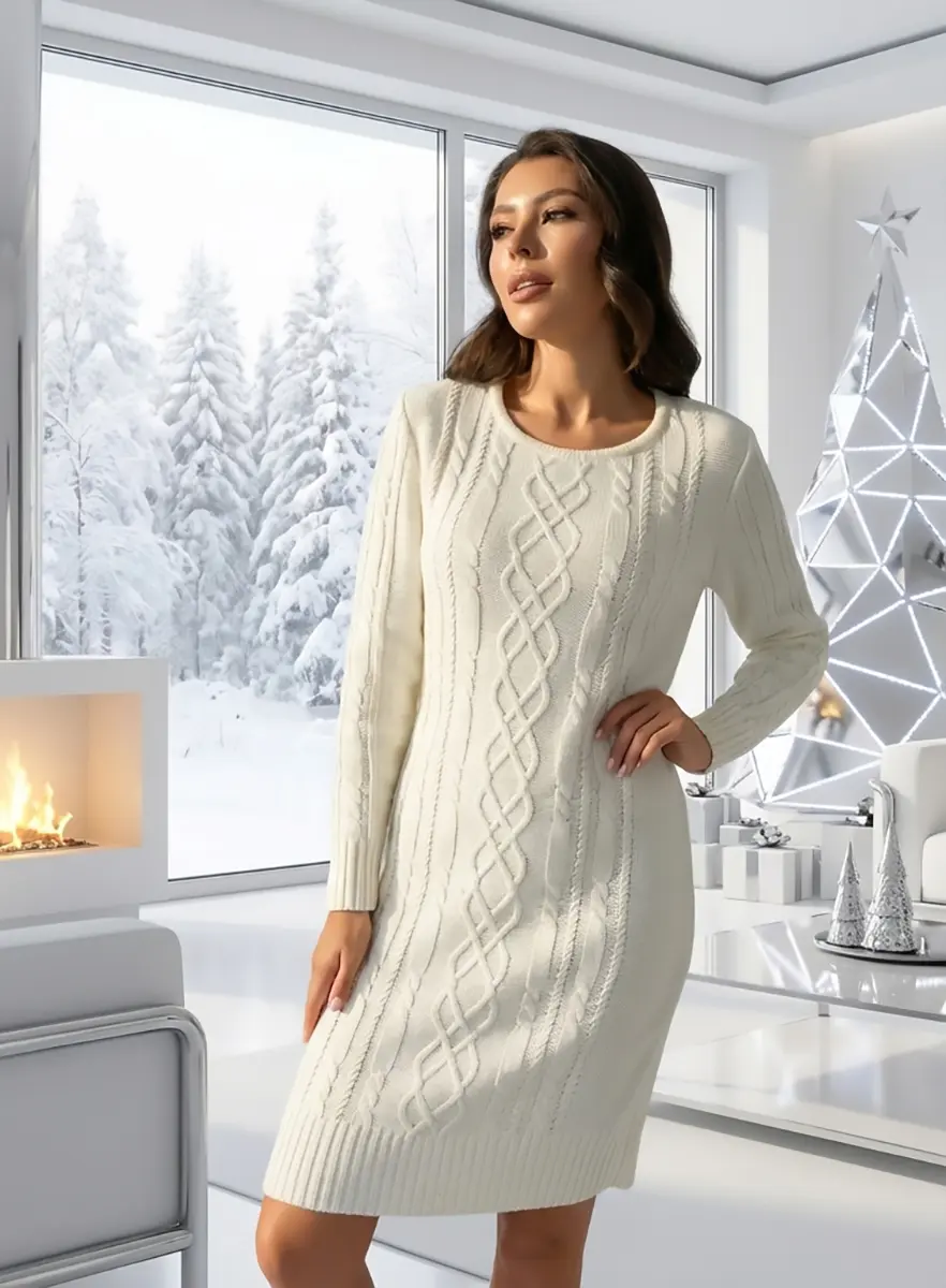Вязаное платье женское полуприлегающего силуэта . Рукава втачные длинные. Горловина круглая, обработана бейкой. Платье с фактурным узором косами станет украшением вашего осеннего гардероба. Женское вязаное платье изготовлено из мягкой и приятной к телу турецкой пряжи с содержанием шерсти.и подходит для использования в зимний период.