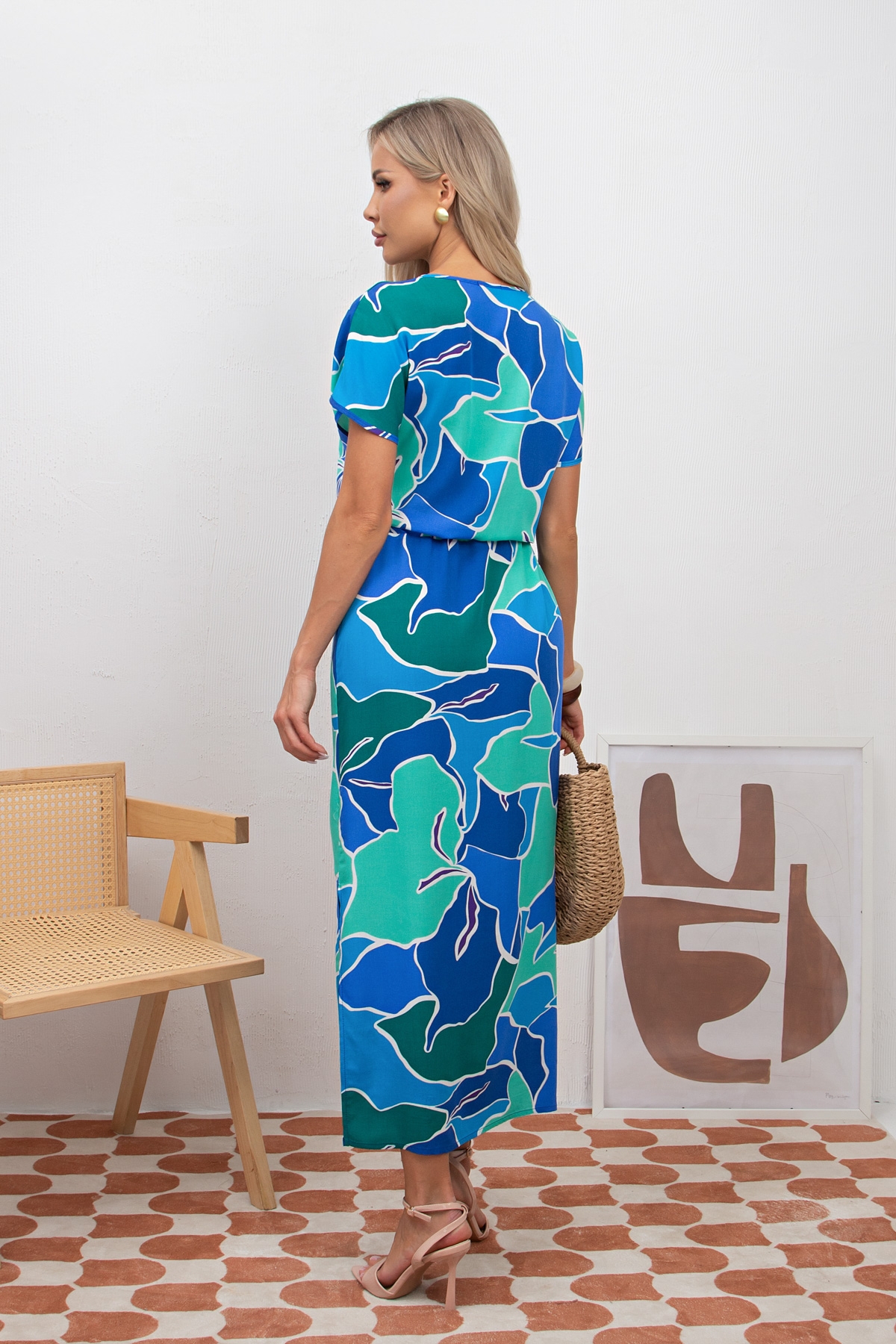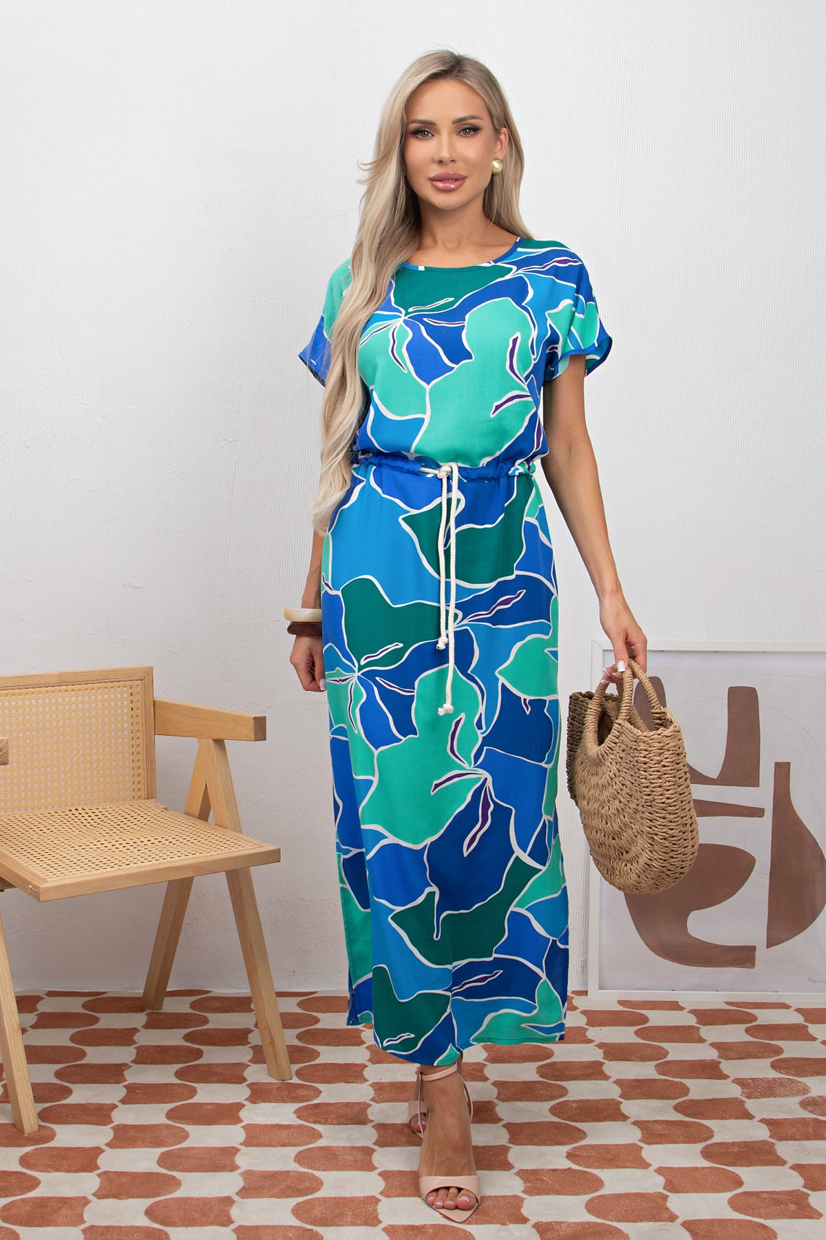 Комфортное платье прямого силуэта из легкой ткани. Модель без рукавов со спущенным плечом. Округлая горловина. По линии талии кулиска. Низ ровный, по бокам разрезы. Идеальный вариант на каждый день.