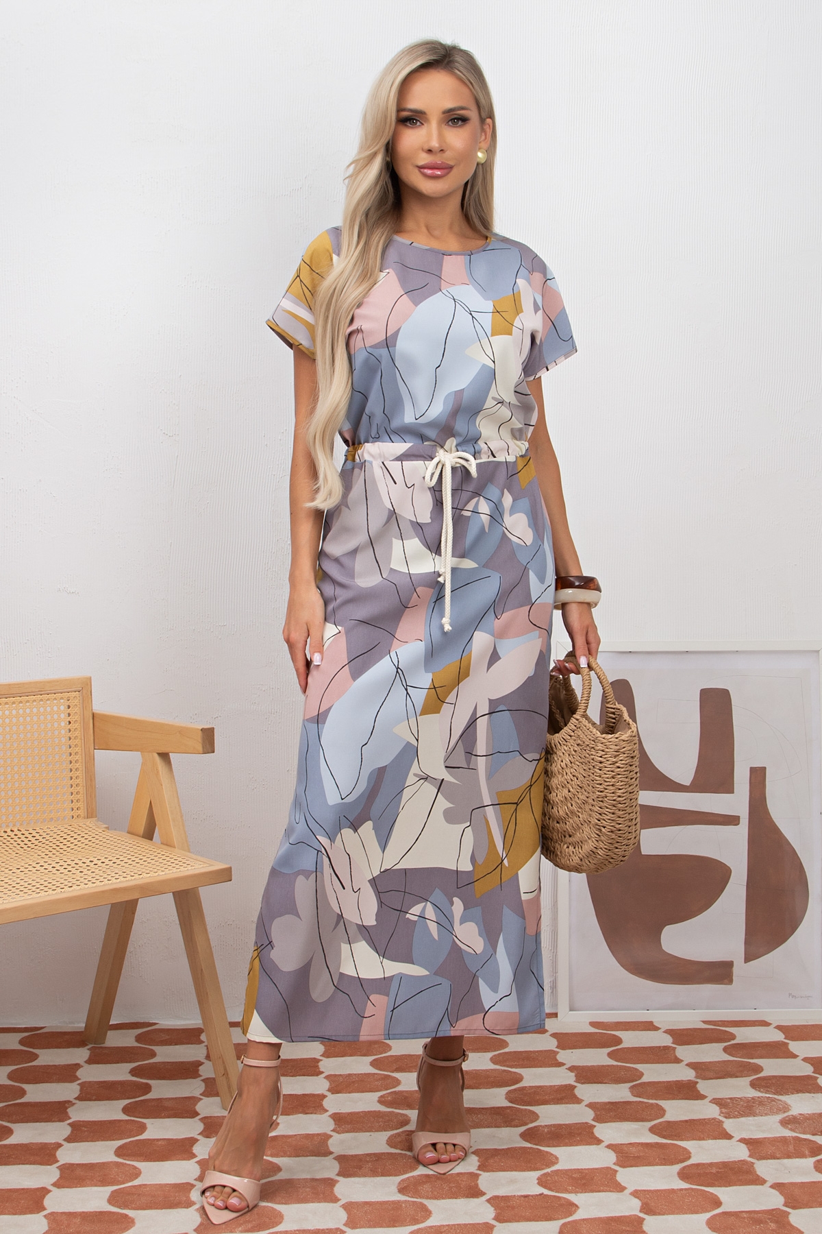Комфортное платье прямого силуэта из легкой ткани. Модель без рукавов со спущенным плечом. Округлая горловина. По линии талии кулиска. Низ ровный, по бокам разрезы. Идеальный вариант на каждый день.