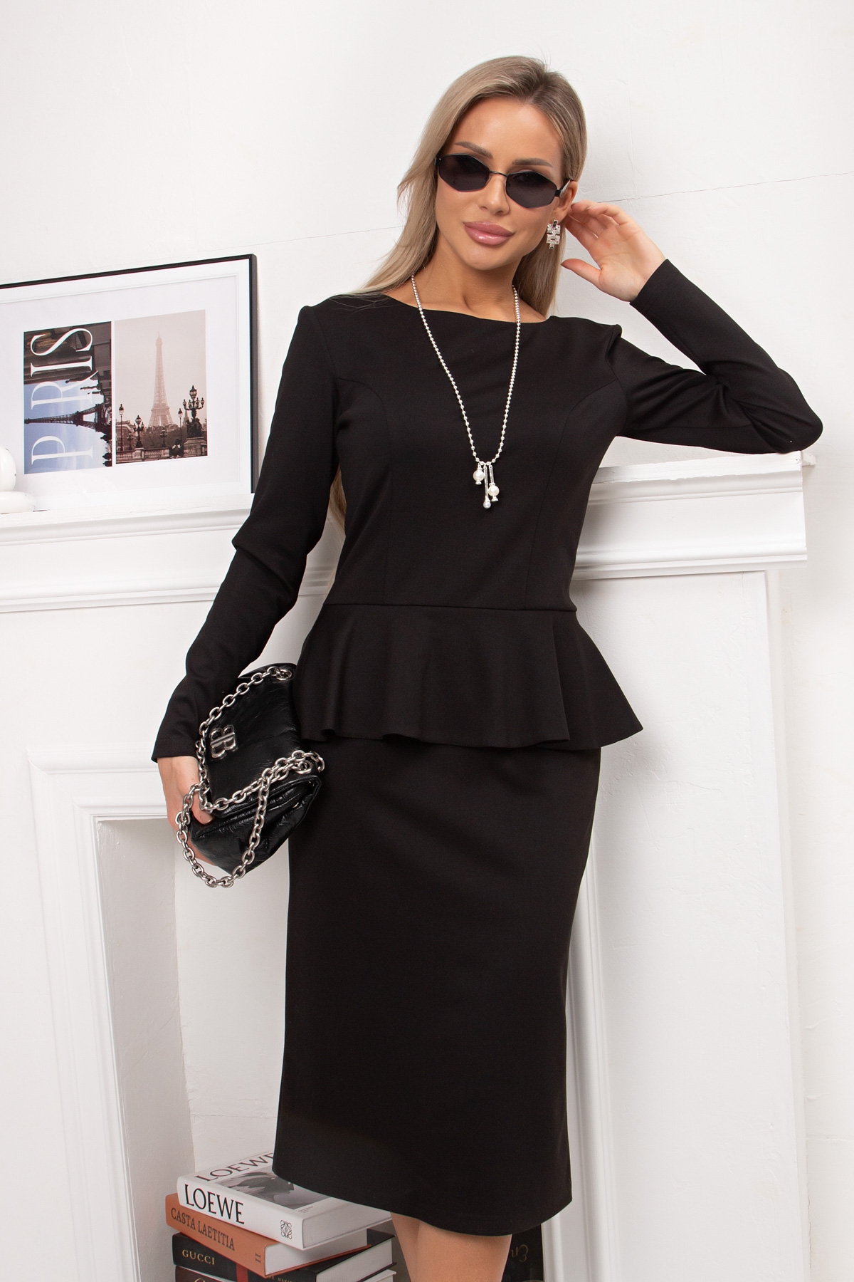 Элегантное платье полуприлегающего силуэта выполнено из трикотажного полотна. Длинный втачной рукав. Горловина на внутренней обтачке. По спинке застежка на потайную молнию. Модель отрезная по линии талии оформлена баской. Низ ровный, сзади разрез.