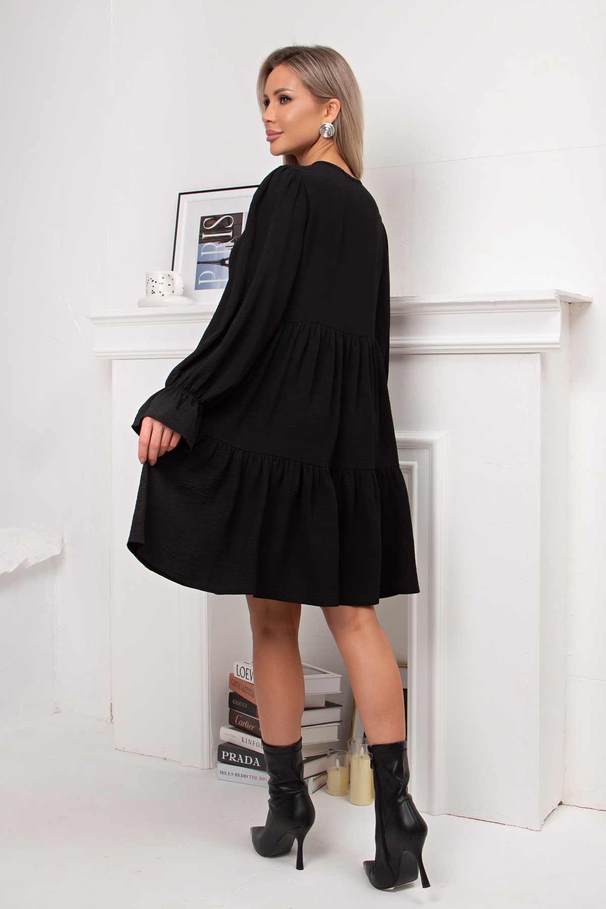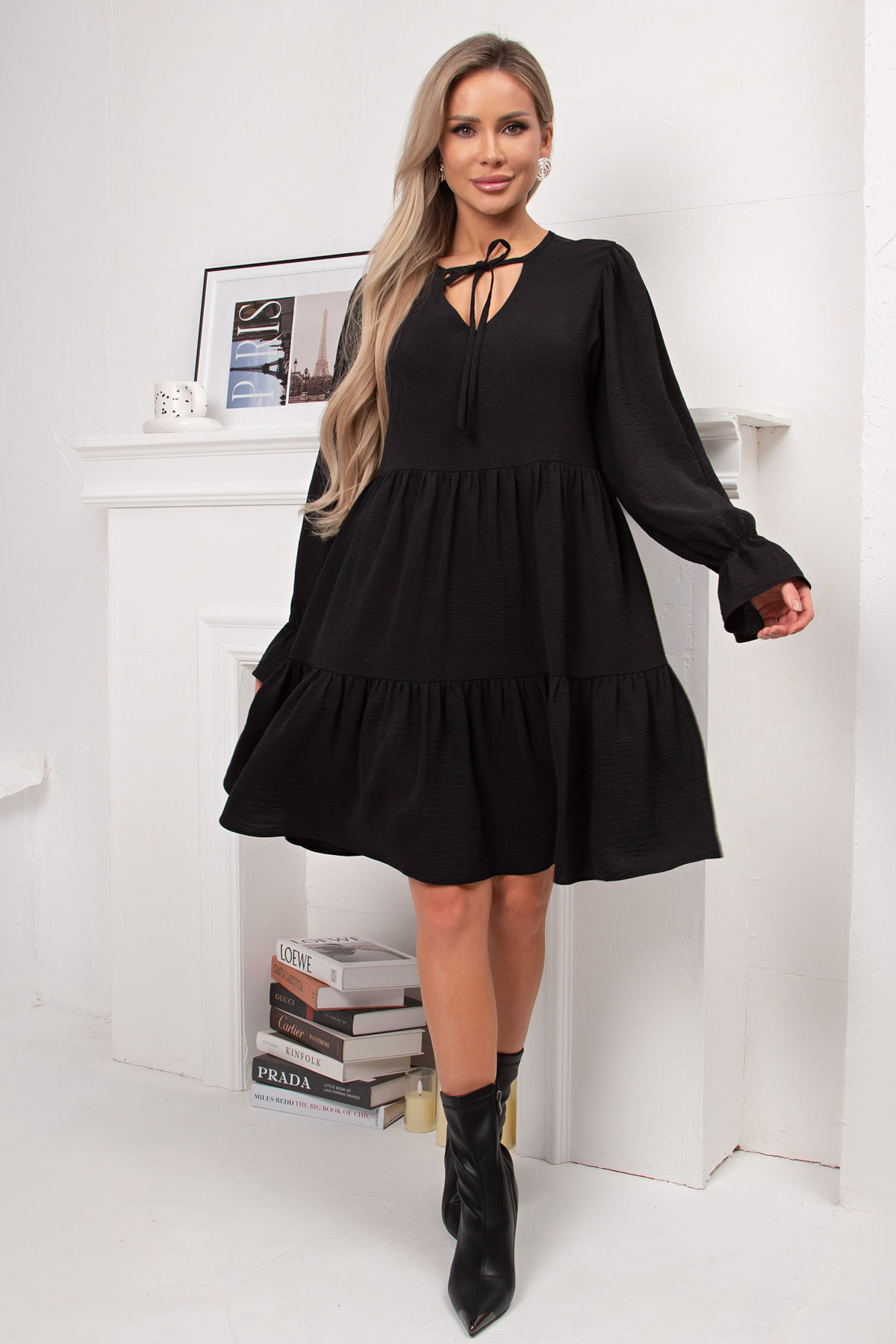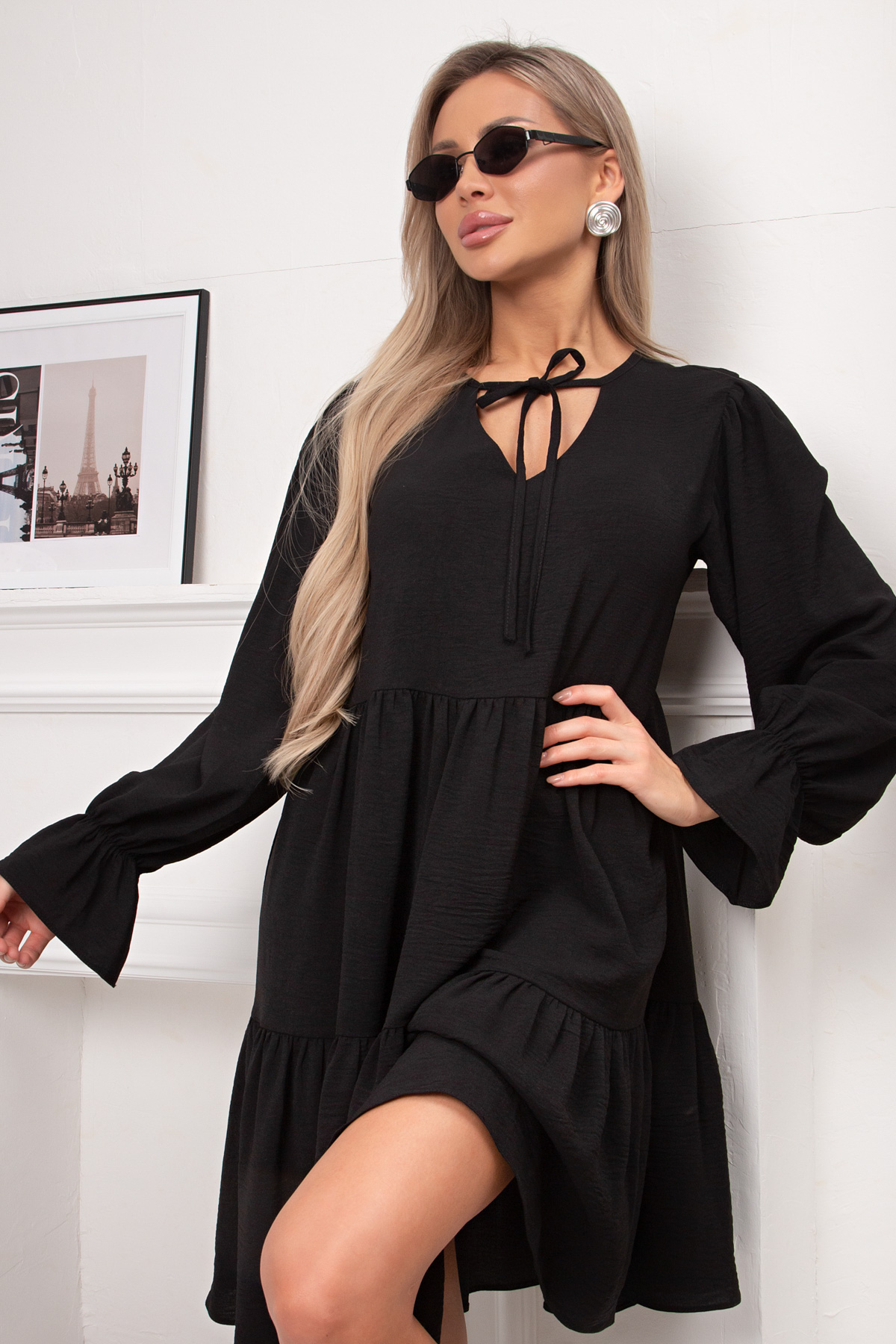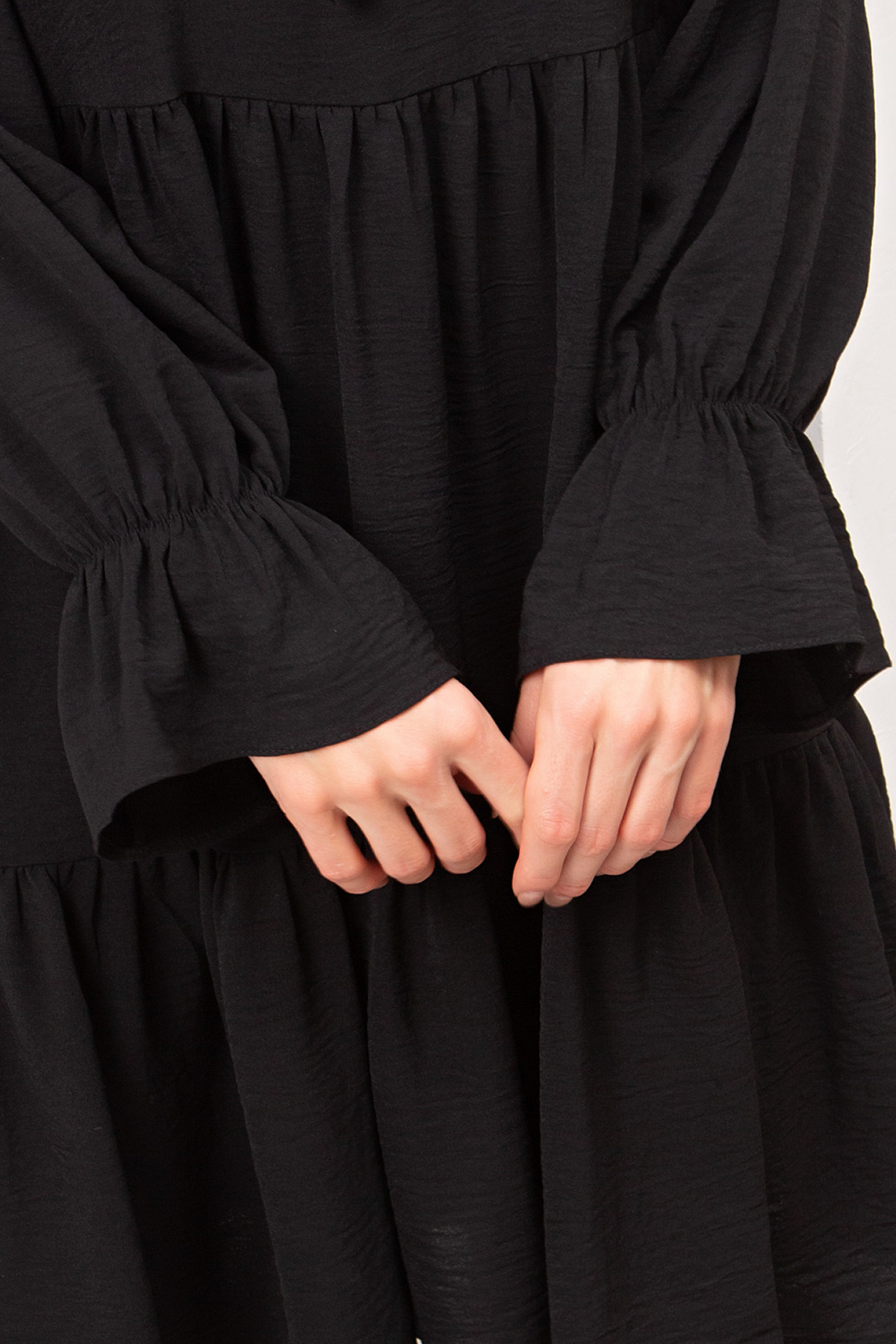 Женственное платье А- силуэта выполнено из легкой плательной ткани с эффектом жатки. Длинный втачной рукав, по запястью присобран на резинку. V-образную горловину на внутренней обтачке дополняет тонкая завязка.