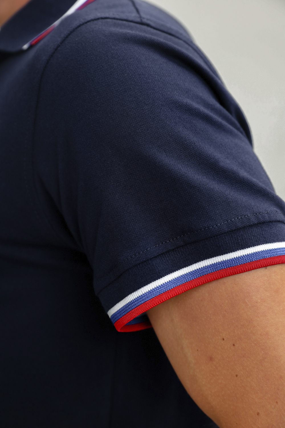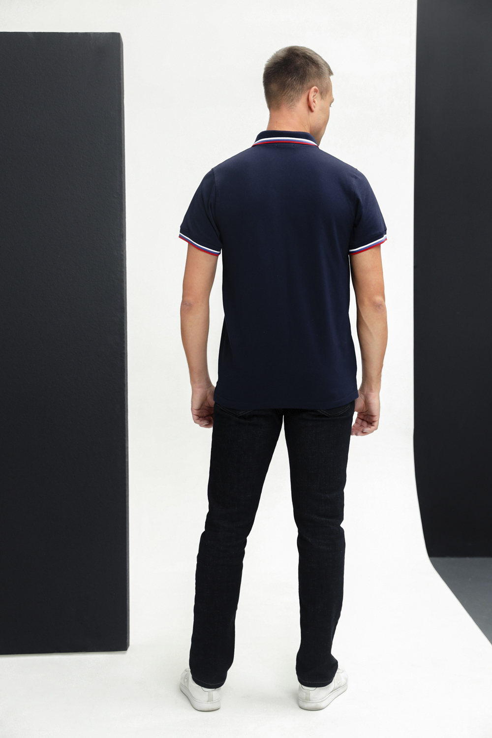 Футболка-поло мужская выполнена из ткани пике качества пенье 95% хлопок 5% лайкра. На поло вязаные воротник и манжеты в цвет ткани с трехцветными контрастными полосками триколор по краю, планка контрастного белого цвета на 3 пуговицах, по бокам разрезы. Футболка удобная, комфортная, идеально подойдет как для дома, так и для прогулок и отдыха.