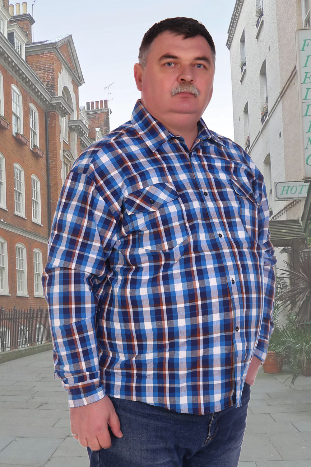 Мужская рубашка в клетку с длинным рукавом. Ткань шотландка 100% хлопок. Модель классического кроя дополнена двумя накладными карманами на груди плюс два клапана с пуговицей. Ворот проложен флизелином с отстрочкой. Данный товар по цвету не подбирается.