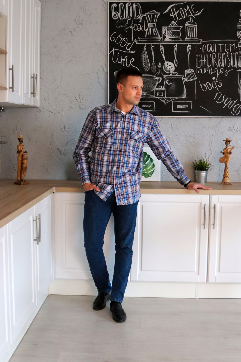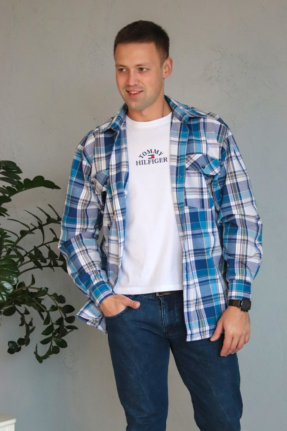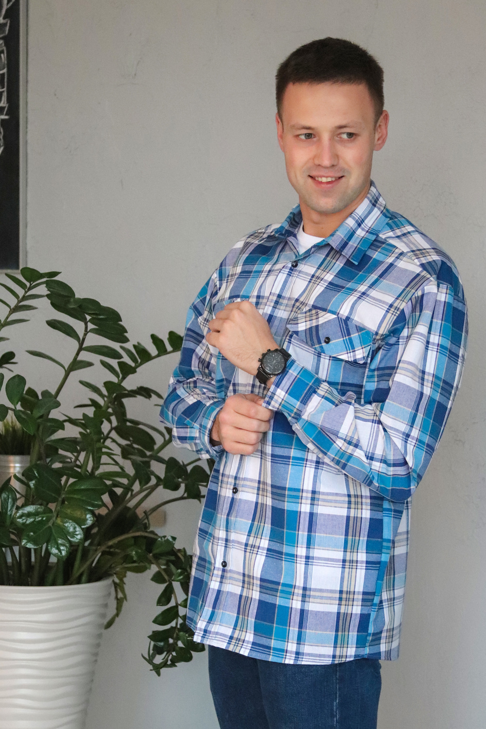 Мужская рубашка в клетку с длинным рукавом. Ткань шотландка 100% хлопок. Модель свободного кроя, дополнена двумя накладными карманами и клапанами с пуговицей. Планка на полочке цельнокроеная, застегивается на пуговицы. Плечо приспущено, рукав до запястья на манжете. Воротник на стойке, проложен флизелином с отстрочкой. Низ изделия застрачивается швом в подгибку при помощи специального приспособления. Внимание! Данный товар по цвету не подбирается.