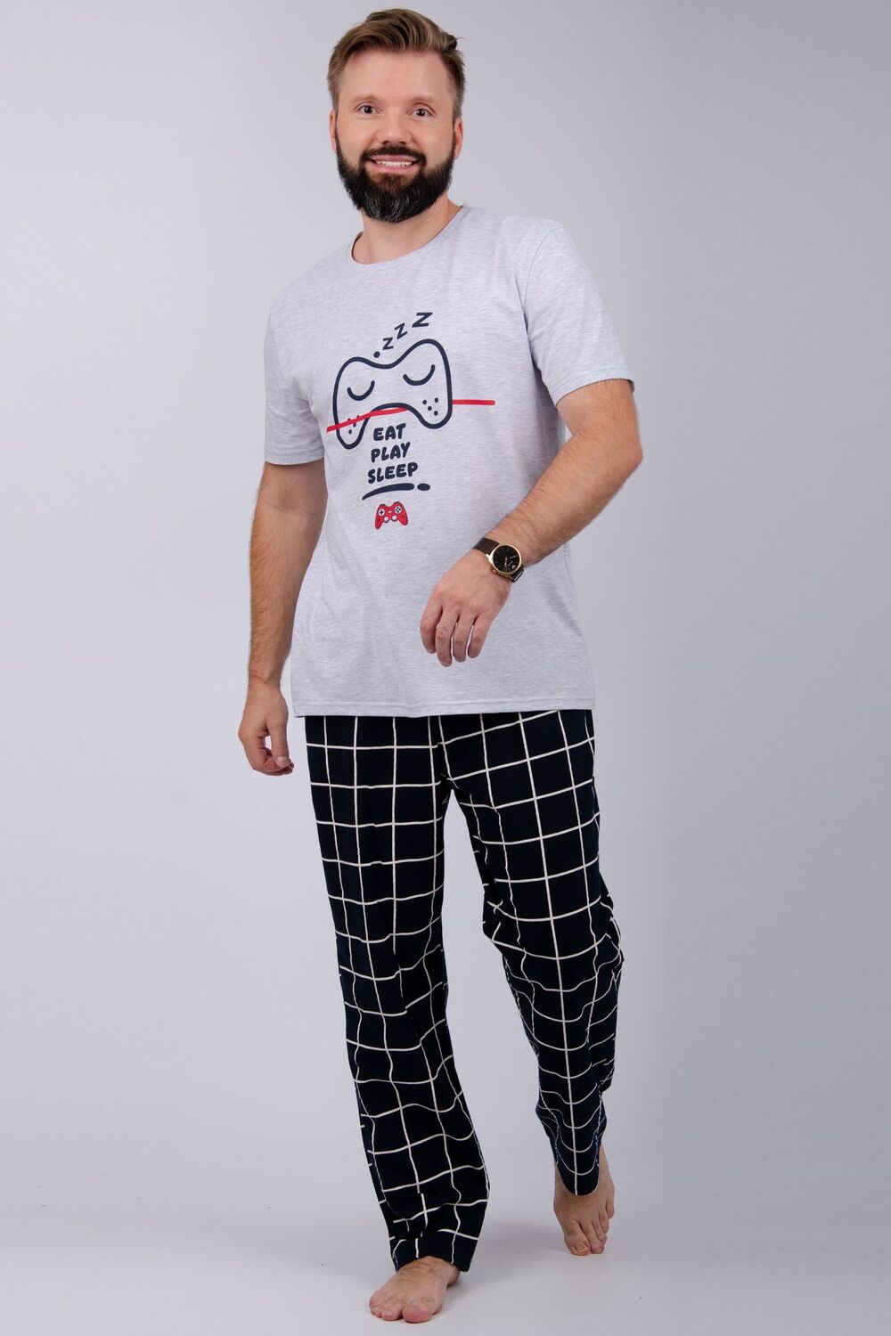 Комфортная мужская пижама из 100% хлопка. Брюки в клетку с боковыми карманами, на эластичном поясе и футболка с коротким рукавом и стильным принтом на полочке.