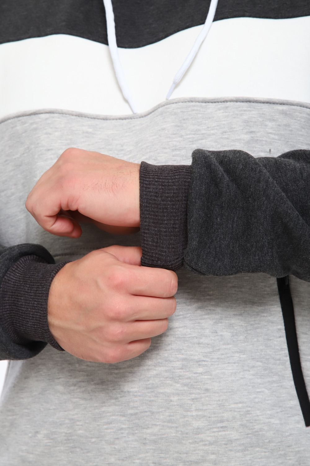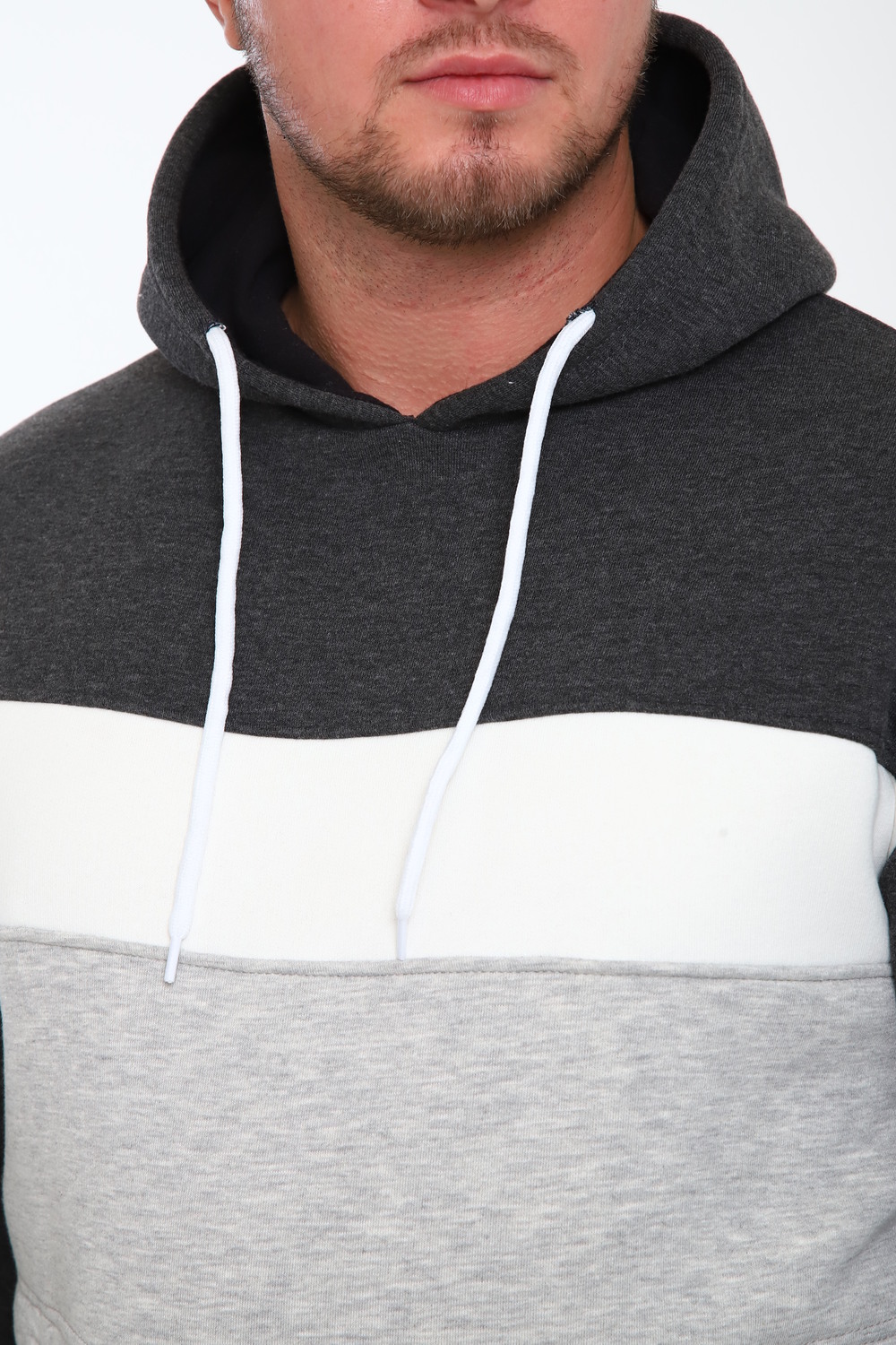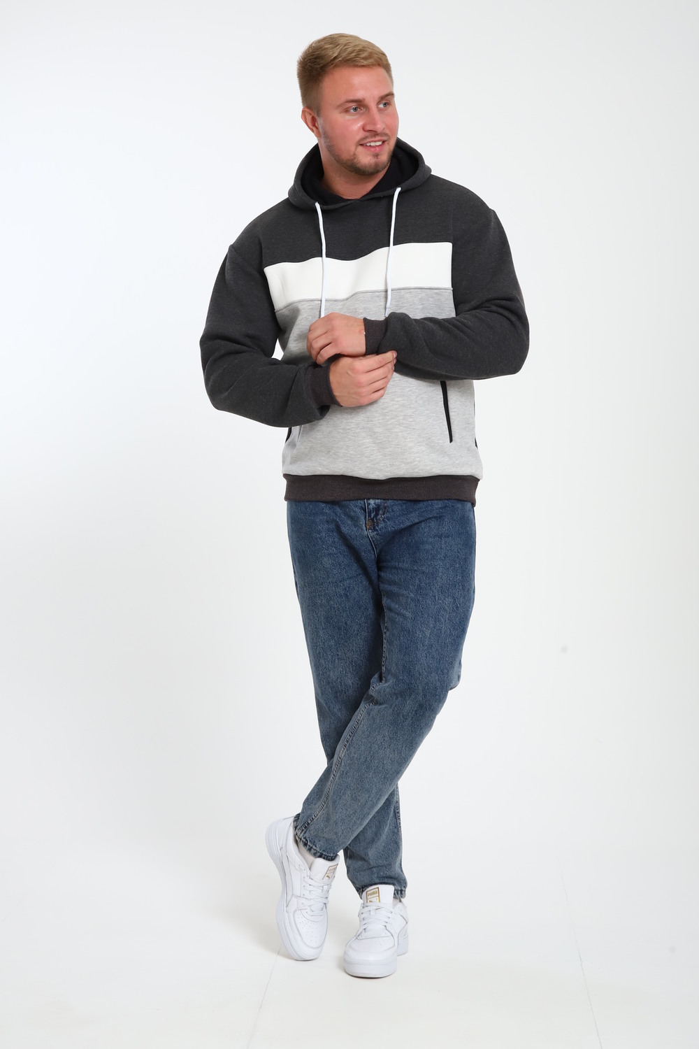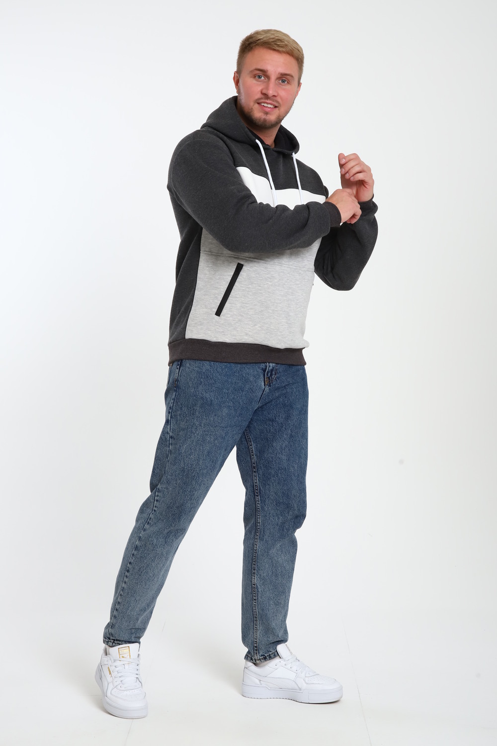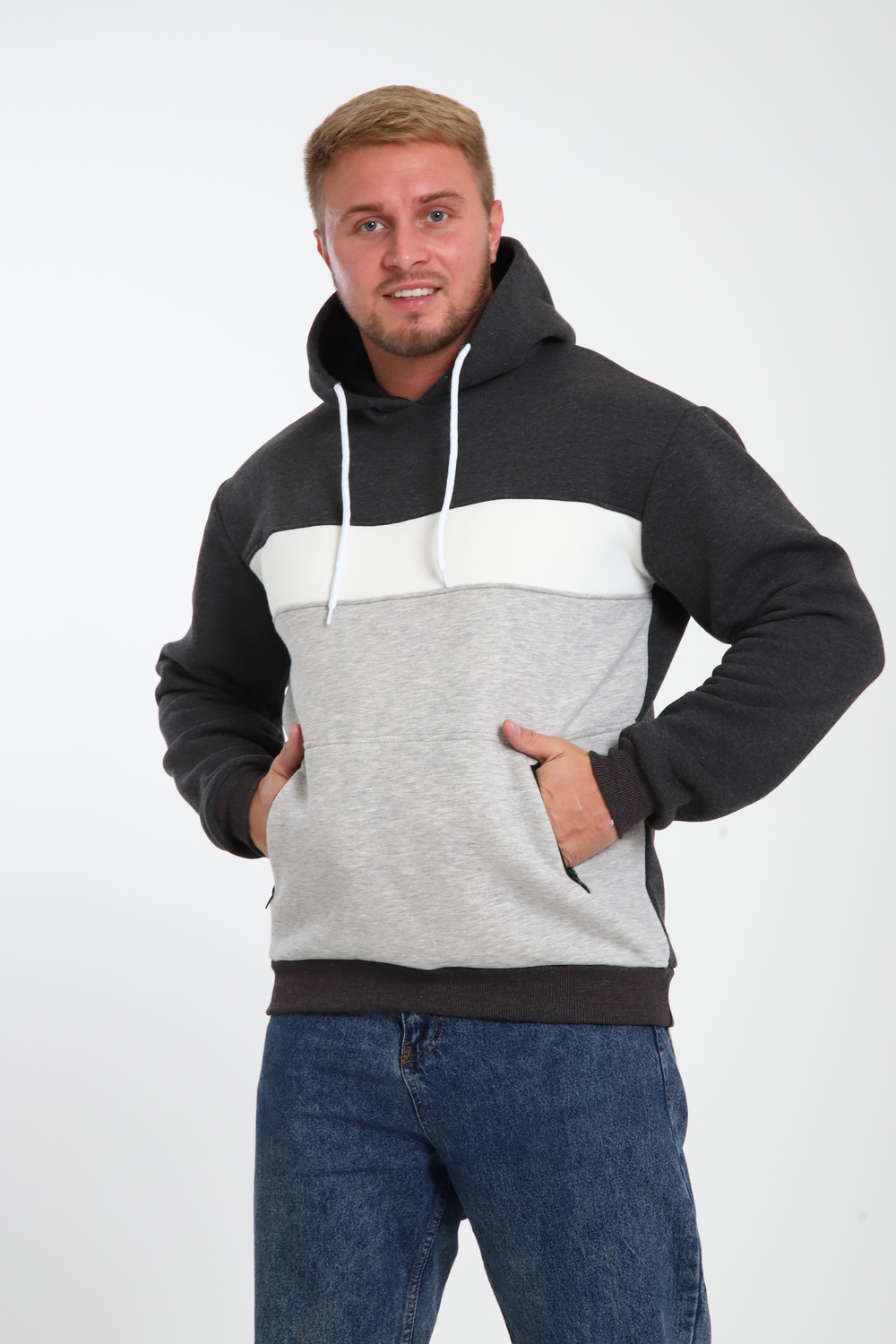 Стильная мужская толстовка с капюшоном выполнена из футера трёх нитки пенье компакт. Она имеет начес, что делает её идеальным выбором для прохладных дней. Капюшон регулируется шнурком. По бокам расположены вместительные карманы на молнии (кенгуру). Доступна в нескольких базовых расцветках с контрастными вставками по типу колор-блок. Первая стирка с изнаночной стороны при 30 градусах. При первой стирке ворс начеса полиняет. Это нормально.