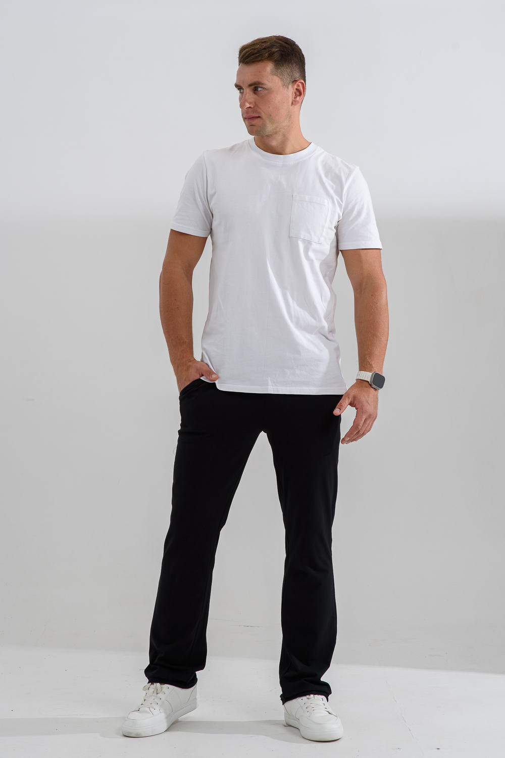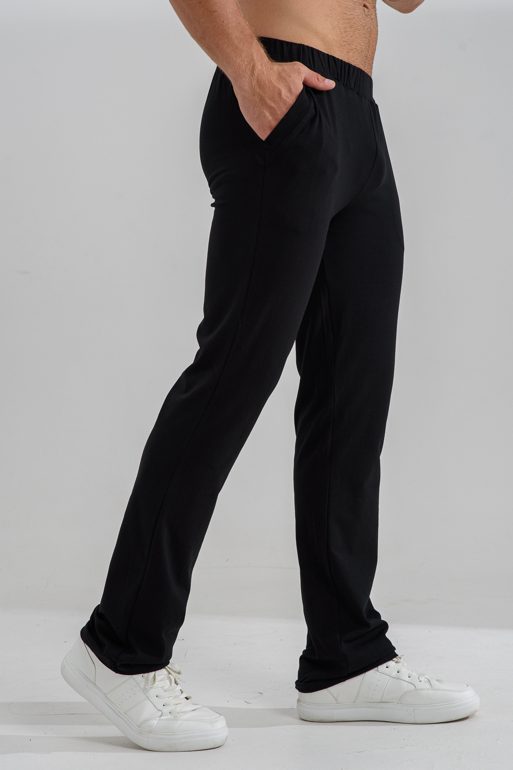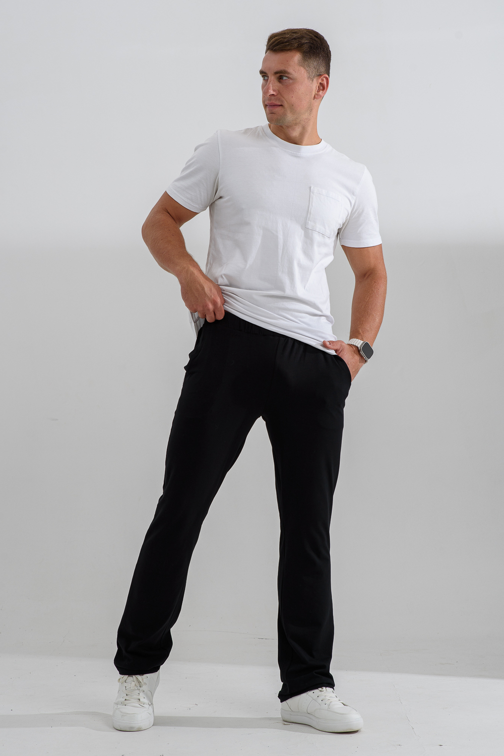 Мужское трико из кулирки с лайкрой. Классический покрой, карманы по бокам, однотонный темный дизайн, пояс на резинке. Размеры от 48 до 62.
