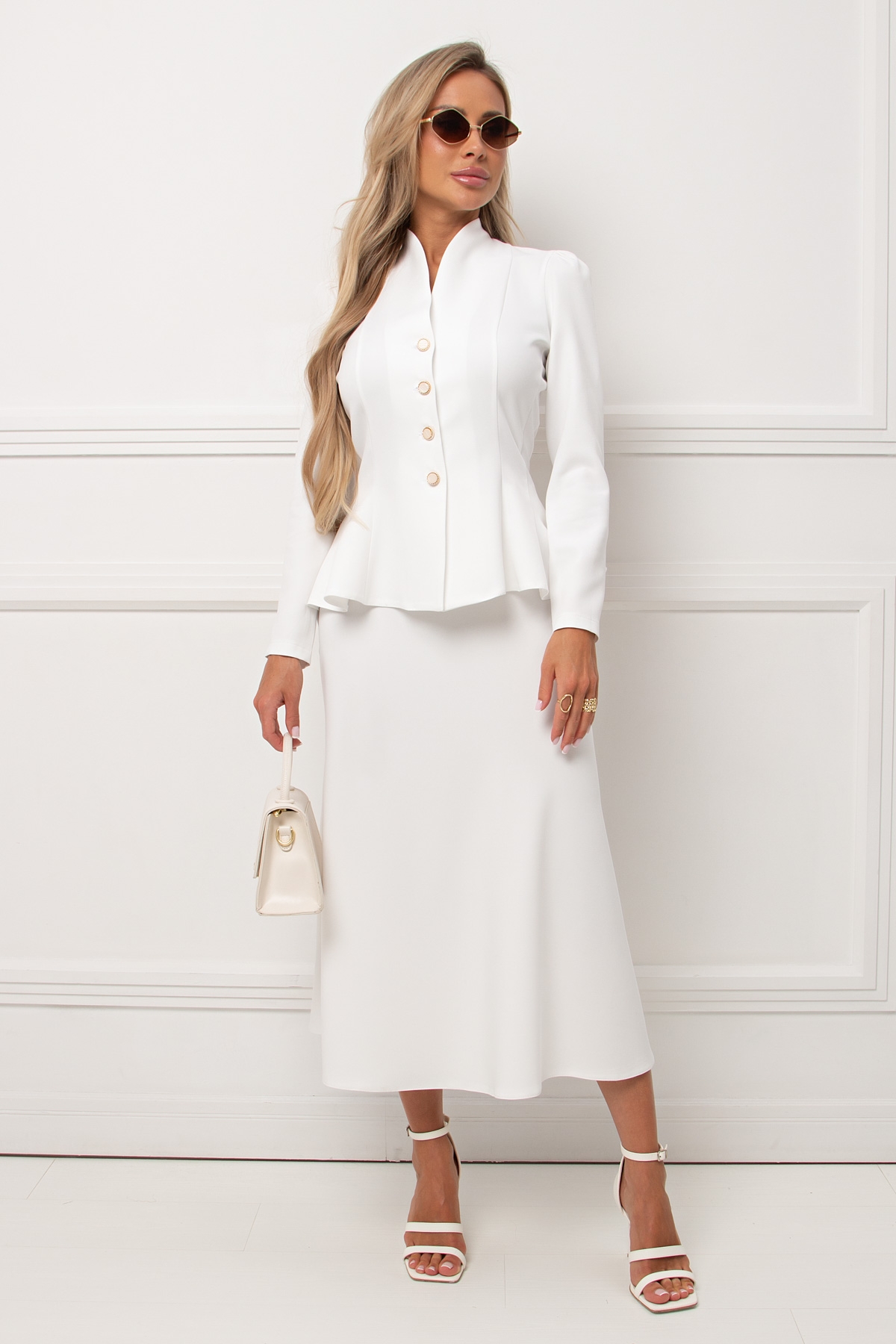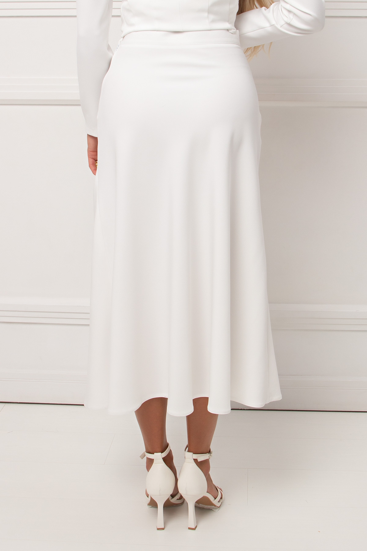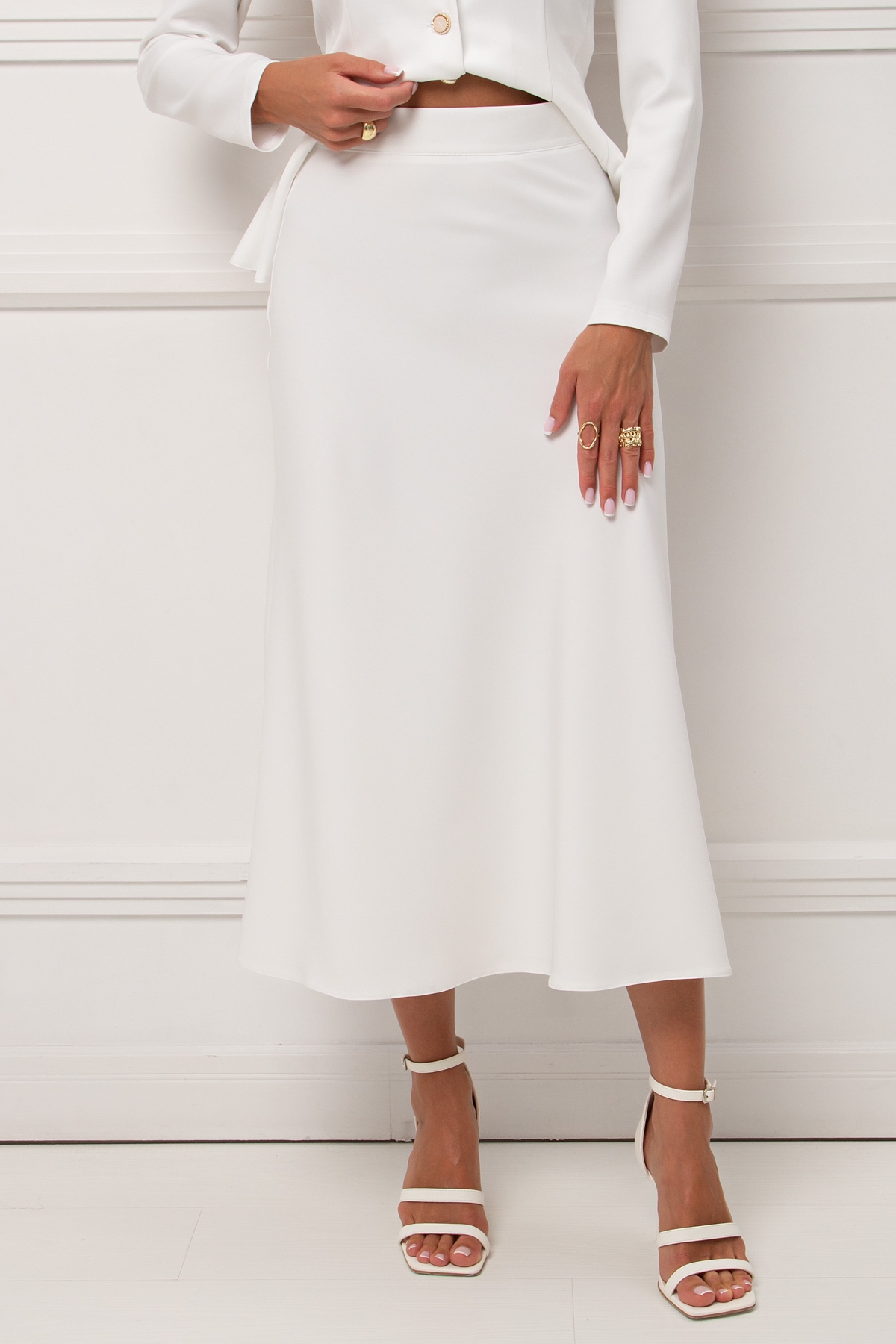 Стильная расклешенная юбка. Верх дополнен втачным поясом. Застежка на пуговицу и потайную молнию расположена в боковом шве. Подол прямой, без разрезов. Благодаря своему крою, юбка прекрасно скрывает недостатки в области бедер. Модель на подкладке. Рекомендуемая стирка при t не более 30°. Длина изделия: 80 см Рост фотомодели: 168 см Размер фотомодели: 42 Ткань: Плательно - костюмная Подклад: 100% полиэстер