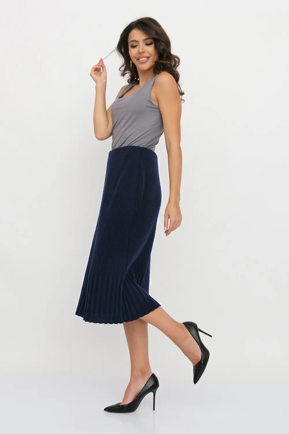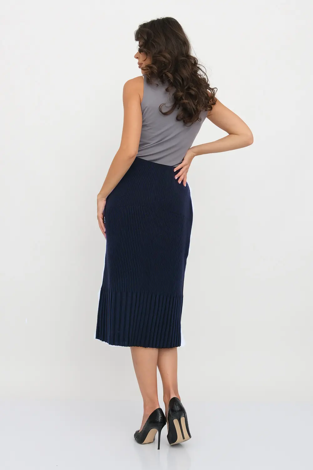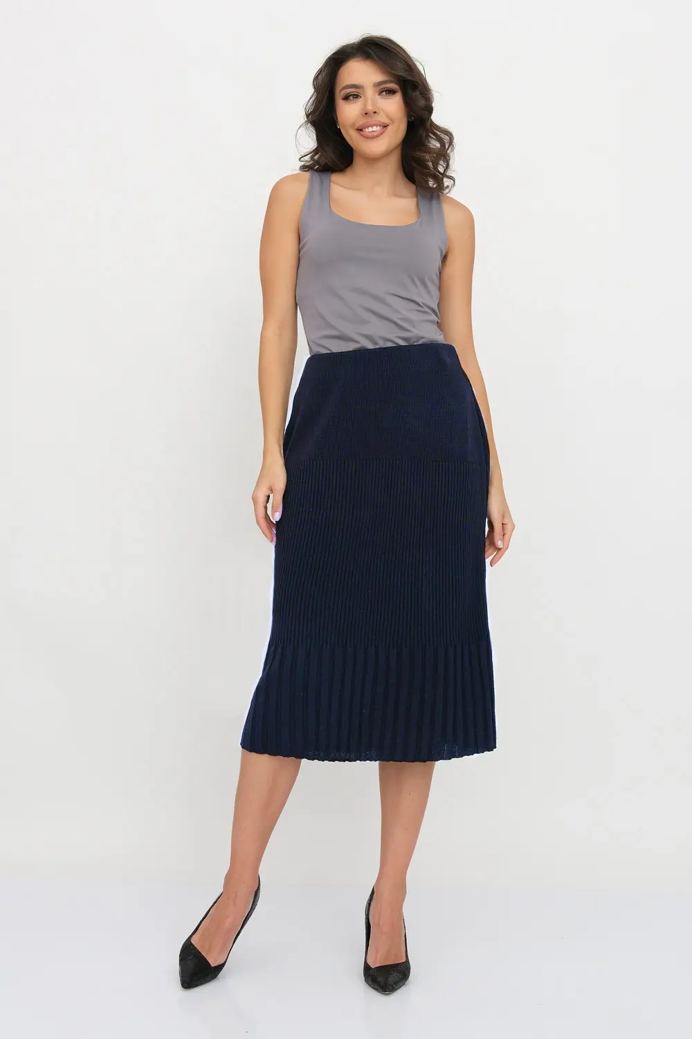 Классическая юбка полуприлегающего силуэта. Переплетение-лапша от узкой по бедрам до широкой по низу изделия. В пояс горизонтально проложена эластичная резинка.