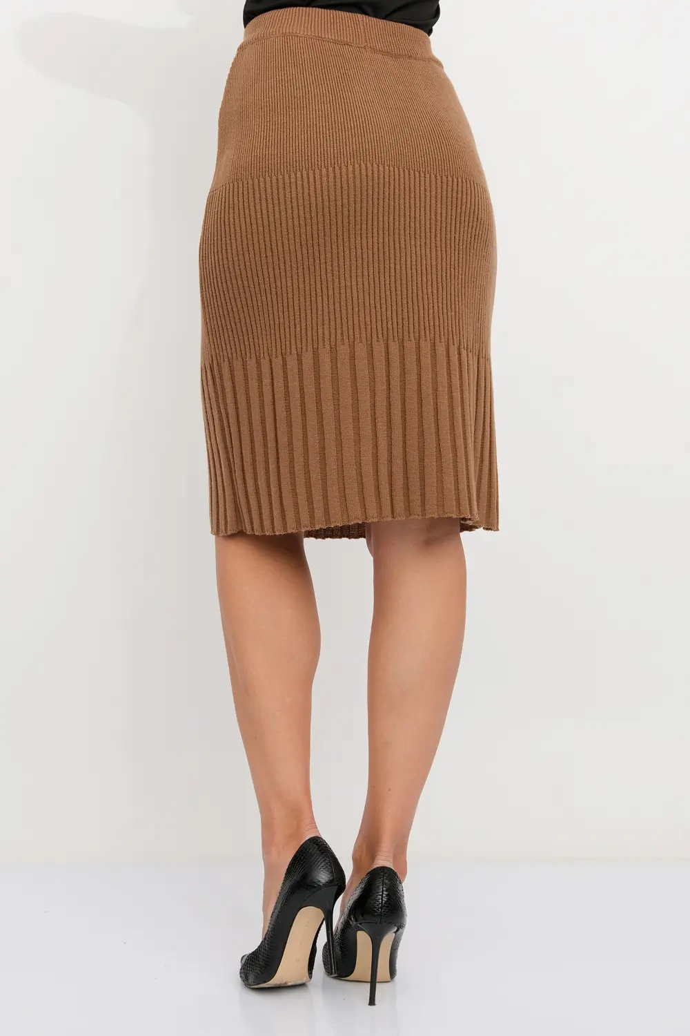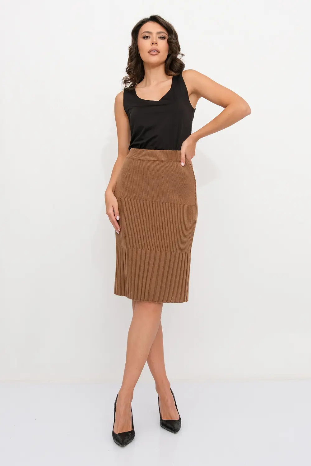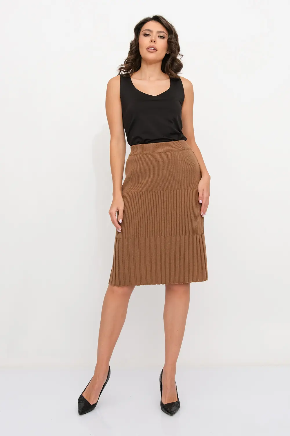 Классическая юбка полуприлегающего силуэта. Переплетение-лапша от узкой по бедрам до широкой по низу изделия. В пояс горизонтально проложена эластичная резинка.