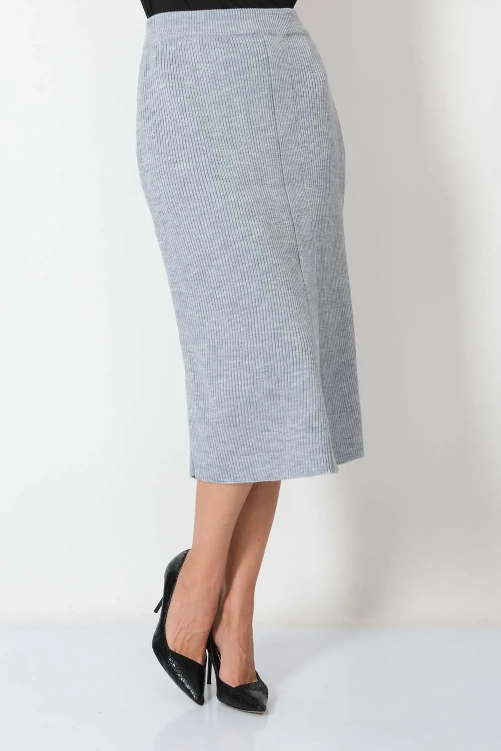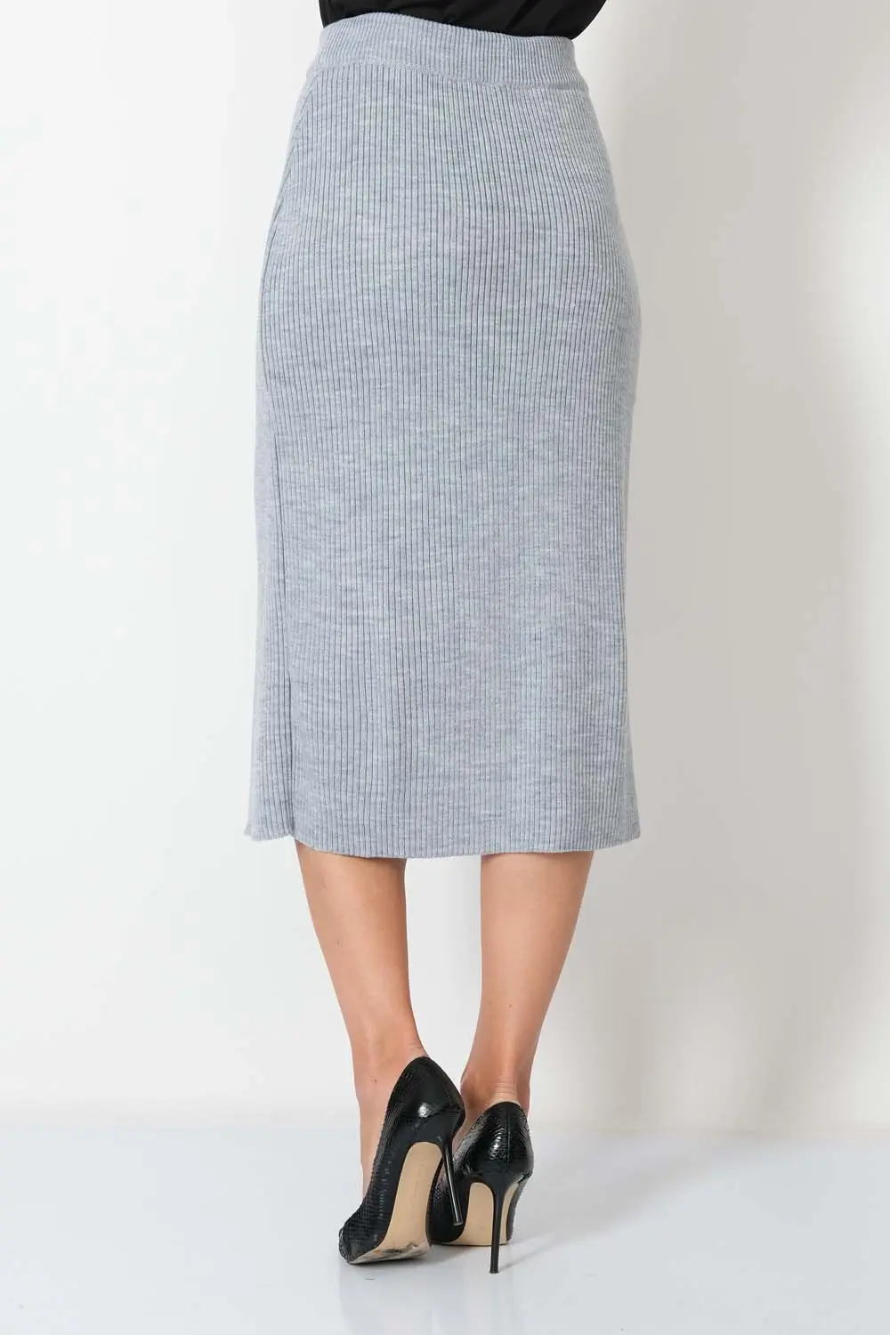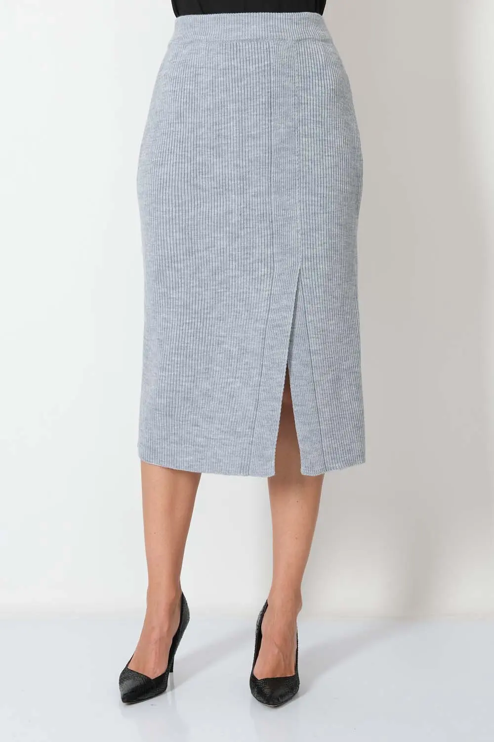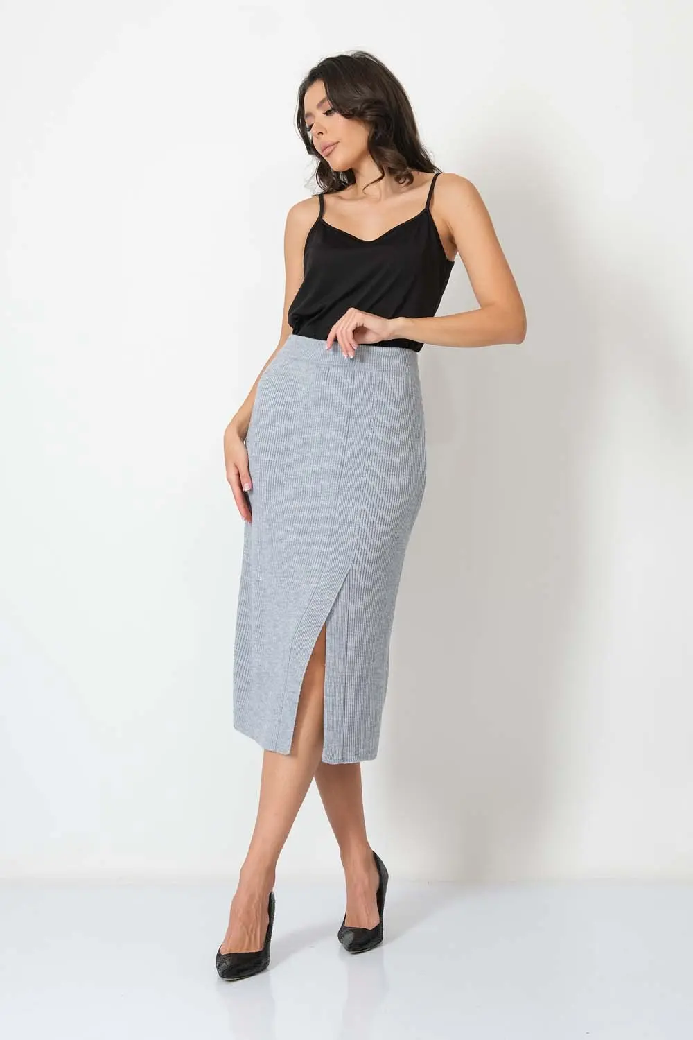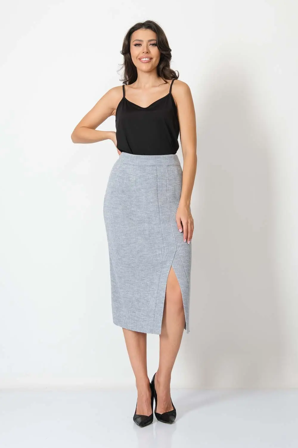 Классическая юбка полуприлегающего силуэта. В пояс горизонтально проложена эластичная резинка. На переднем полотне изделия элегантная шлица.