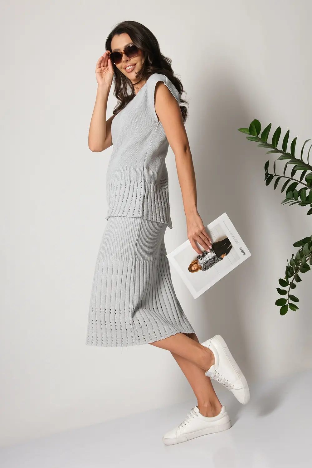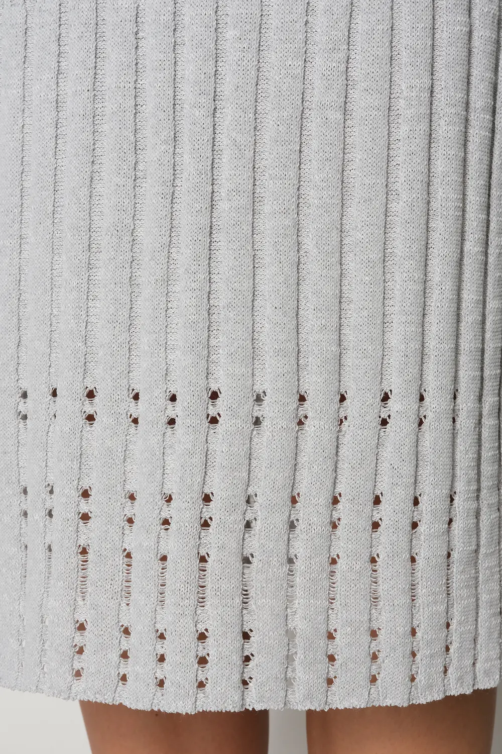 Классическая юбка полуприлегающего силуэта. Переплетение-лапша от узкой по бедрам до широкой с эффектом перфорации по низу изделия . В пояс горизонтально проложена эластичная резинка. Юбку можно носить в комплекте с джемпером И 023, выполненным аналогичным переплетением и узором.