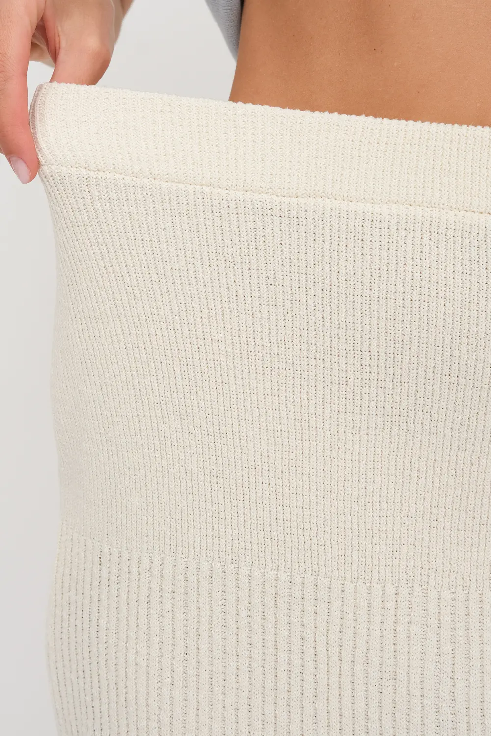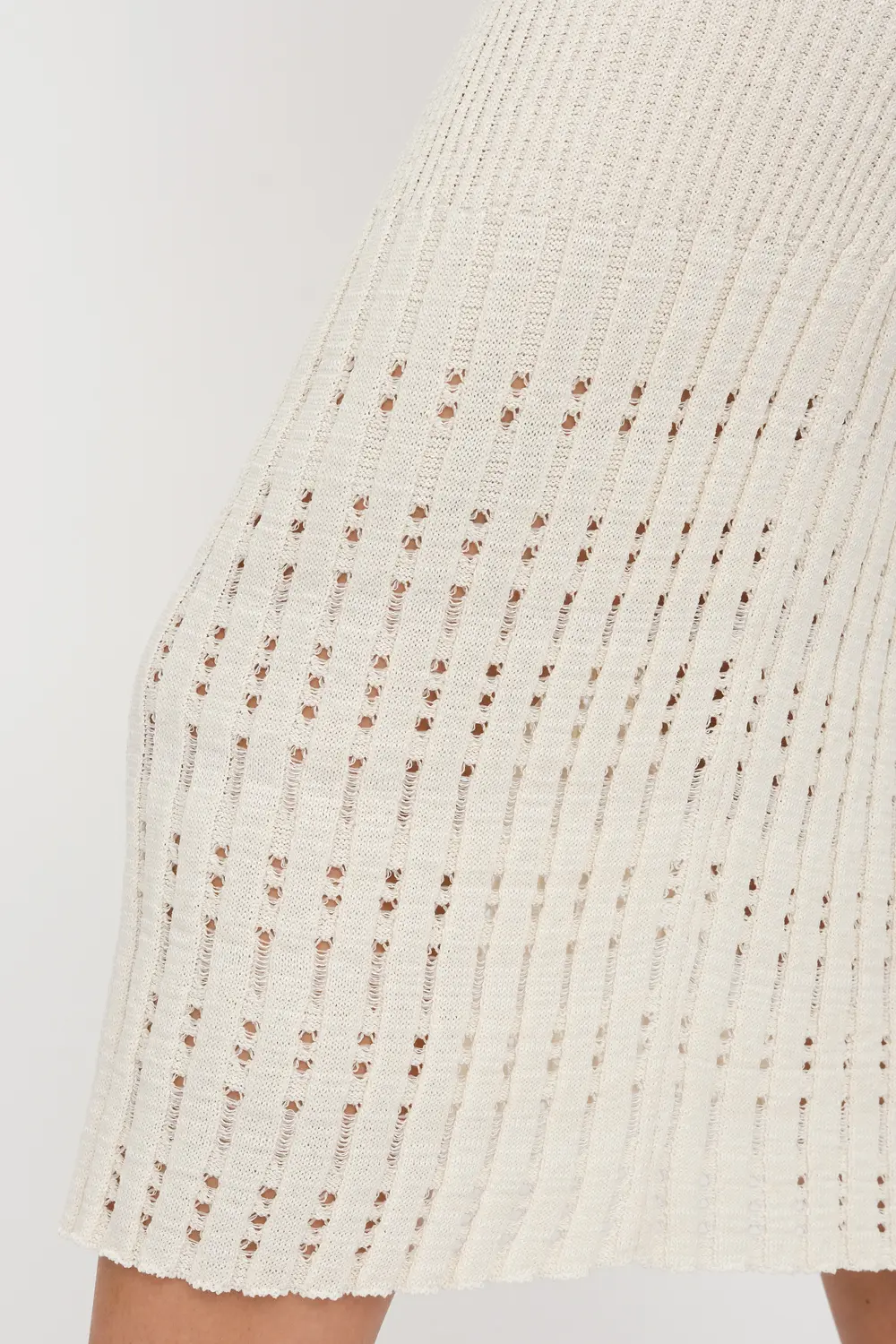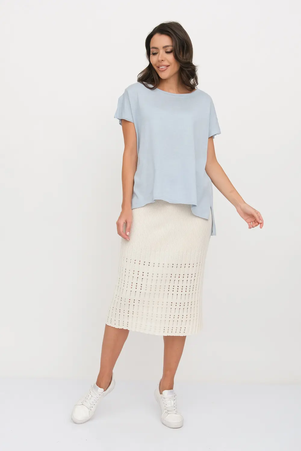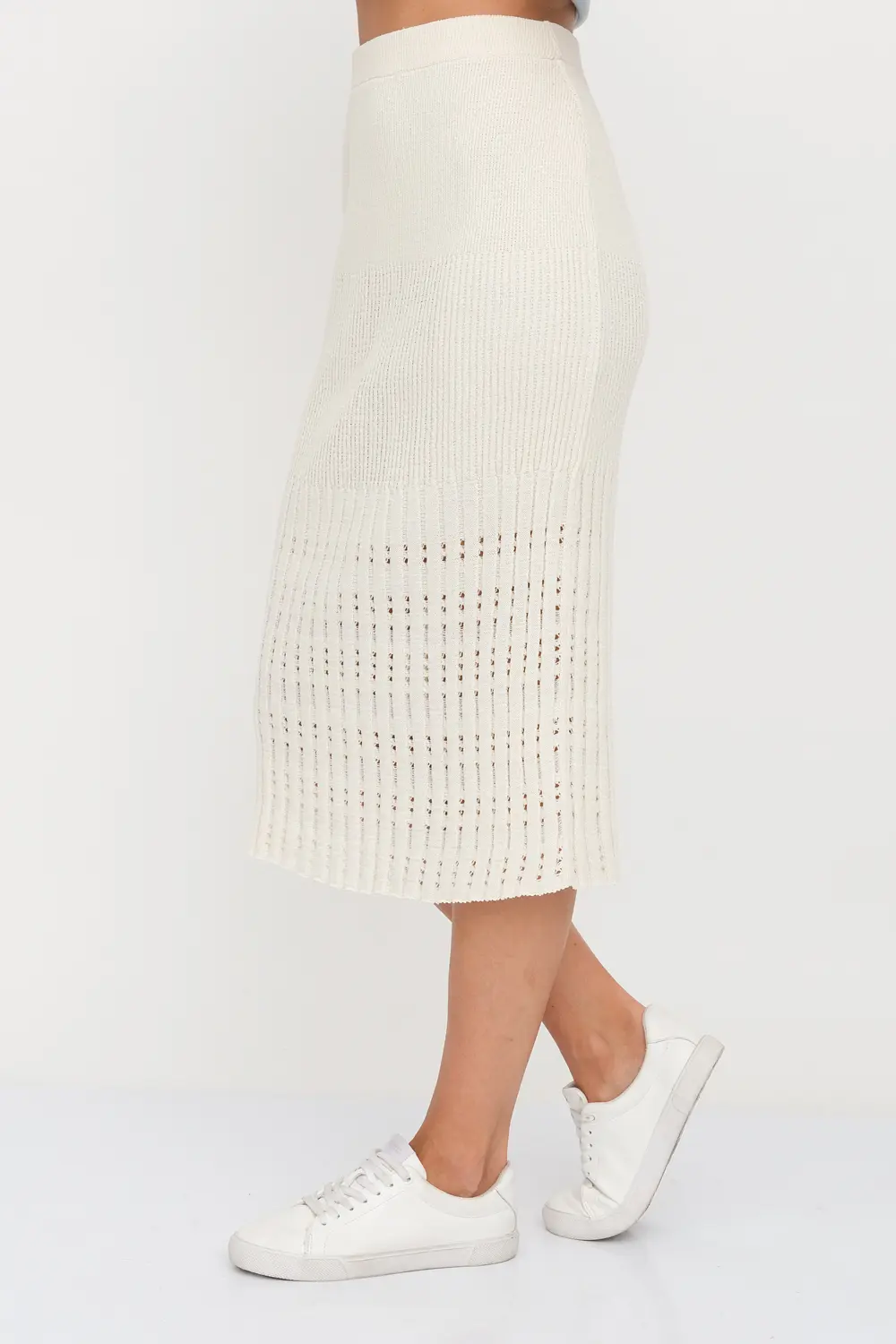 Классическая юбка прилегающего силуэта. Переплетение-лапша от узкой по бедрам до широкой с эффектом перфорации по низу изделия . В пояс горизонтально проложена эластичная резинка. Юбку можно носить в комплекте с джемпером И 023, выполненным аналогичным переплетением и узором.