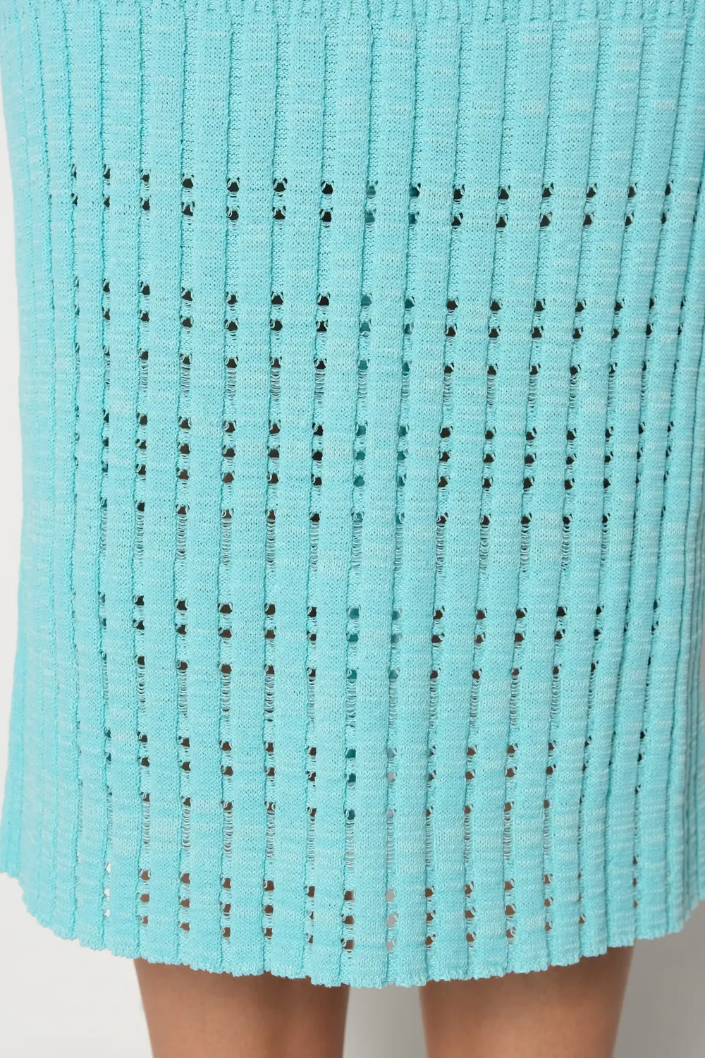 Классическая юбка прилегающего силуэта. Переплетение-лапша от узкой по бедрам до широкой с эффектом перфорации по низу изделия . В пояс горизонтально проложена эластичная резинка. Юбку можно носить в комплекте с джемпером И 023, выполненным аналогичным переплетением и узором.