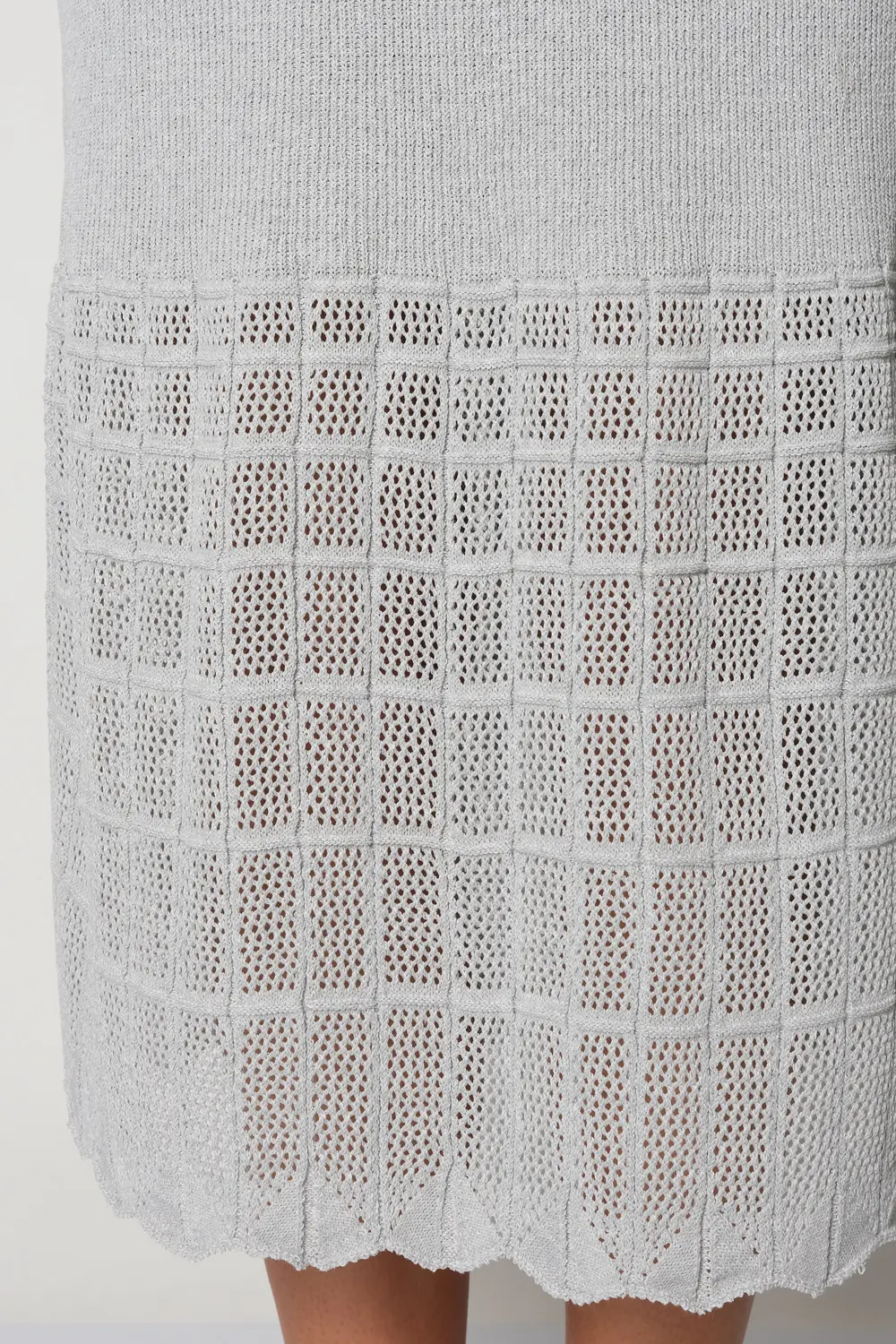 Классическая юбка полуприлегающего силуэта. Ширина переплетения-лапша увеличивается от пояса до колена, нижняя треть юбки выволнена ажурным переплетением. В пояс горизонтально проложена эластичная резинка. Юбку можно носить в комплекте с джемпером И 024, выполненным аналогичным переплетением и узором.