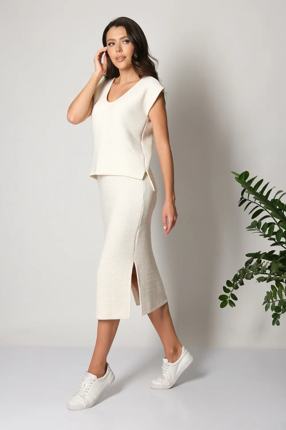Классическая юбка прилегающего силуэта с двумя разрезами по бокам. Можно носить в комплекте с джемпером И 026.