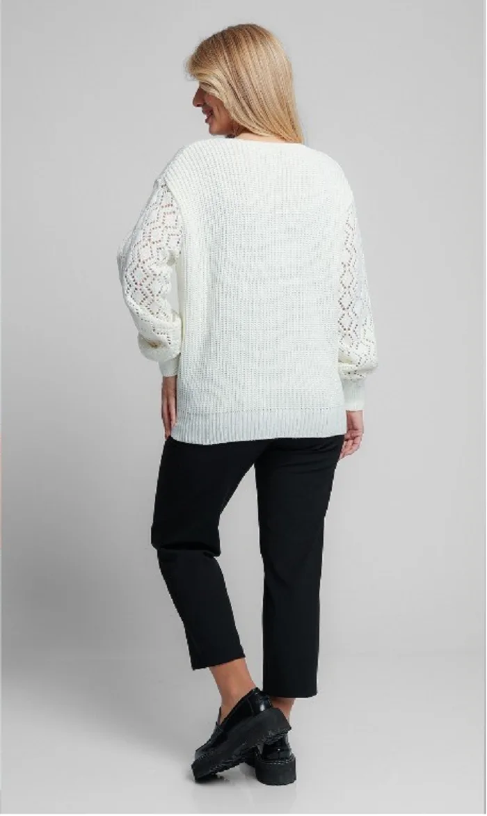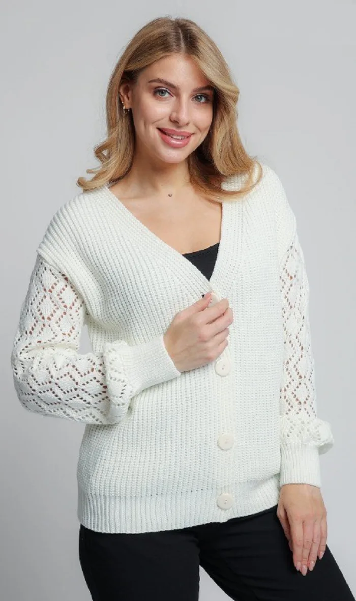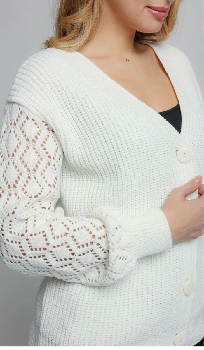 Женский вязаный жакет свободного силуэта. V-образный вырез горловины. Длинные рукава с приспущенным плечом выполнены ажурной вязкой.