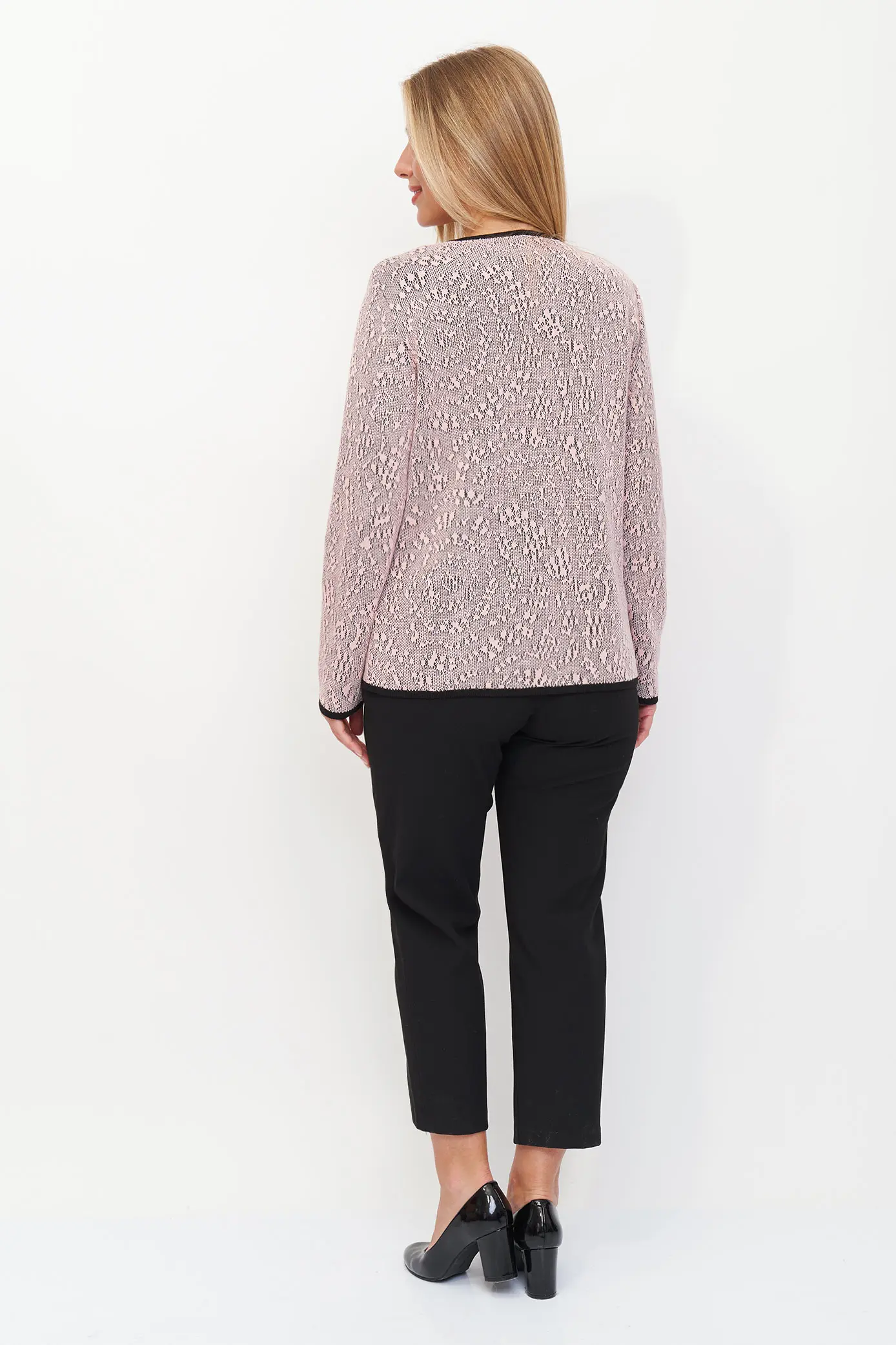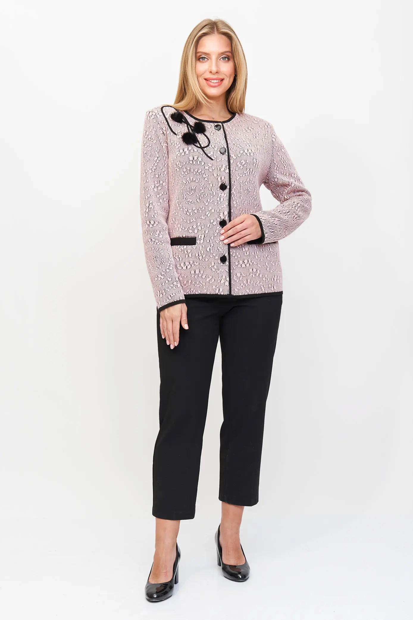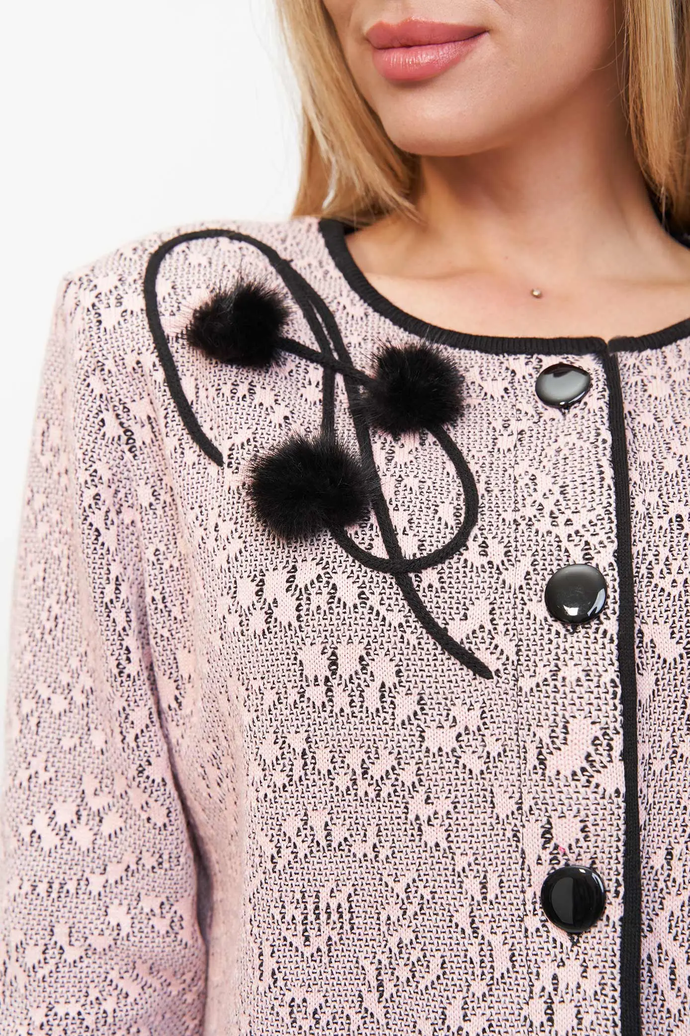 Женский вязаный жакет полуприлегающего силуэта на пуговицах. Трикотажный пиджак выполнен из высококачественной пряжи с составом 30% хлопок 70% ПАН. Теплая кофта на пуговицах имеет круглую горловину без воротника, рукава втачные длинные. Длина изделия 62 см, длина рукава 61 см. В трикотажном жакете предусмотрены функциональные прорезные карманы. Вязаный пиджак выполнен жаккардовым переплетением, образующим мерцающий орнамент. Горловина, низ рукавов, низ изделия и вход в карманы обработаны бейкой контрастного цвета. Нарядный жакет украшен элегантным узором из трикотажных шнуров и натурального меха кролика. Эффектный пиджак полуприлегающего силуэта подойдет для любого типа фигуры и составит модный, праздничный образ с любым низом: брюки, джинсы, юбка.