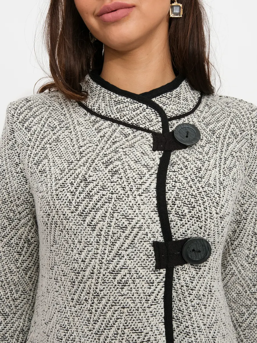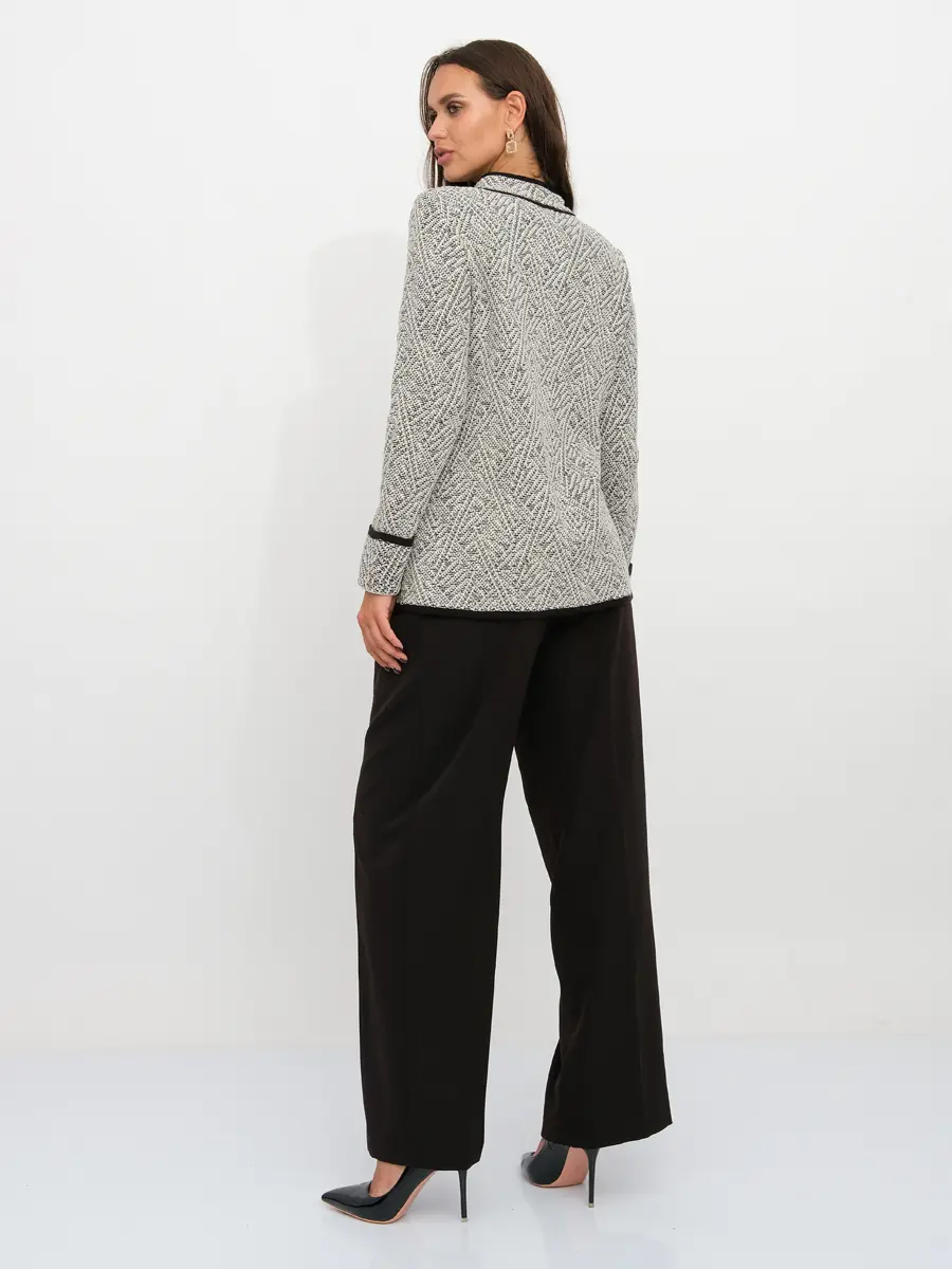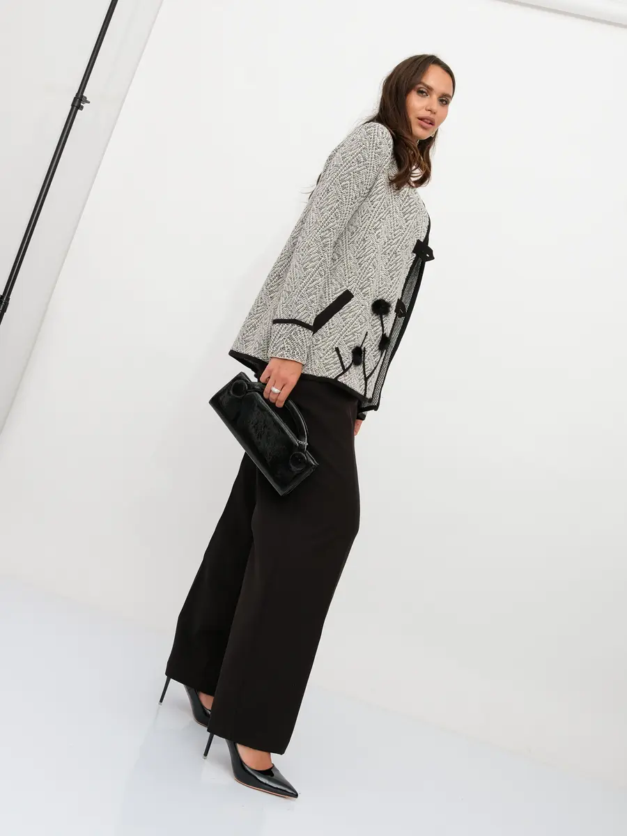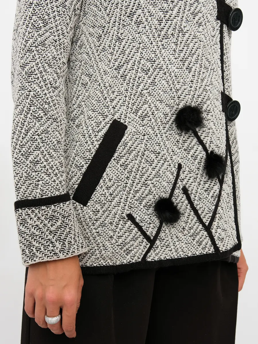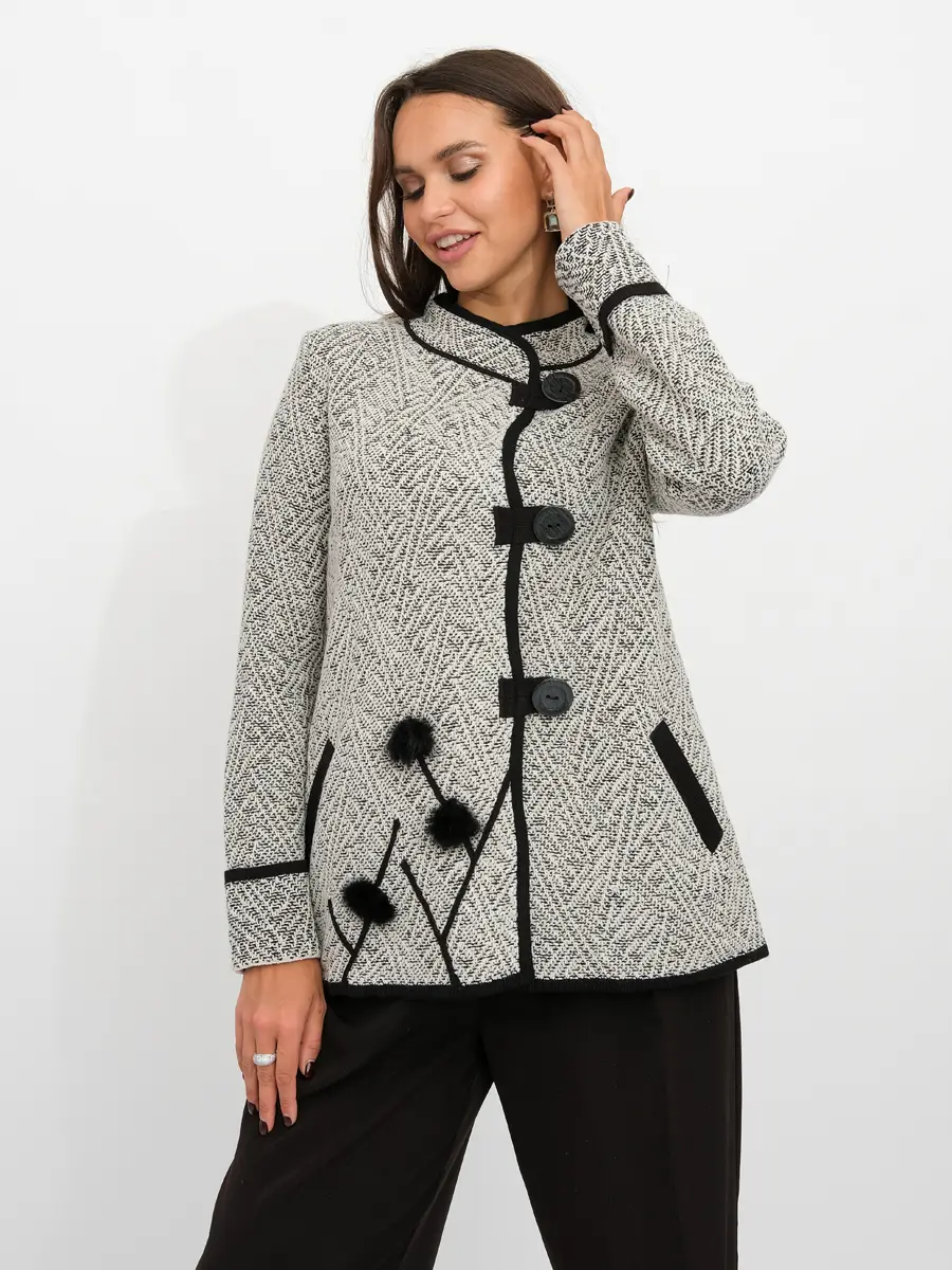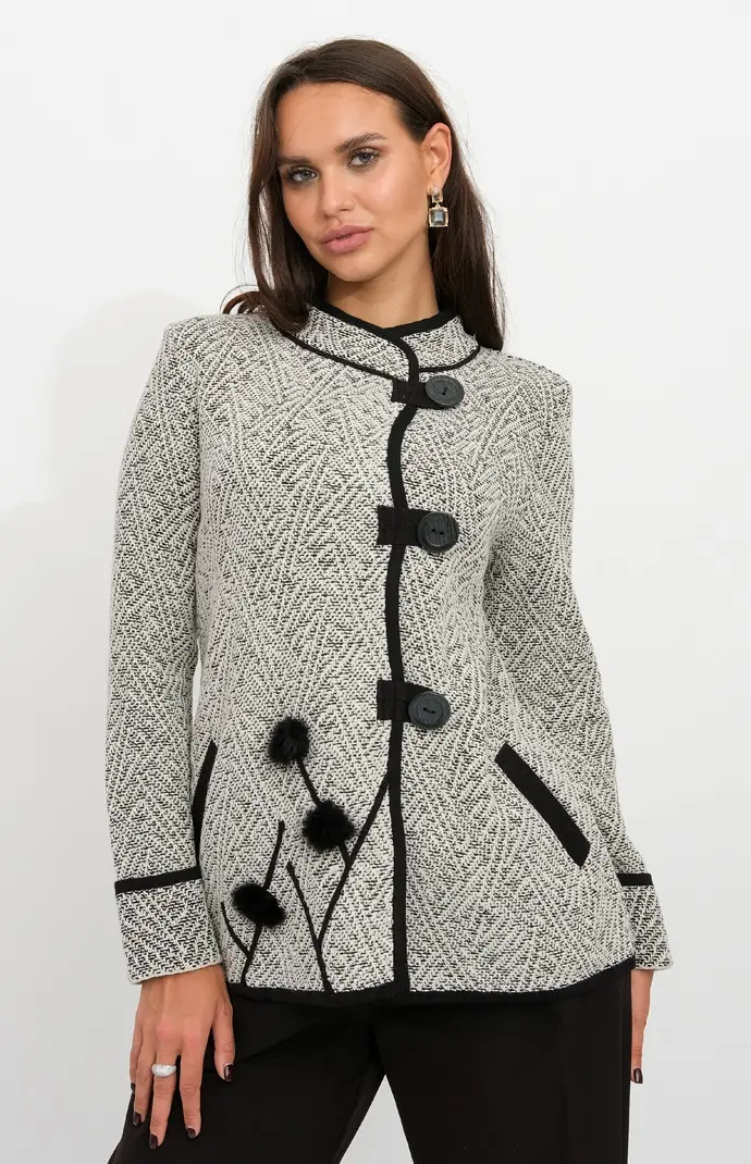 Вязаный женский жакет свободнного силуэта с воротником-стойкой. Рукава втачные длинные. Жакет застегивается на пуговицы и воздушные петли. Два боковых прорезных кармана с листочкой. Жакет выполнен жаккардовым структурным переплетением. На правой полочке внизу расположена декоративная аппликация с мехом.