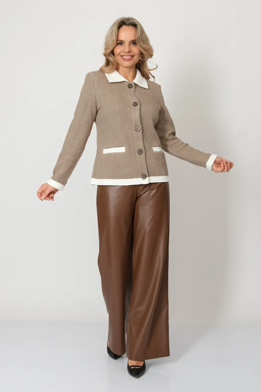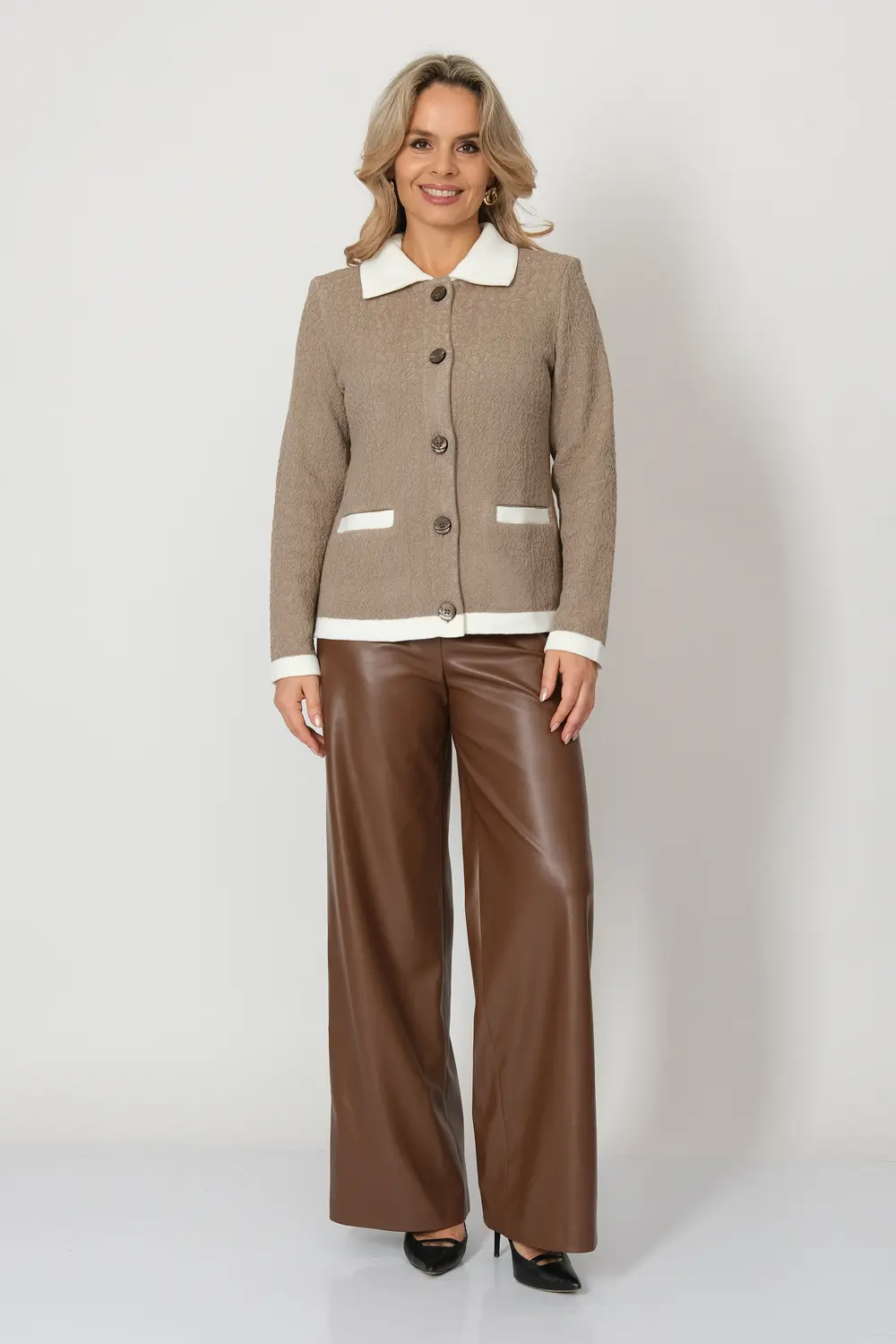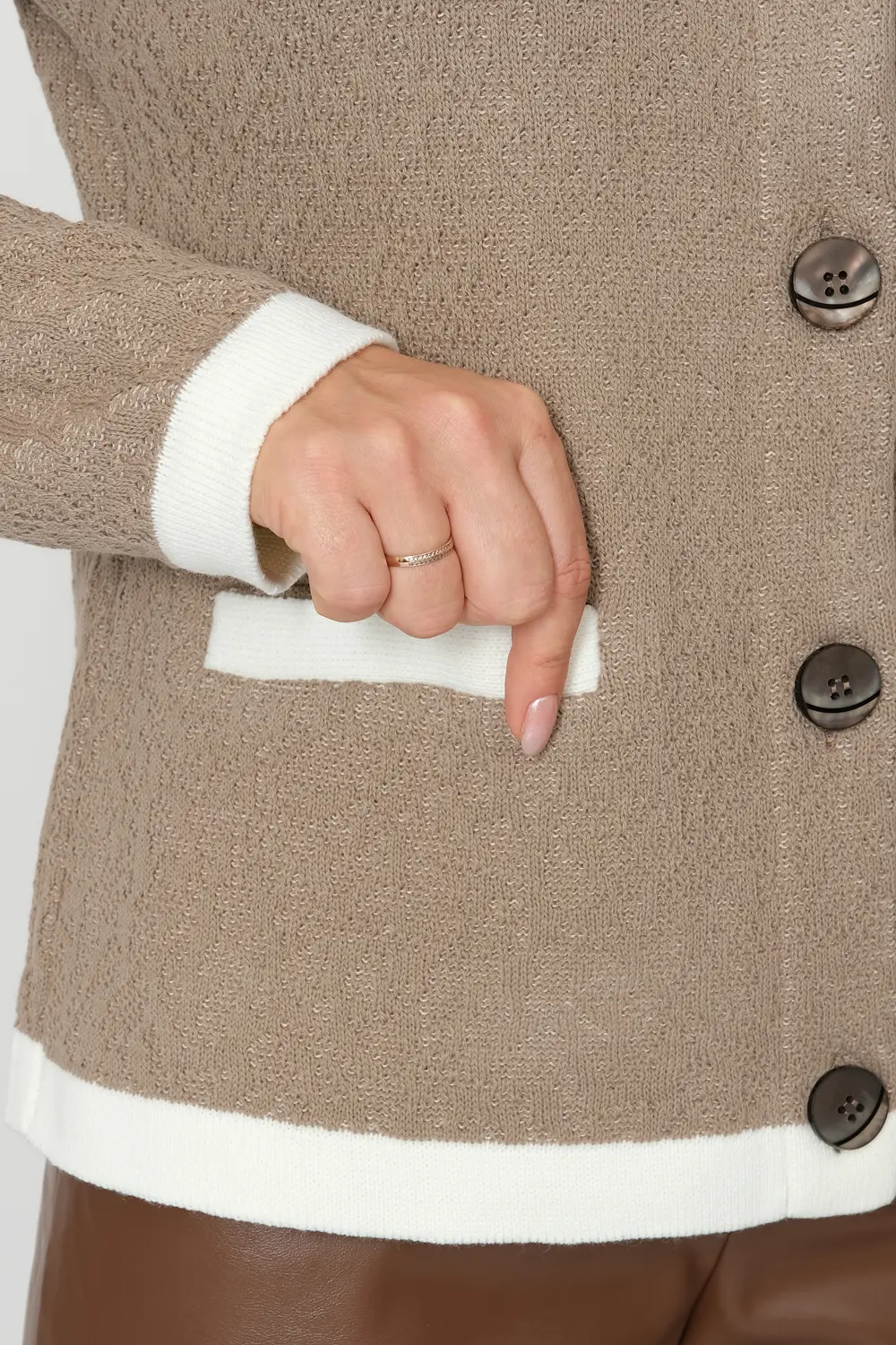 Жакет женский вязаный прямого силуэта с отложным воротником. Трикотажный пиджак выполнен из высококачественной пряжи с составом 30% хлопок 70% ПАН. Кофта на пуговицах имеет длинные втачные рукава и два прорезных кармана с листочкой. Классический жакет застегивается на пуговицы по всей длине. Пиджак оформлен классическим отложным воротником контрастного цвета. Длина изделия 59 см, длина рукава 60 см. Нарядный жакет выполнен жаккардовым переплетением образующим оригинальный рельефный рисунок, имитирующий ажур. Праздничный пиджак прямого силуэта подойдет для любого типа фигуры и составит оригинальный, модный и женственный образ абсолютно с любым низом: юбка, брюки, джинсы.