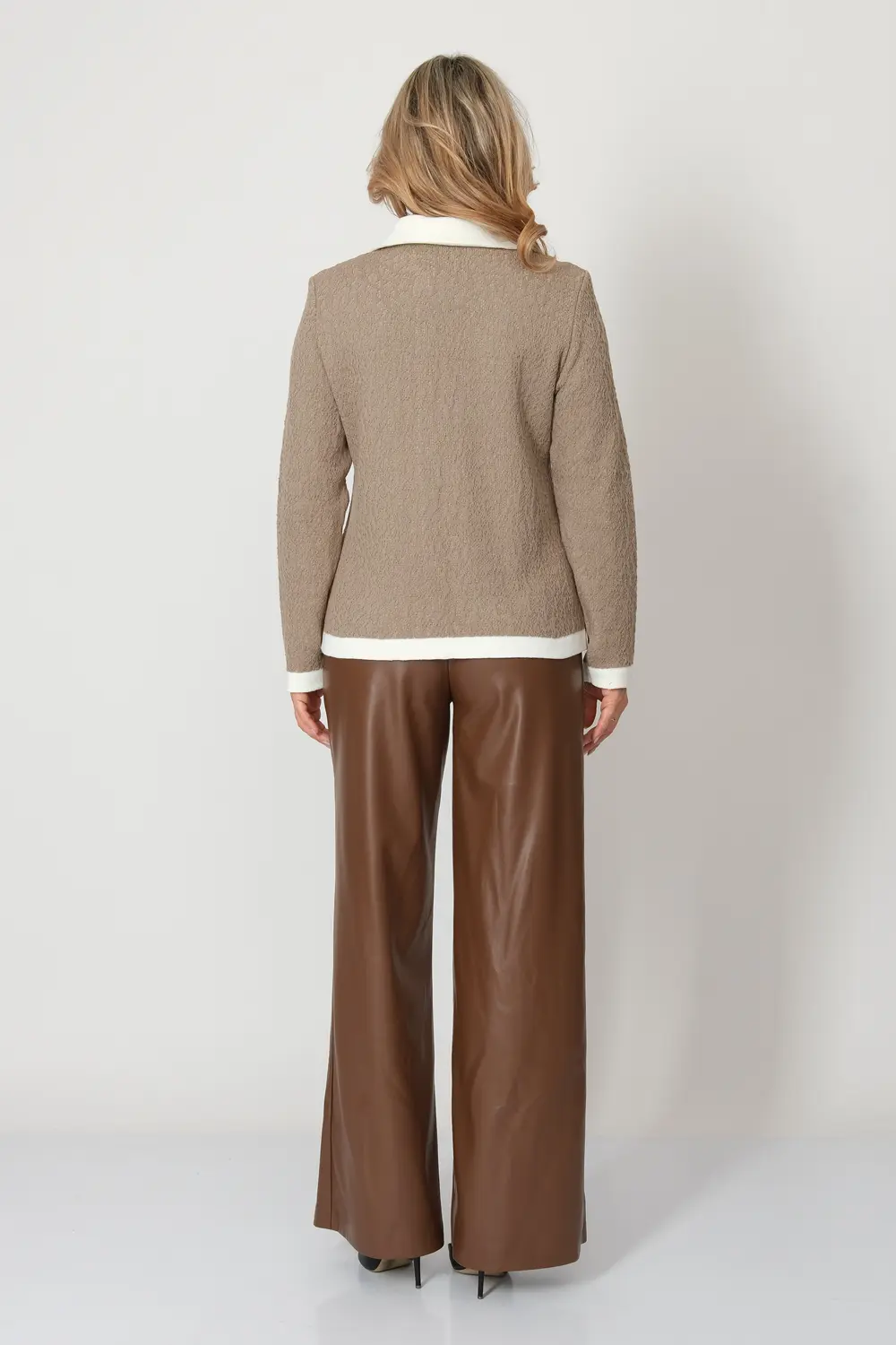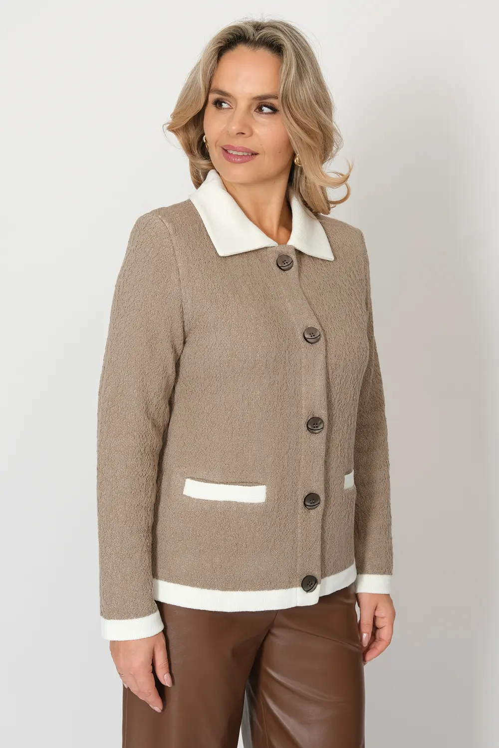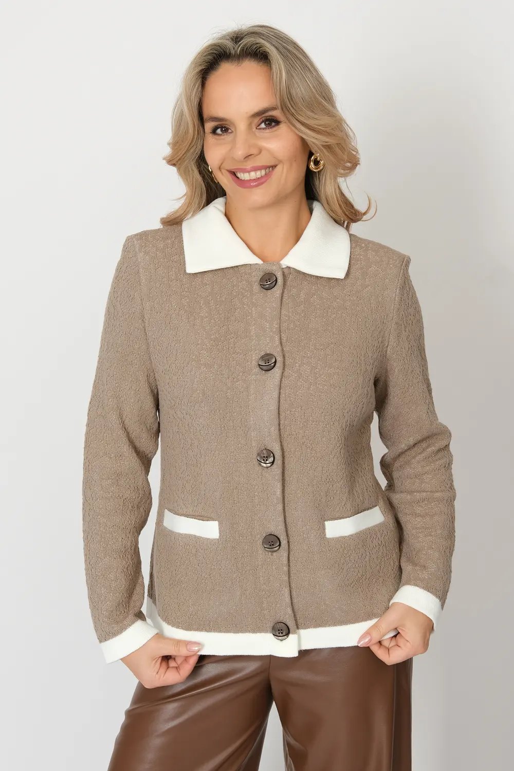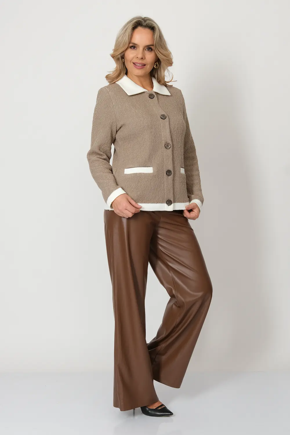 Жакет женский вязаный прямого силуэта с отложным воротником. Трикотажный пиджак выполнен из высококачественной пряжи с составом 30% хлопок 70% ПАН. Кофта на пуговицах имеет длинные втачные рукава и два прорезных кармана с листочкой. Классический жакет застегивается на пуговицы по всей длине. Пиджак оформлен классическим отложным воротником контрастного цвета. Длина изделия 59 см, длина рукава 60 см. Нарядный жакет выполнен жаккардовым переплетением образующим оригинальный рельефный рисунок, имитирующий ажур. Праздничный пиджак прямого силуэта подойдет для любого типа фигуры и составит оригинальный, модный и женственный образ абсолютно с любым низом: юбка, брюки, джинсы.