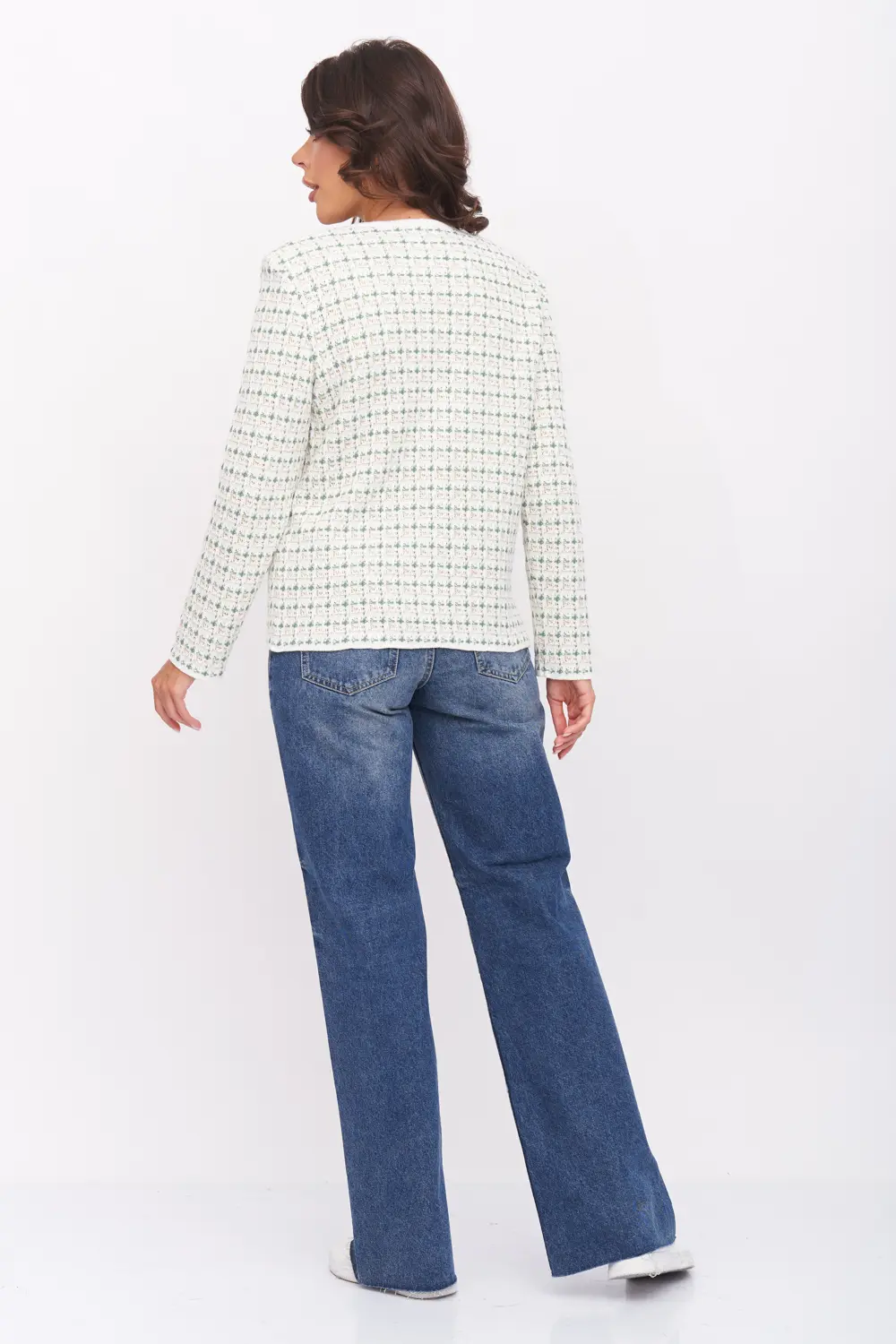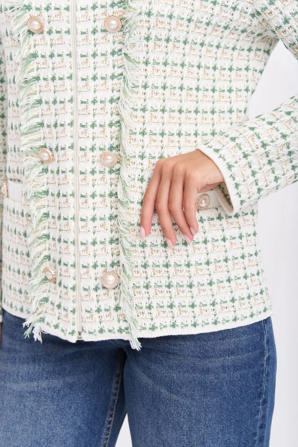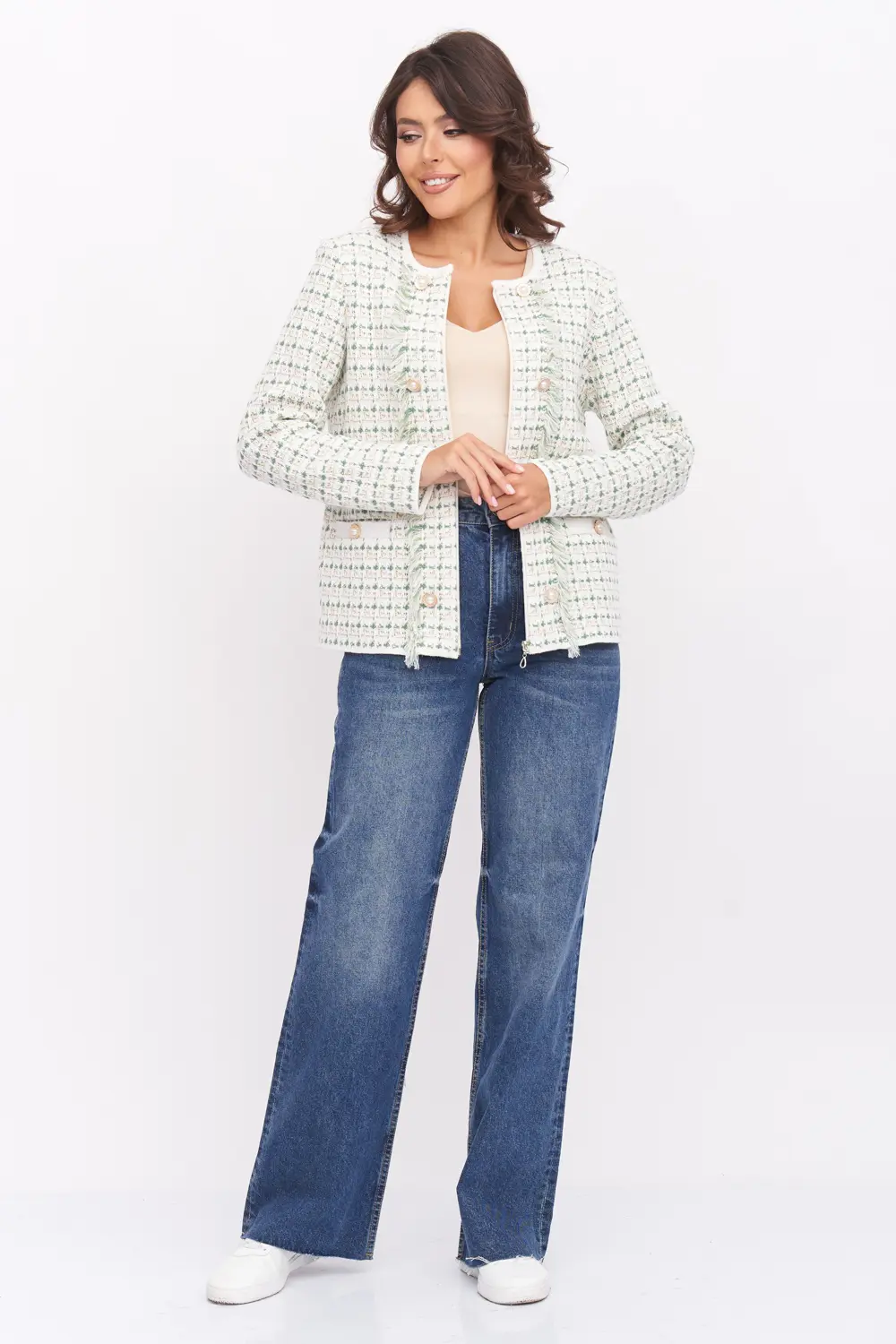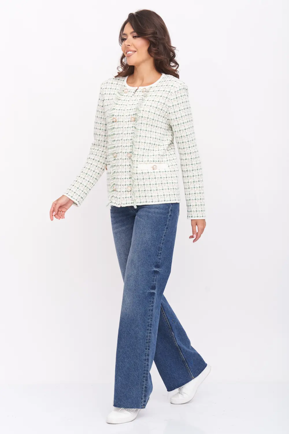 Жакет женский полуприлегающего силуэта с круглой горловиной. Жакет вязаный на молнии. Выполнен жаккардовым, структурным переплетением рисунок клетка.Прорезной карман с листочкой. Жакет выполнен в винтажном стиле, декорирован бахромой и акцентными пуговицами.