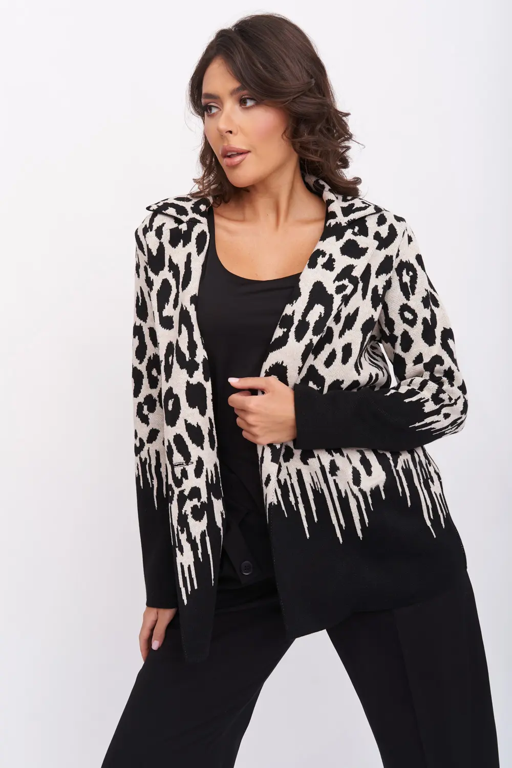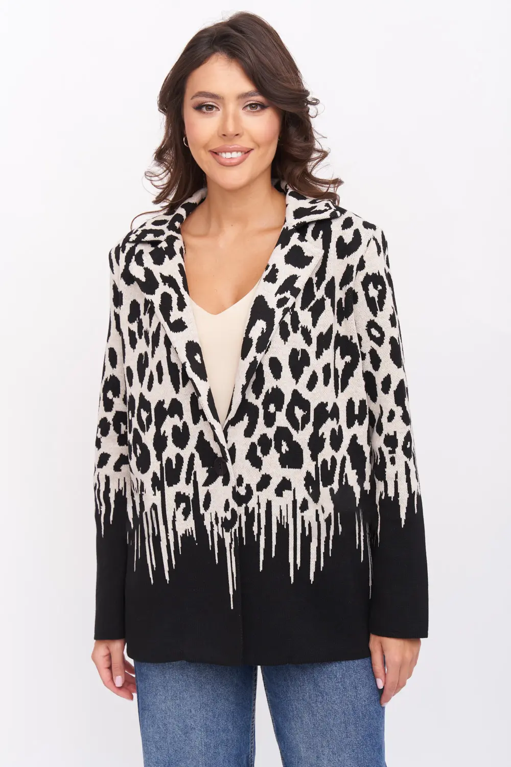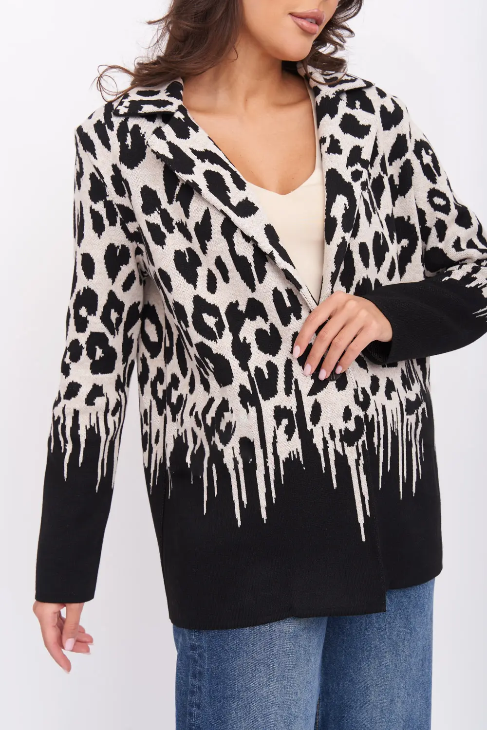 Женский жакет из вязаного трикотажа прямого силуэта с V-образным вырезом, английским воротником. Рукав втачной длинный. Застёжка спереди на пуговицу. Изделие выполнено жаккардовым переплетением, образующим анималистический принт.