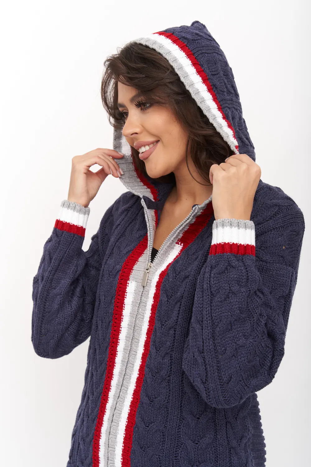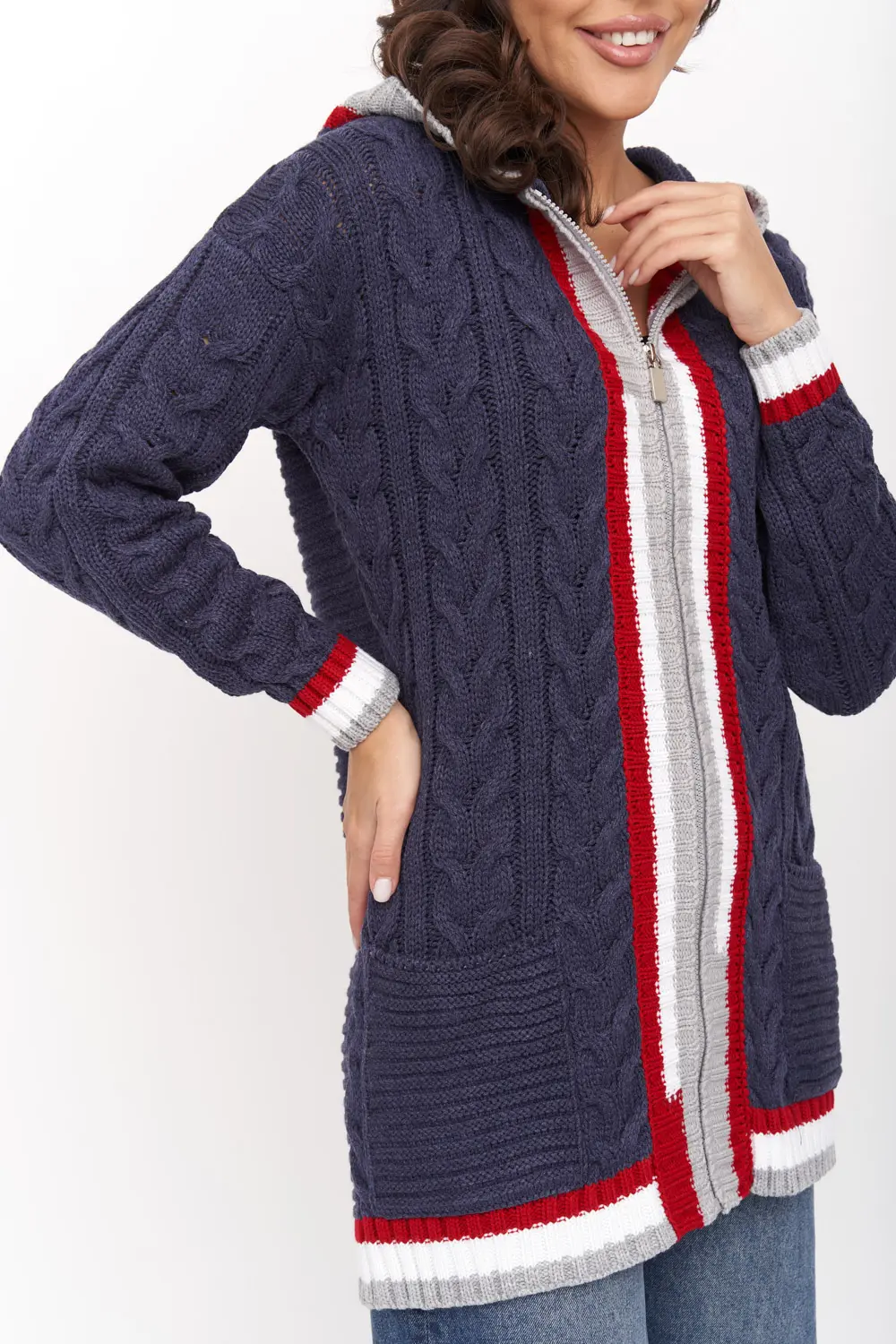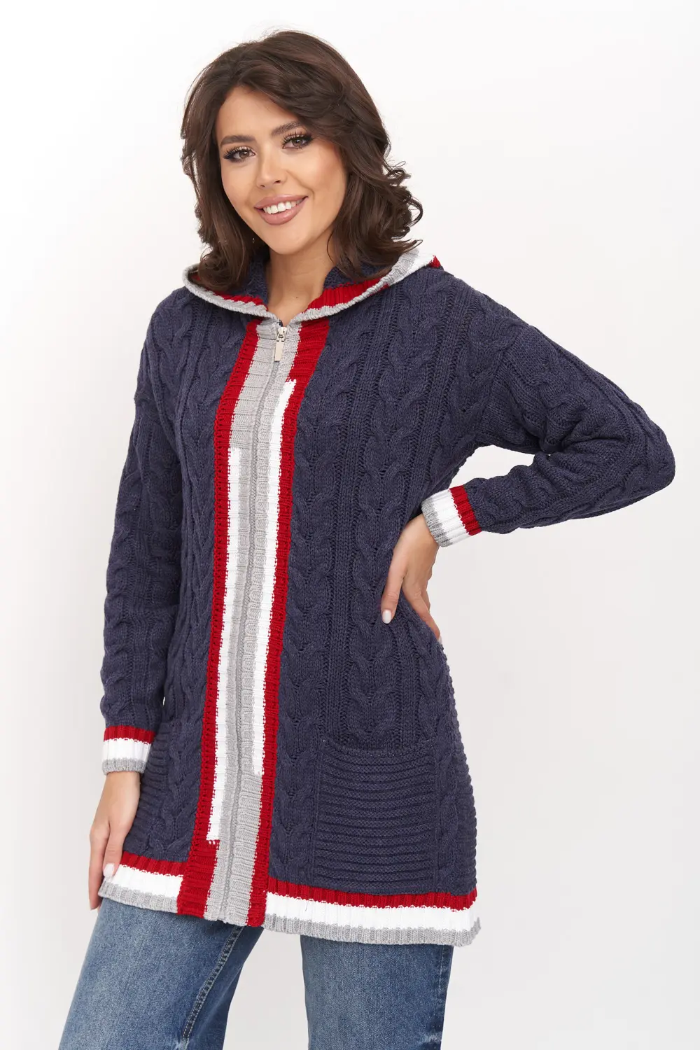 Жакет женский вязаный свободного силуэта, с капюшоном. Спущенное плечо, рукав длинный. По низу рукава и изделия эластичная резинка. Жакет выполнен вязкой с объемными косами. Жакет декорирован контрастными полосами на капюшоне, манжетах и вдоль полочек. Оптимальный состав - пан-70%, шерсть - 30% - позволяет чувствовать себя комфортно в помещении. Жакет, благодаря свободному крою, подойдет для любого типа фигуры.