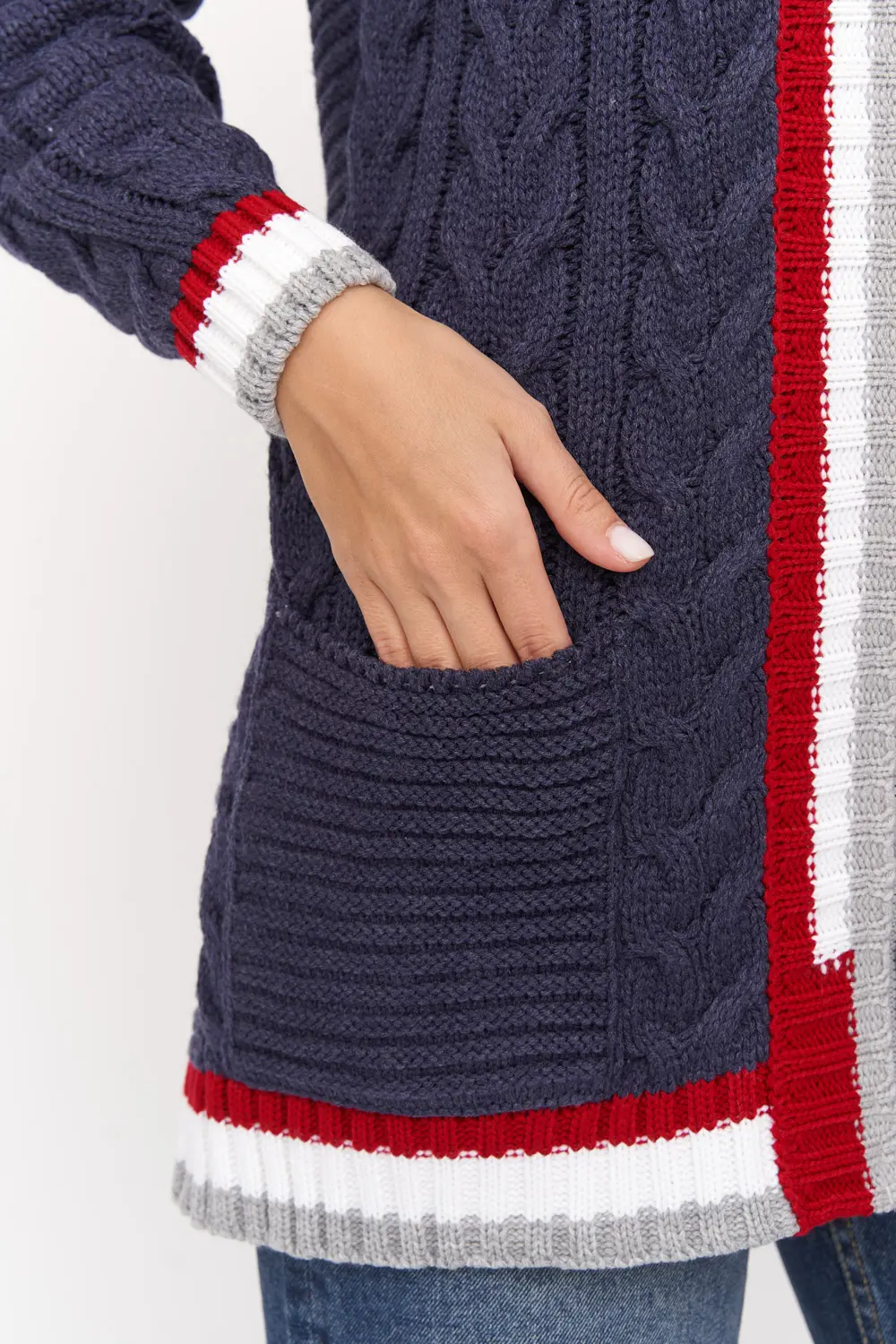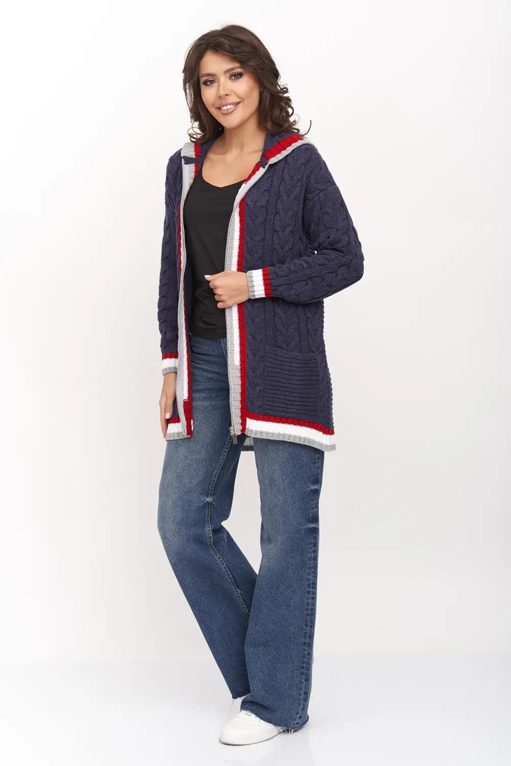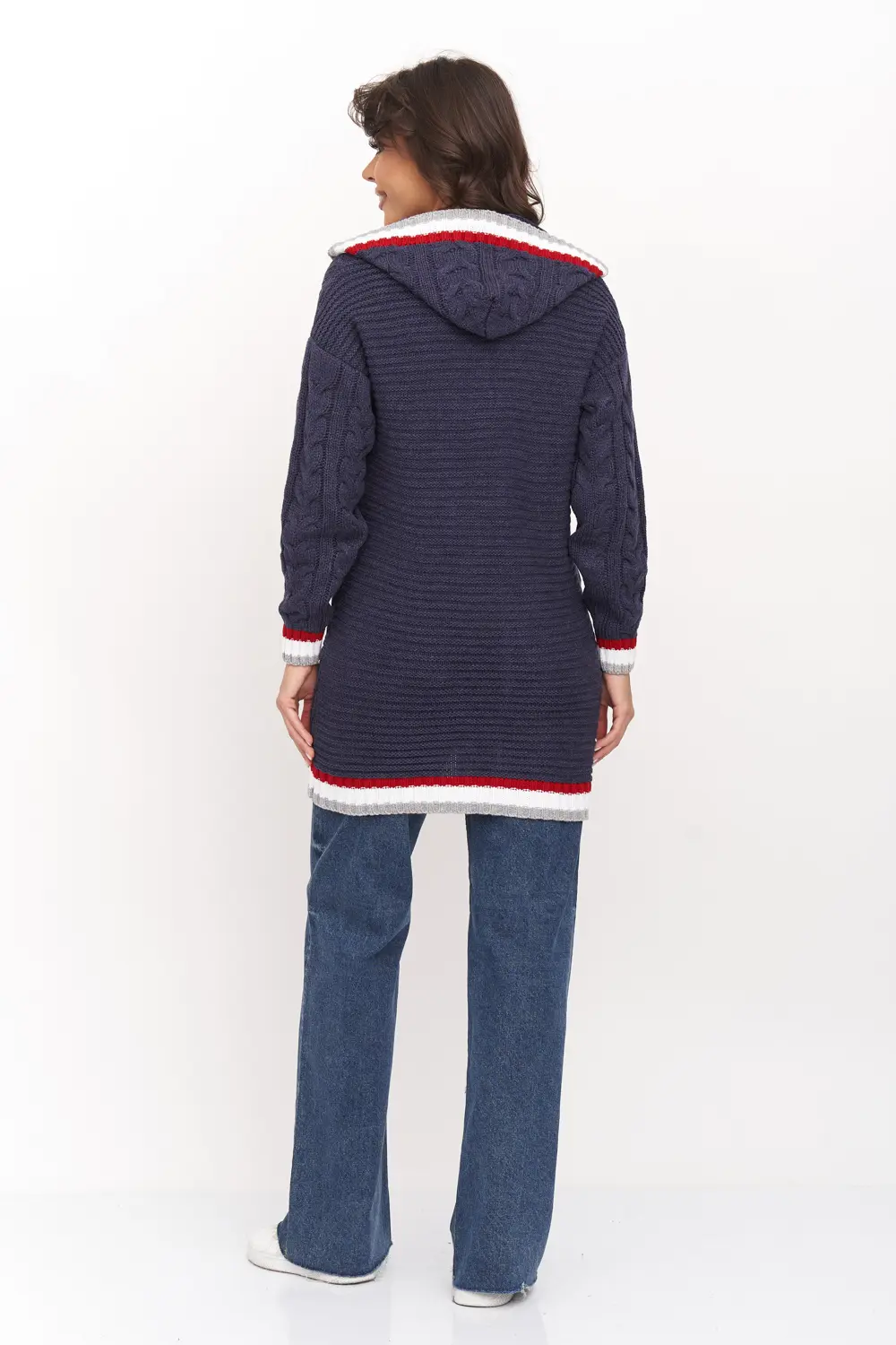 Жакет женский вязаный свободного силуэта, с капюшоном. Спущенное плечо, рукав длинный. По низу рукава и изделия эластичная резинка. Жакет выполнен вязкой с объемными косами. Жакет декорирован контрастными полосами на капюшоне, манжетах и вдоль полочек. Оптимальный состав - пан-70%, шерсть - 30% - позволяет чувствовать себя комфортно в помещении. Жакет, благодаря свободному крою, подойдет для любого типа фигуры.