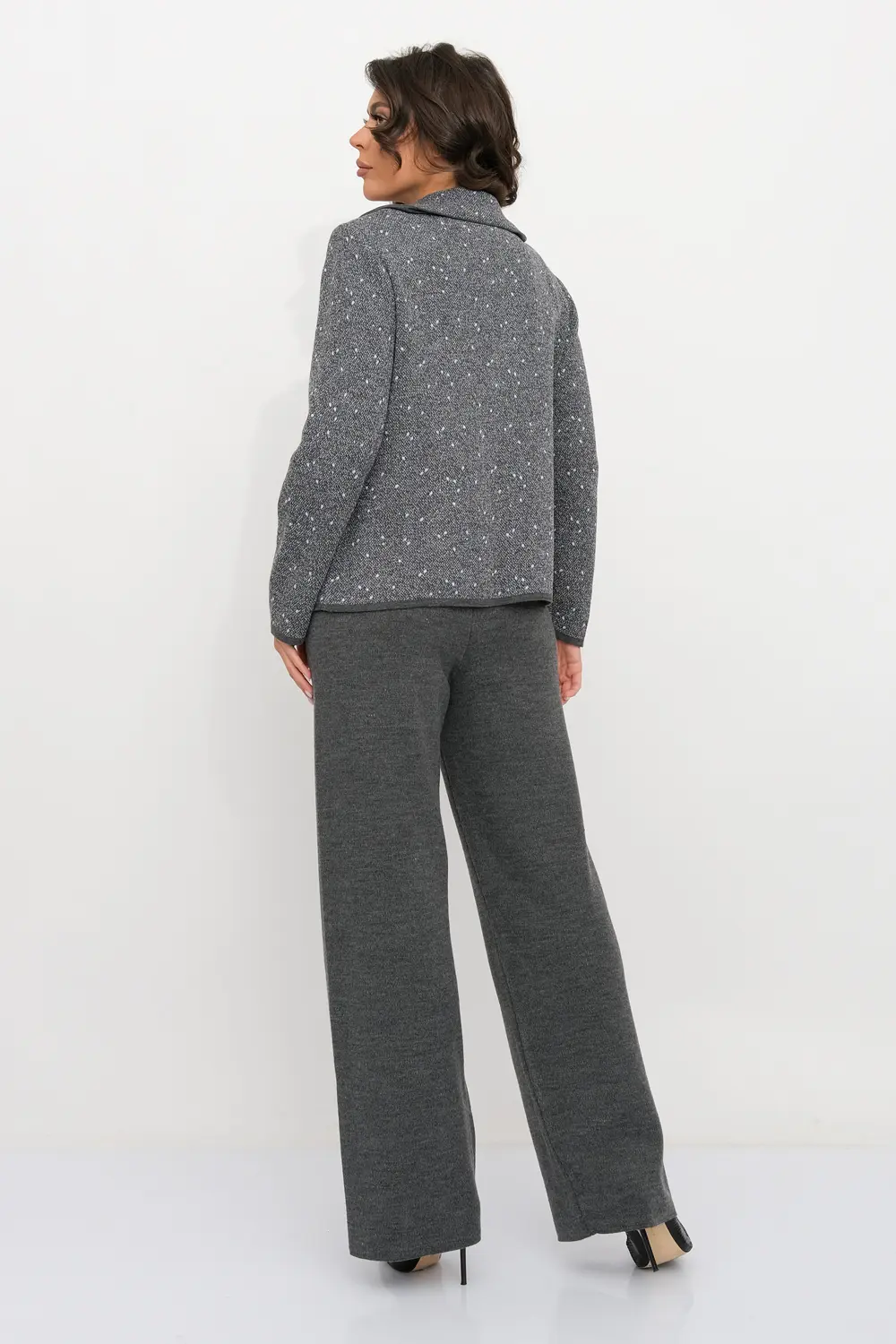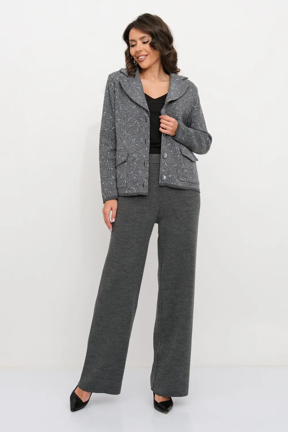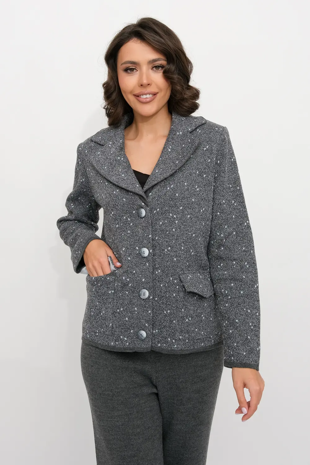 Женский вязаный жакет прямого силуэта с V-образным вырезом, английским воротником. Рукав втачной длинный. Застёжка на пуговицы. Два накладных кармана с клапаном. Изделие выполнено жаккардовым переплетением. Жакет подойдет для работы в офис и деловых встреч, в нем Вы будете выглядеть модно, но при этом лаконично и сдержанно.