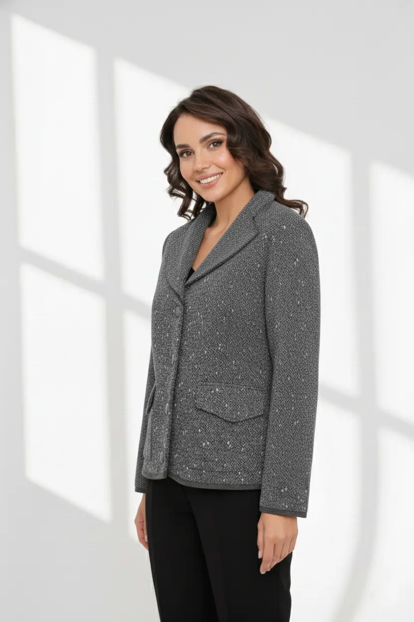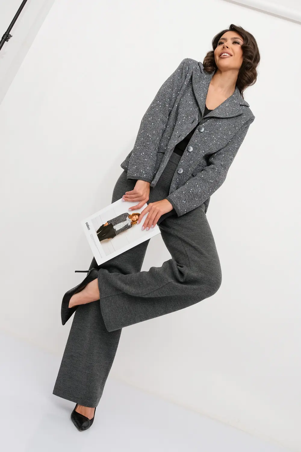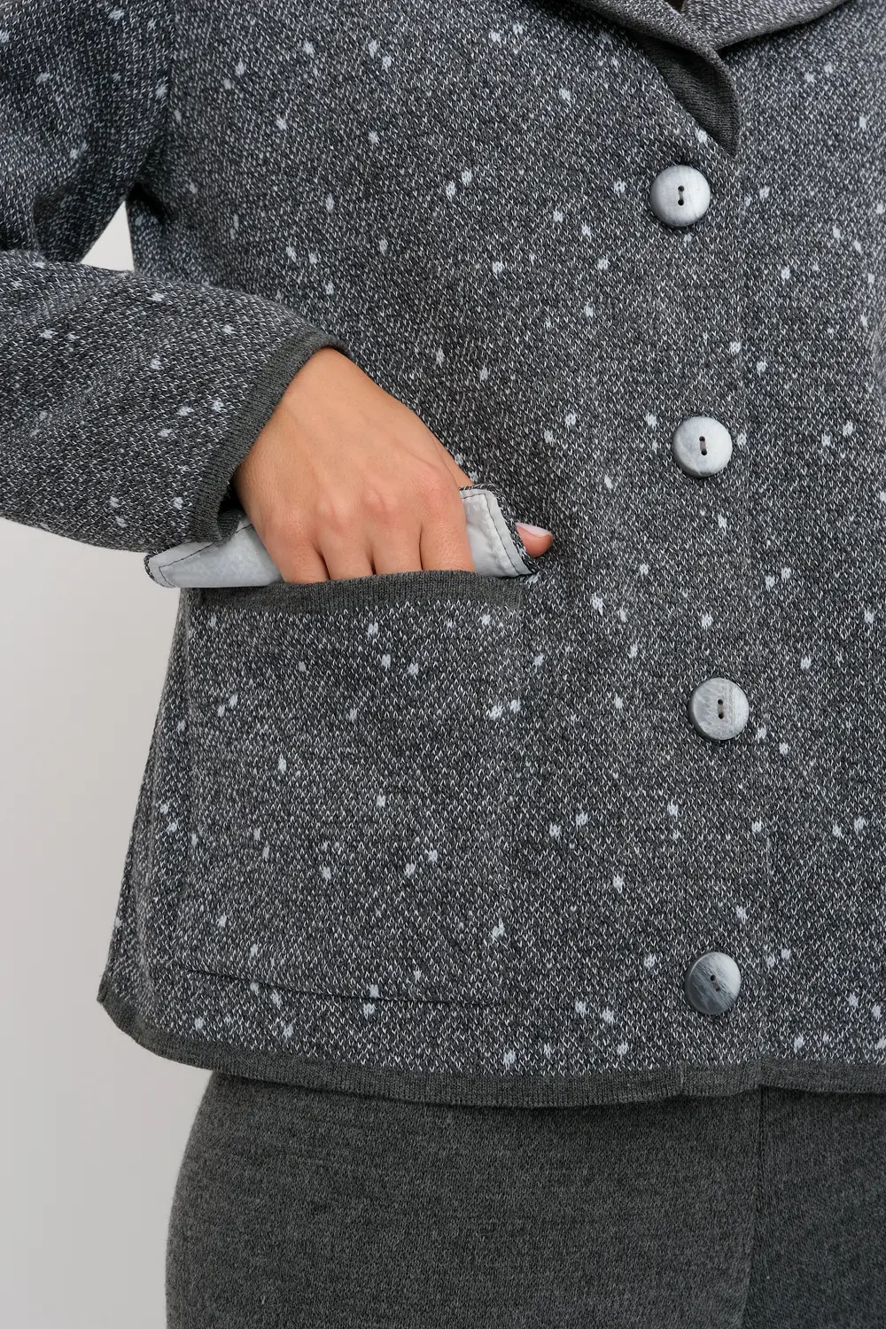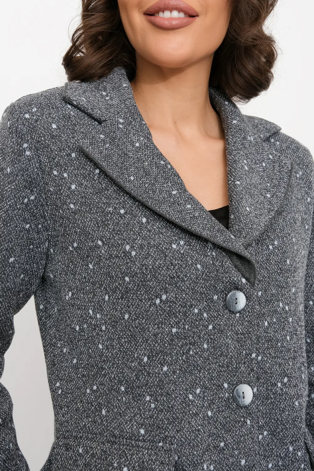 Женский вязаный жакет прямого силуэта с V-образным вырезом, английским воротником. Рукав втачной длинный. Застёжка на пуговицы. Два накладных кармана с клапаном. Изделие выполнено жаккардовым переплетением. Жакет подойдет для работы в офис и деловых встреч, в нем Вы будете выглядеть модно, но при этом лаконично и сдержанно.