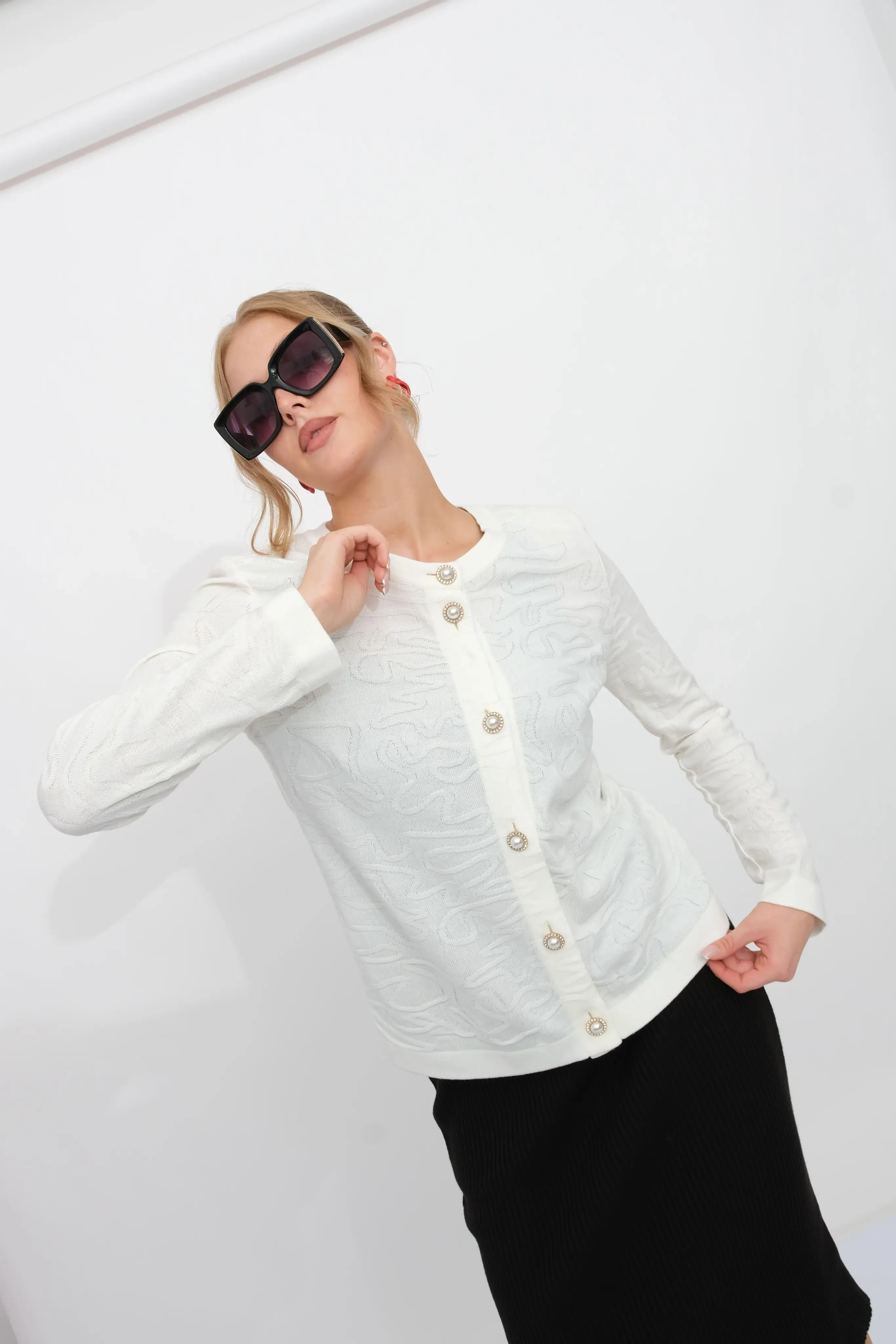 Нарядный женский жакет из трикотажного полотна полуприлегающего силуэта с круглой горловиной, на пуговицах. Рукава втачные длинные. Жакет выполнен структурным переплетением. Эффектная металлические пуговицы в отделке придают жакету нарядный вид..