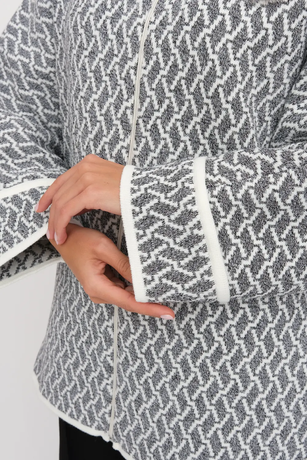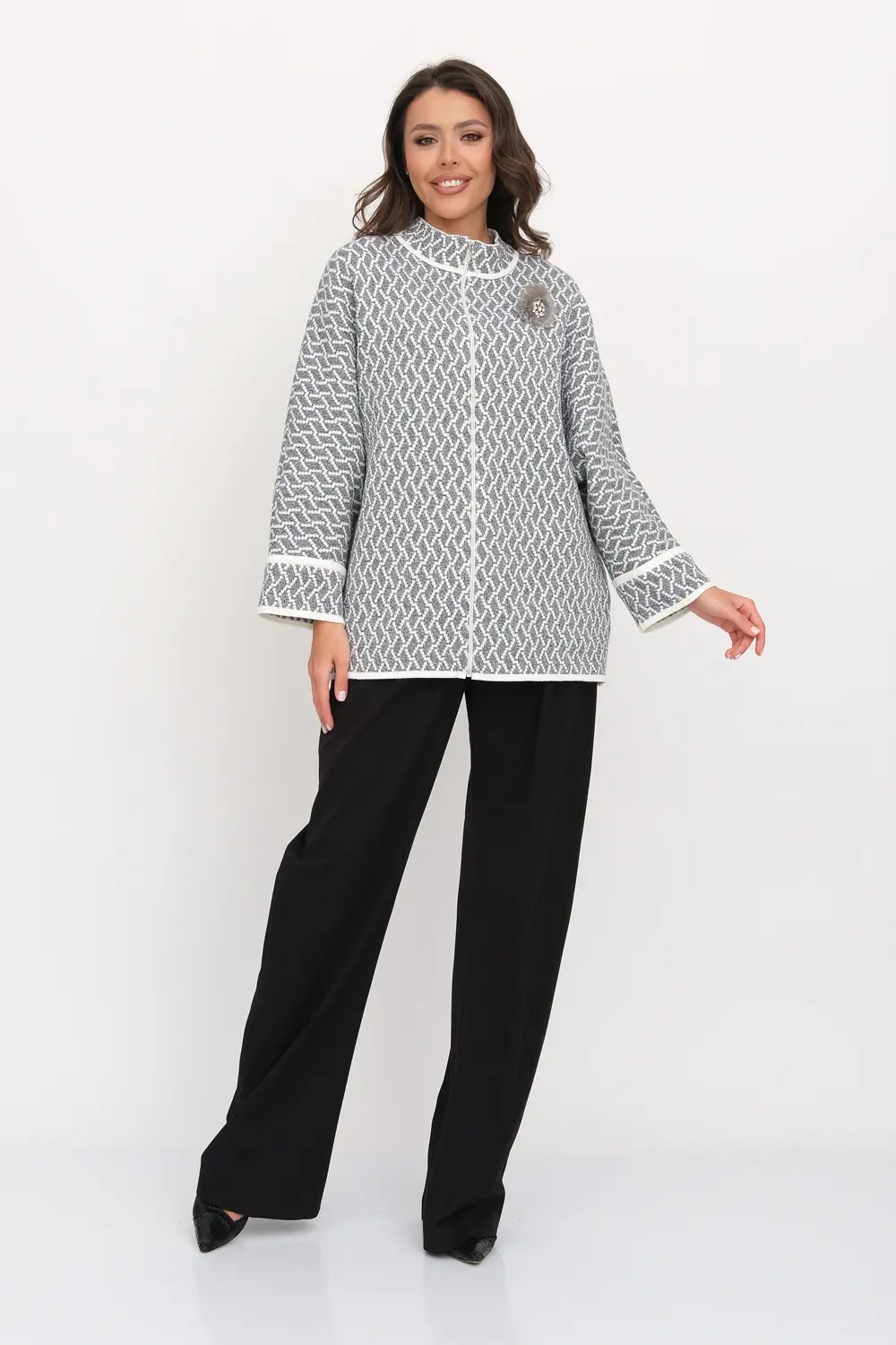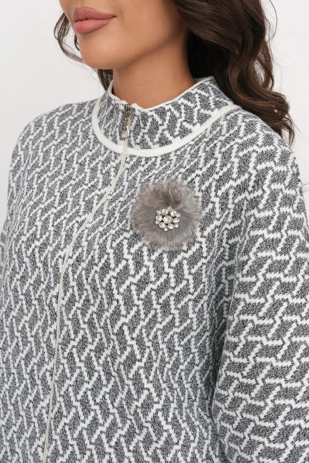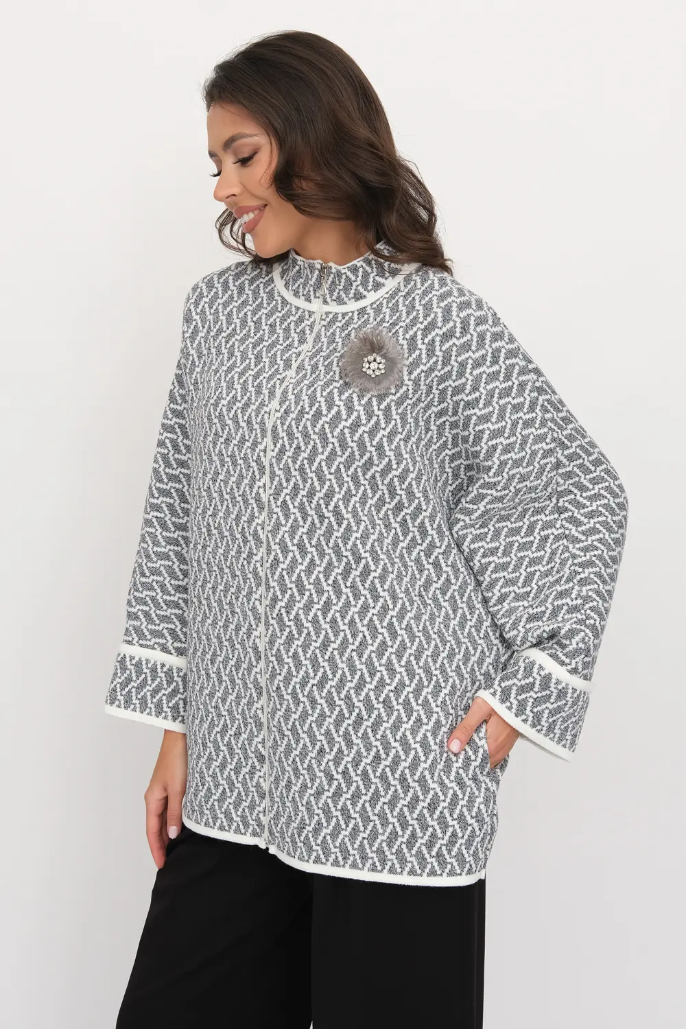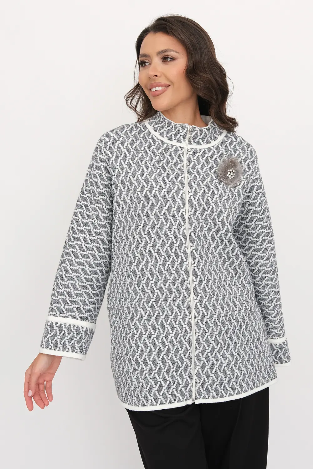 Жакет женский вязаный. Рукава цельнокроеные на манжете. Застежка на молнию. Воротник-стойка. Карманы в боковых швах. Очень эффектное жаккардовое полотно с рельефным мелким узором.