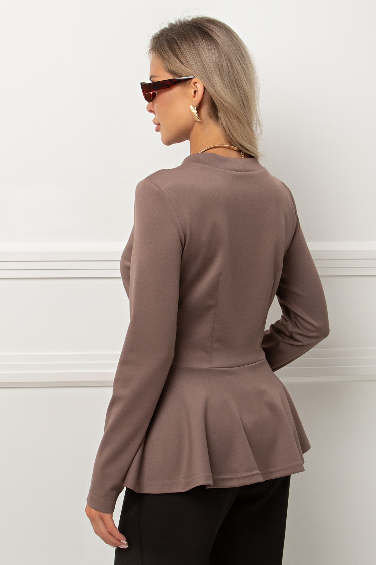 Элегантный приталенный жакет с баской из трикотажного полотна. Длинный втачной рукав. V - образная горловина переходящая в планку с застежкой на петли и пуговицы. Низ ровный ,без разрезов. Рекомендуемая стирка при t не более 30. Длина жакета: 63 см Длина рукава : 60 см Рост фотомодели: 168 см Размер фотомодели: 42 Ткань: трикотаж