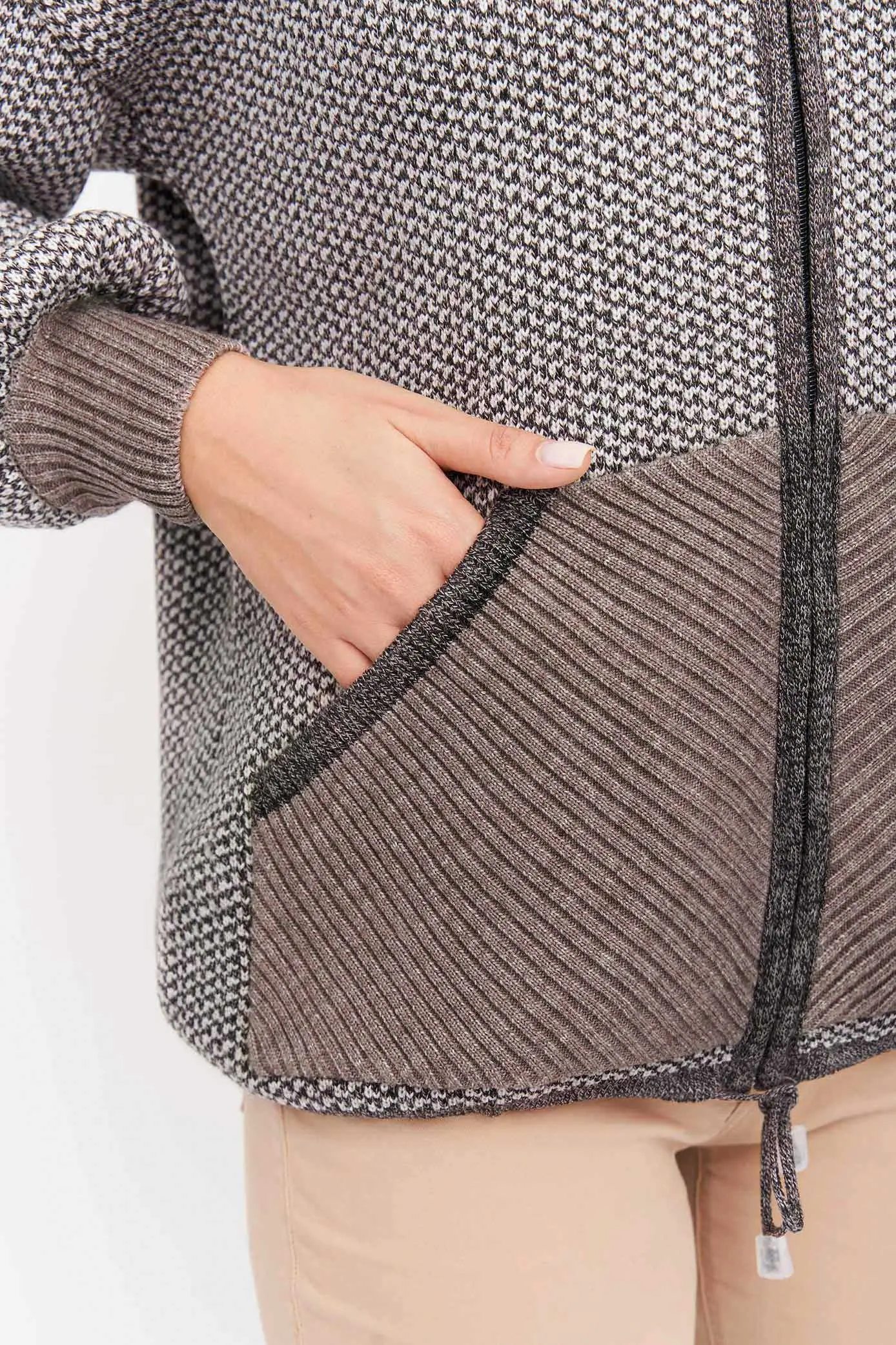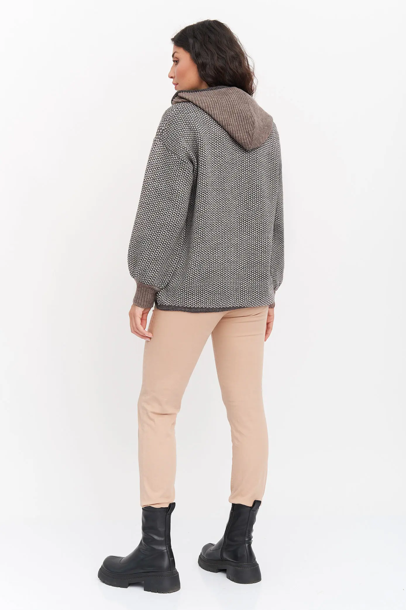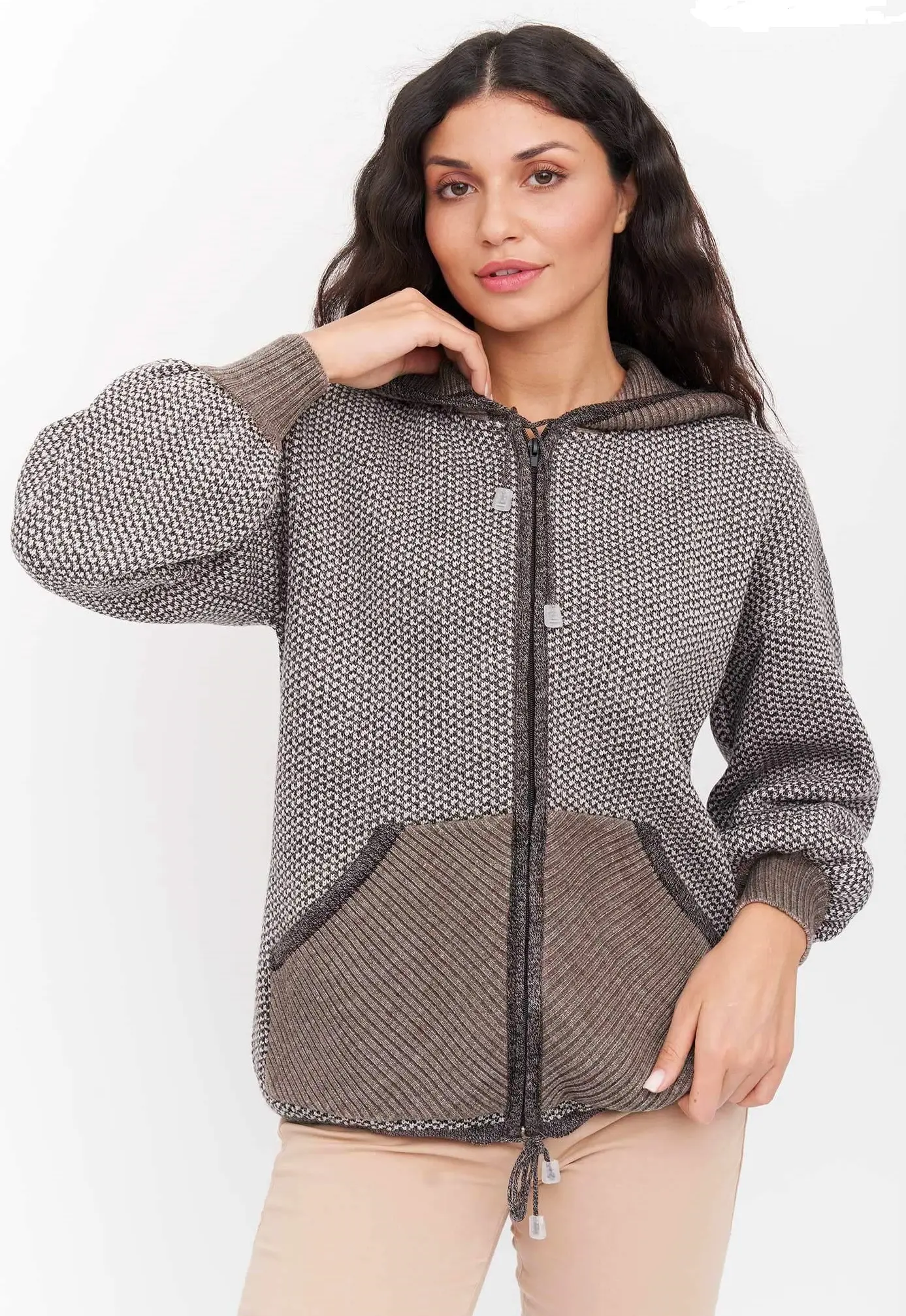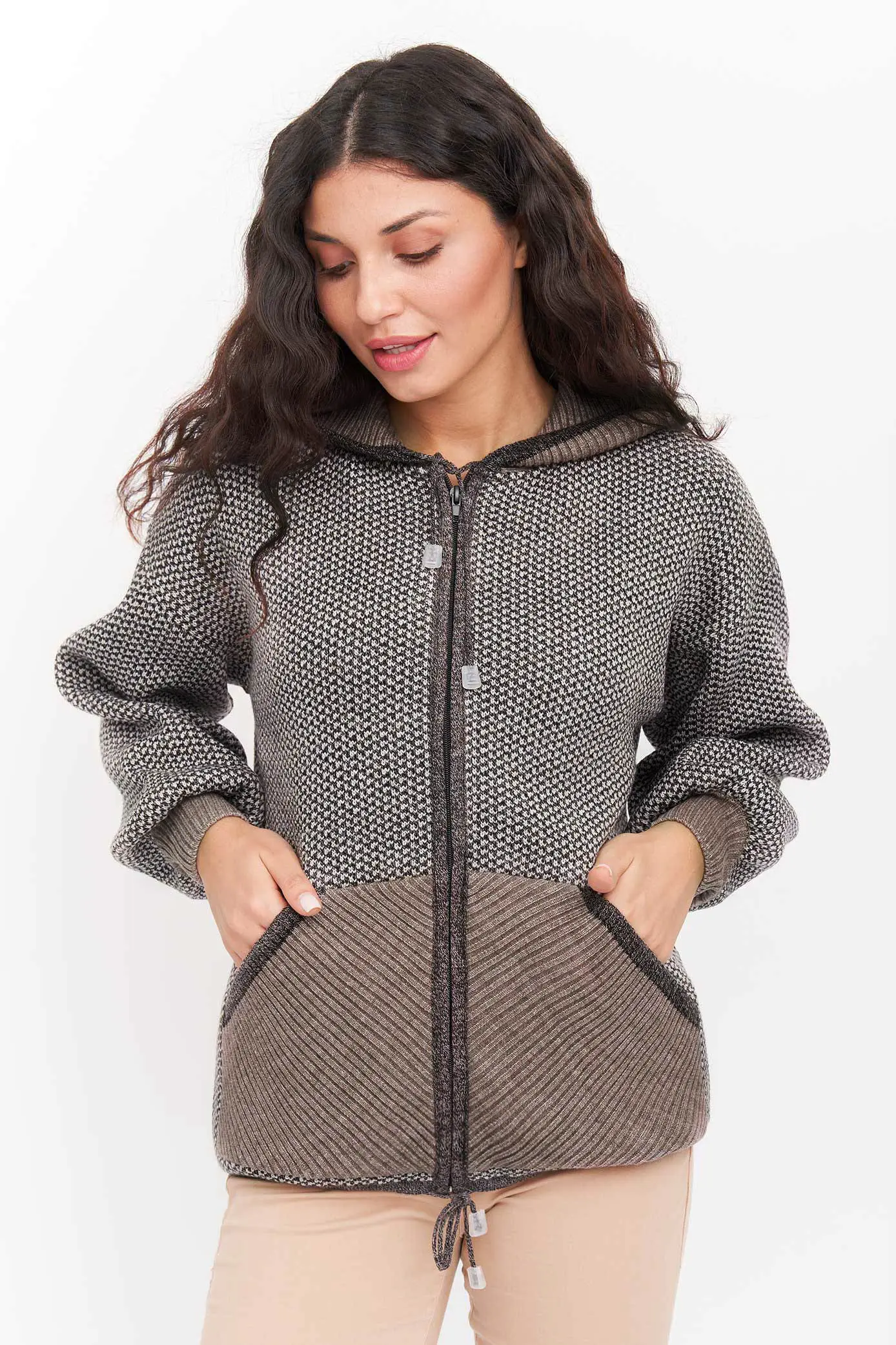 Жакет свободного силуэта на молнии с капюшоном. Два накладных кармана по бокам изделия. Рукава втачные длинные, плечо спущенное. По низу изделия и в капюшон проложен шнурок-утяжка. Жакет выполнен жаккардовым переплетением.