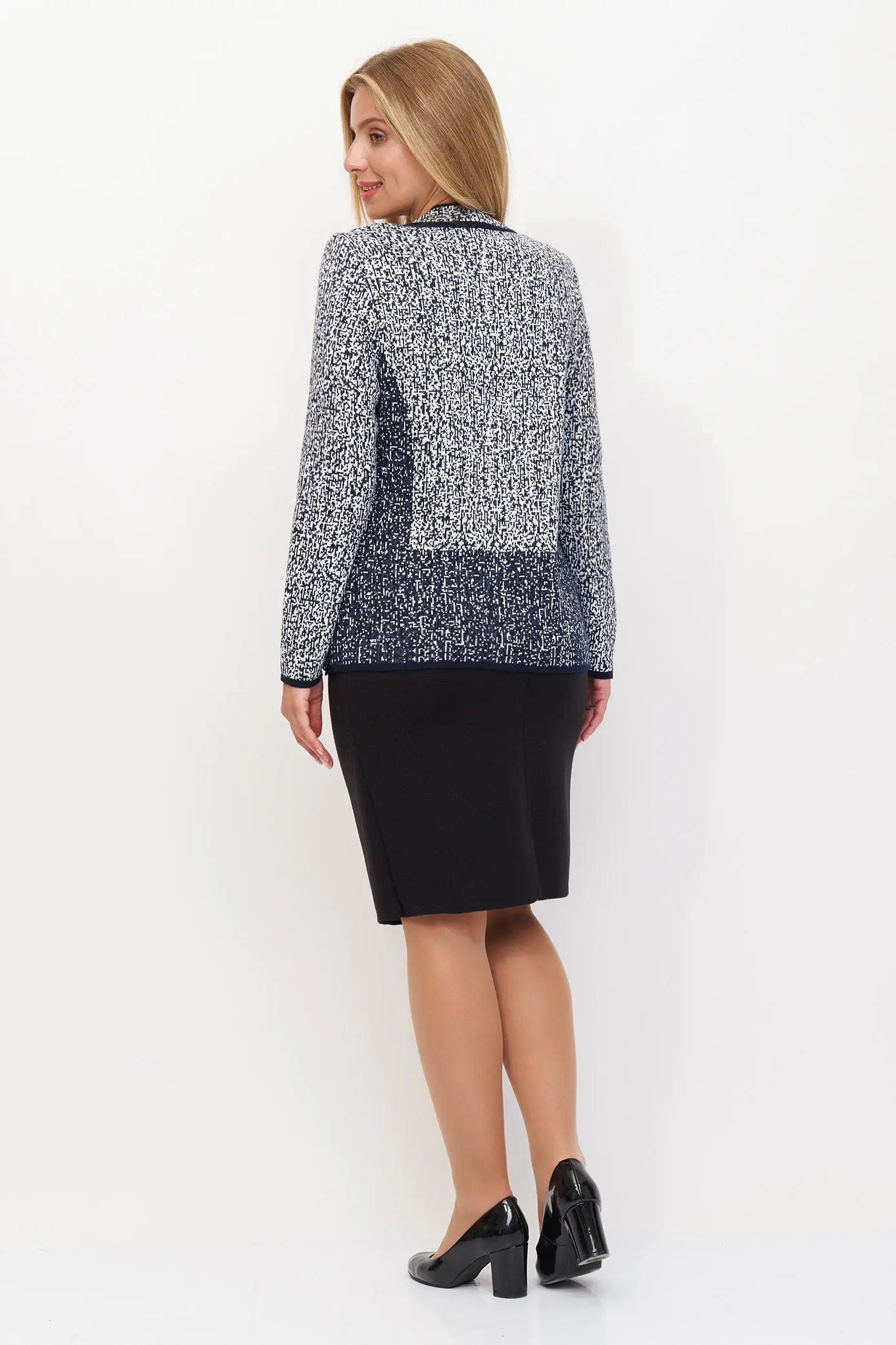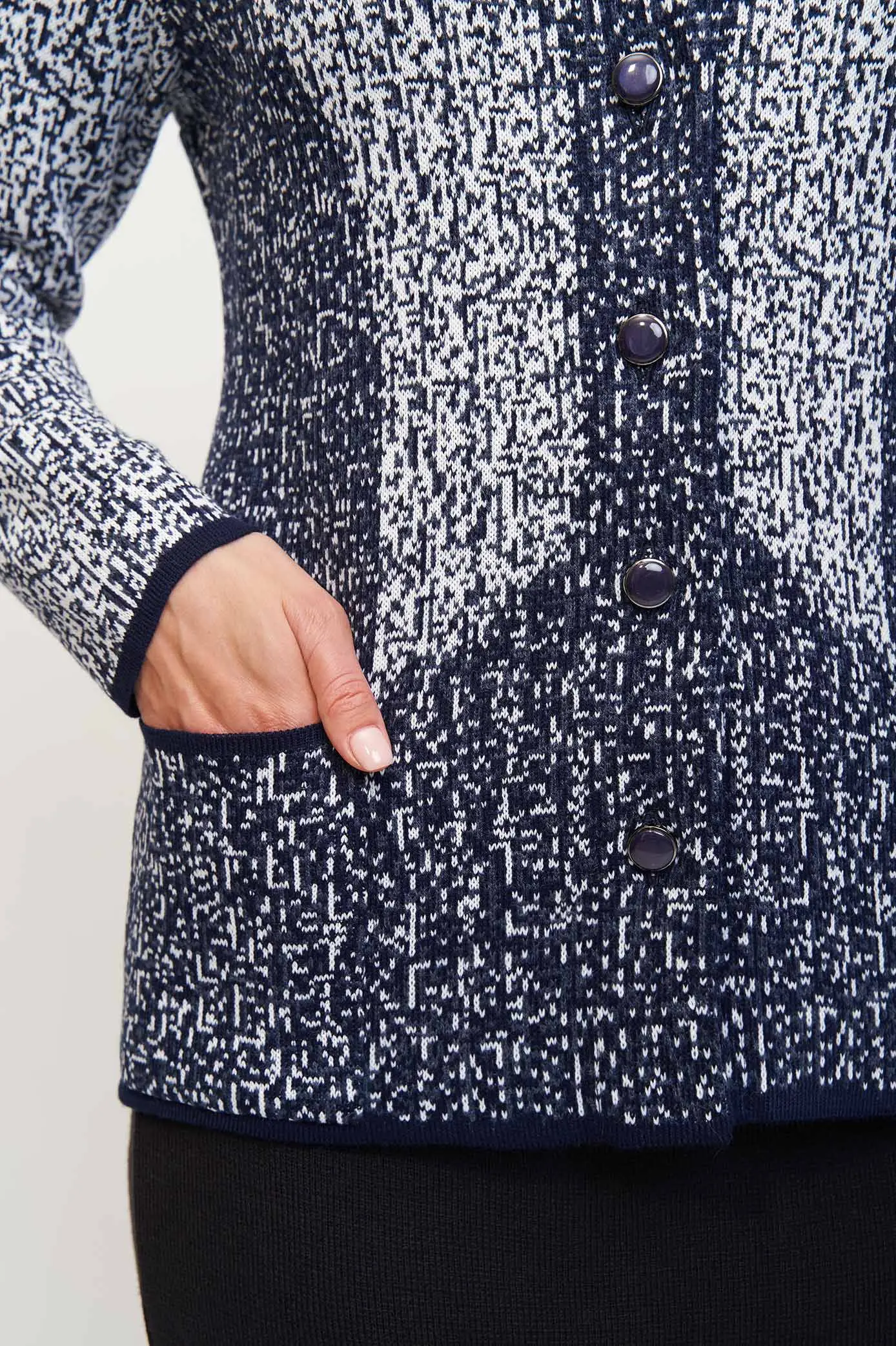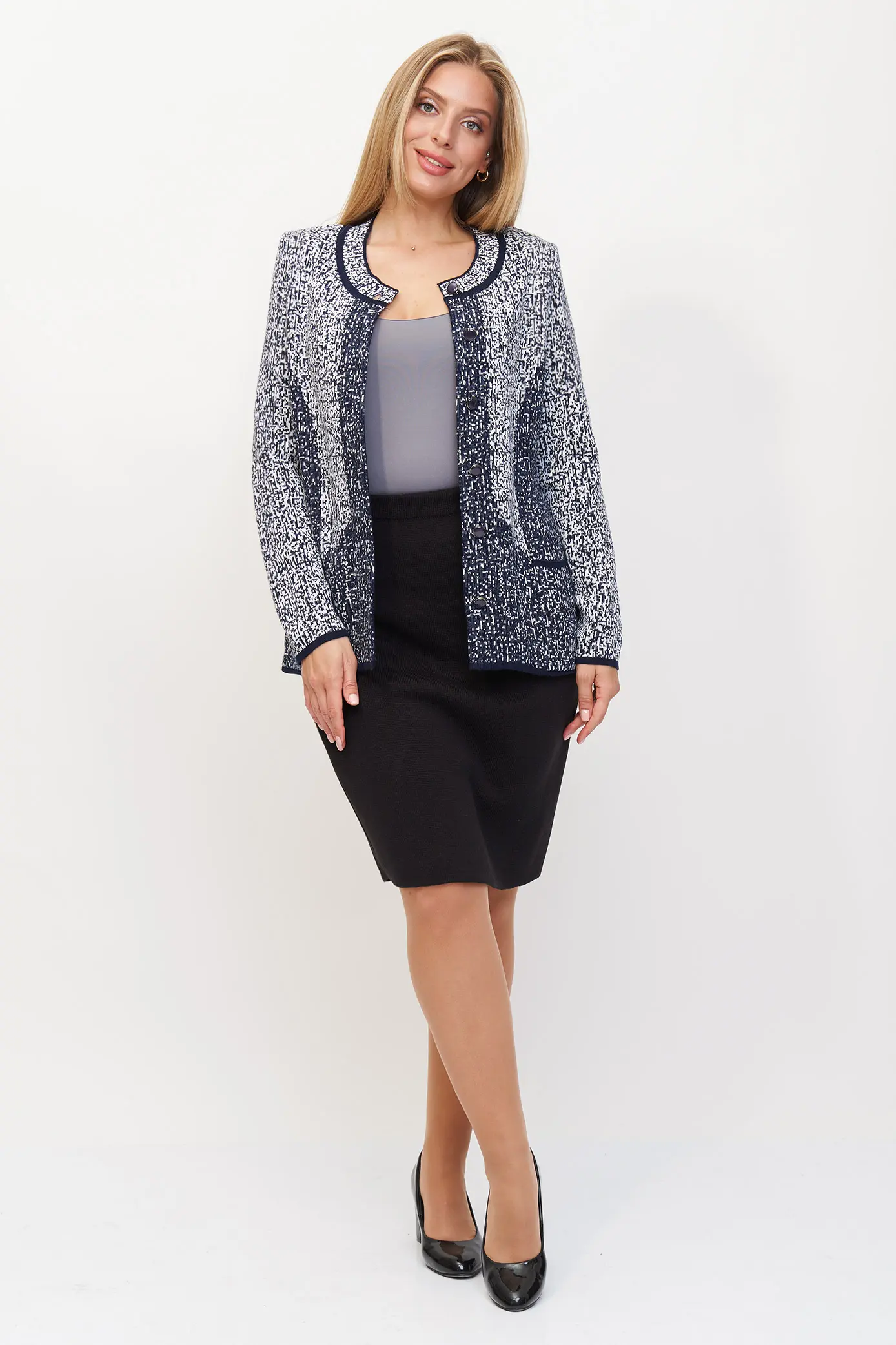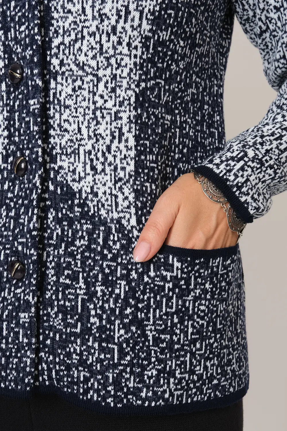 Жакет полуприталенного силуэта с длинным втачным рукавом. Жакет застегивается на пуговицы. Карманы горизонтальные прорезные. Горловина обработана оригинальным воротником с повторением жаккардового рисунка "мелкий штрих"