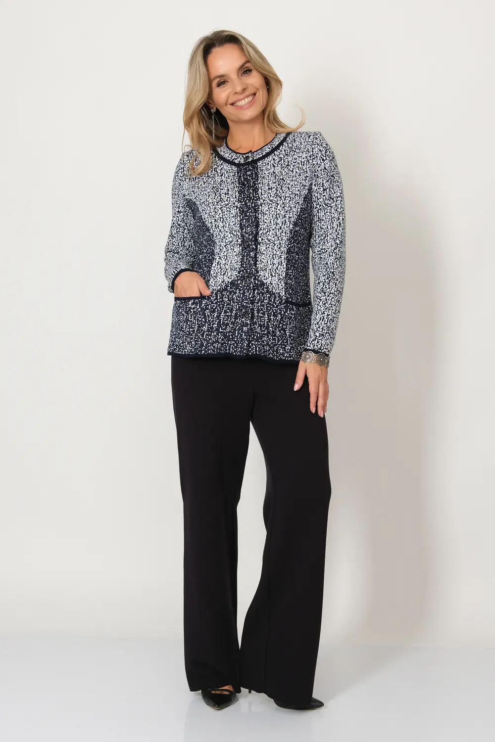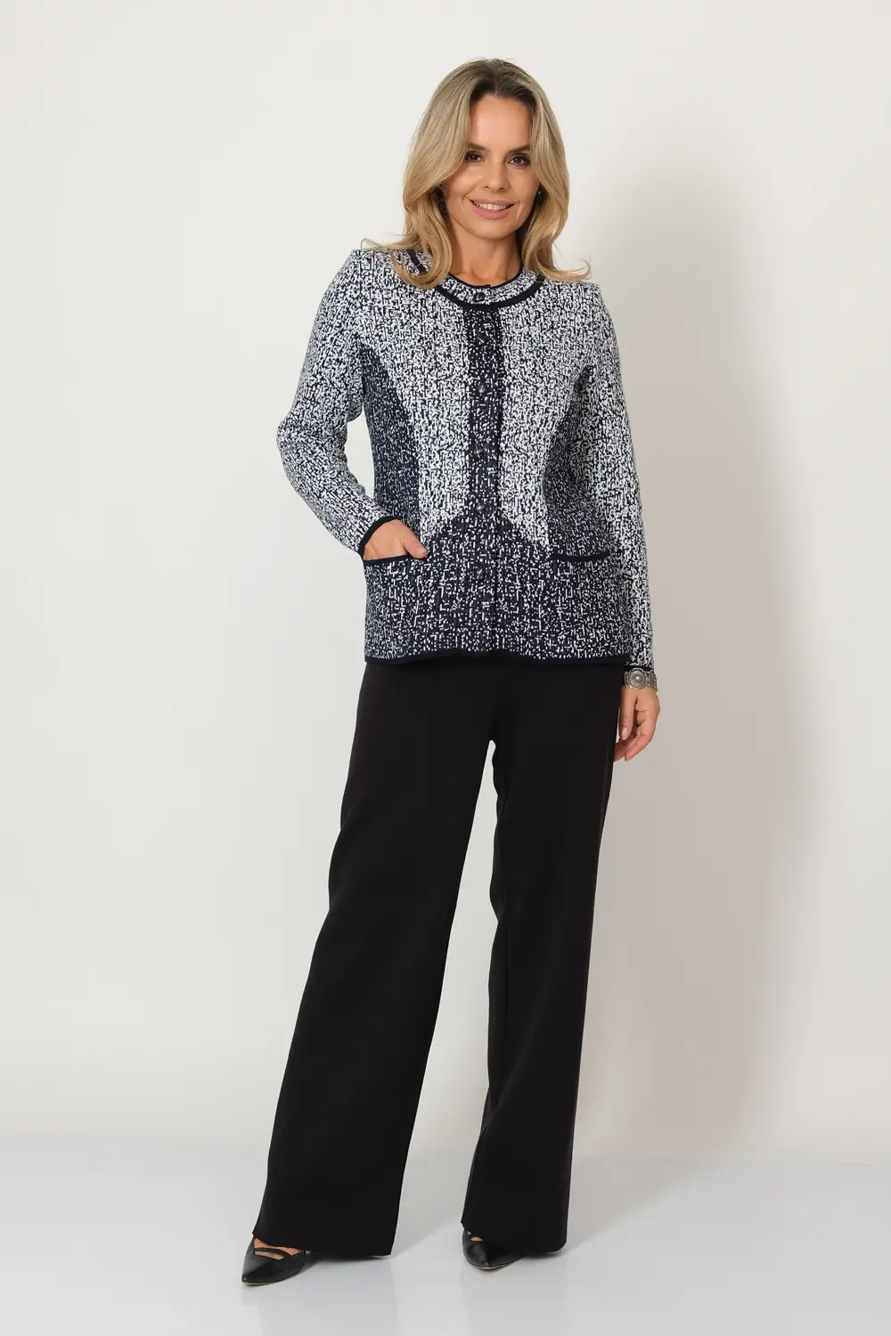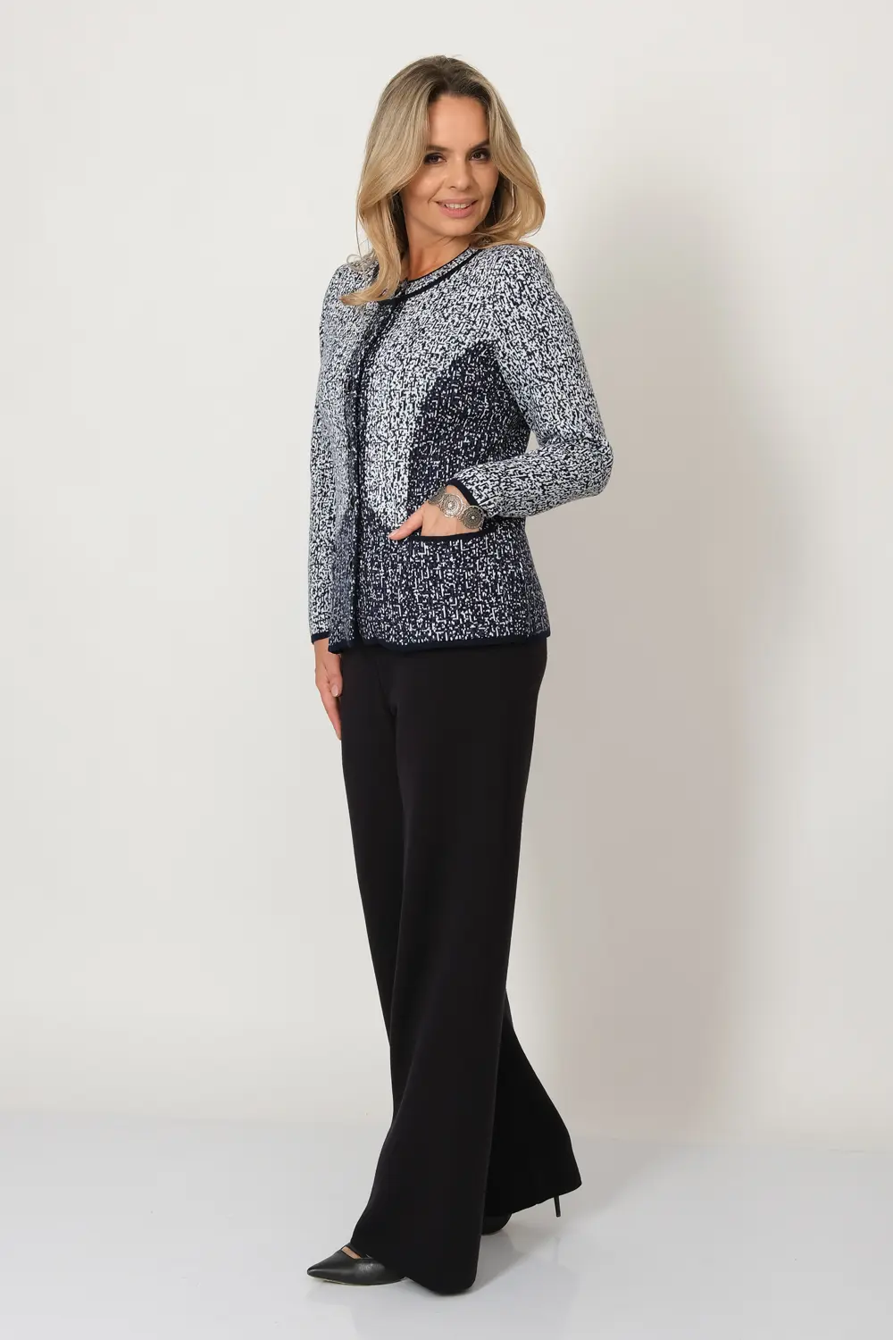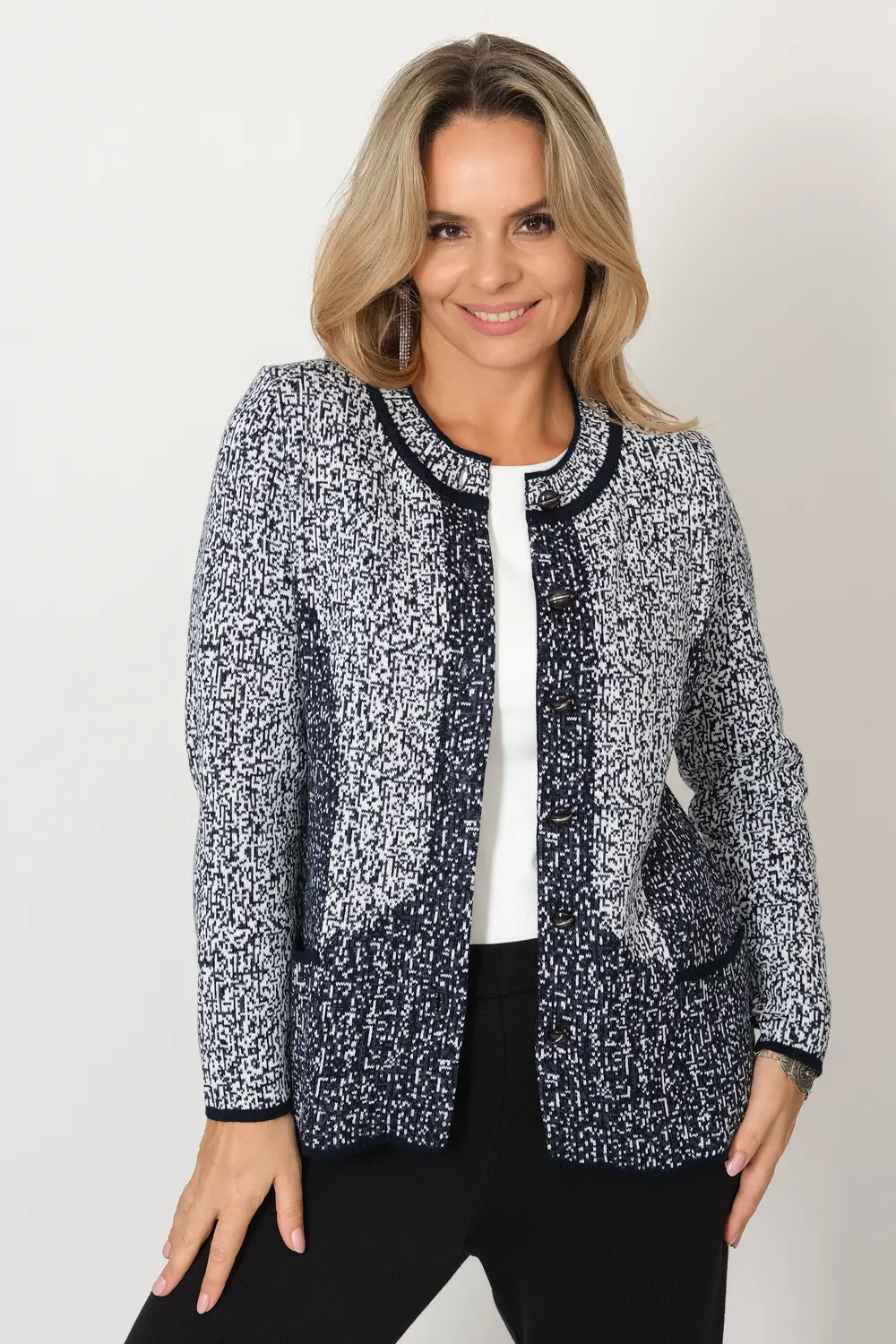 Жакет полуприталенного силуэта с длинным втачным рукавом. Жакет застегивается на пуговицы. Карманы горизонтальные прорезные. Горловина обработана оригинальным воротником с повторением жаккардового рисунка "мелкий штрих"