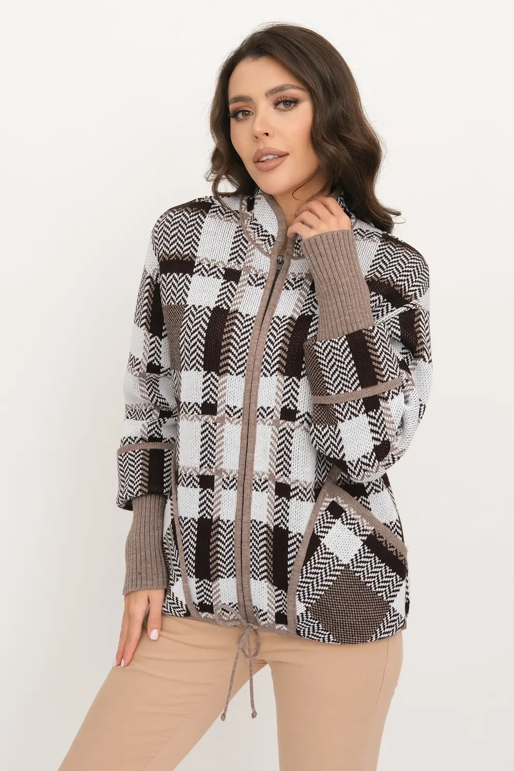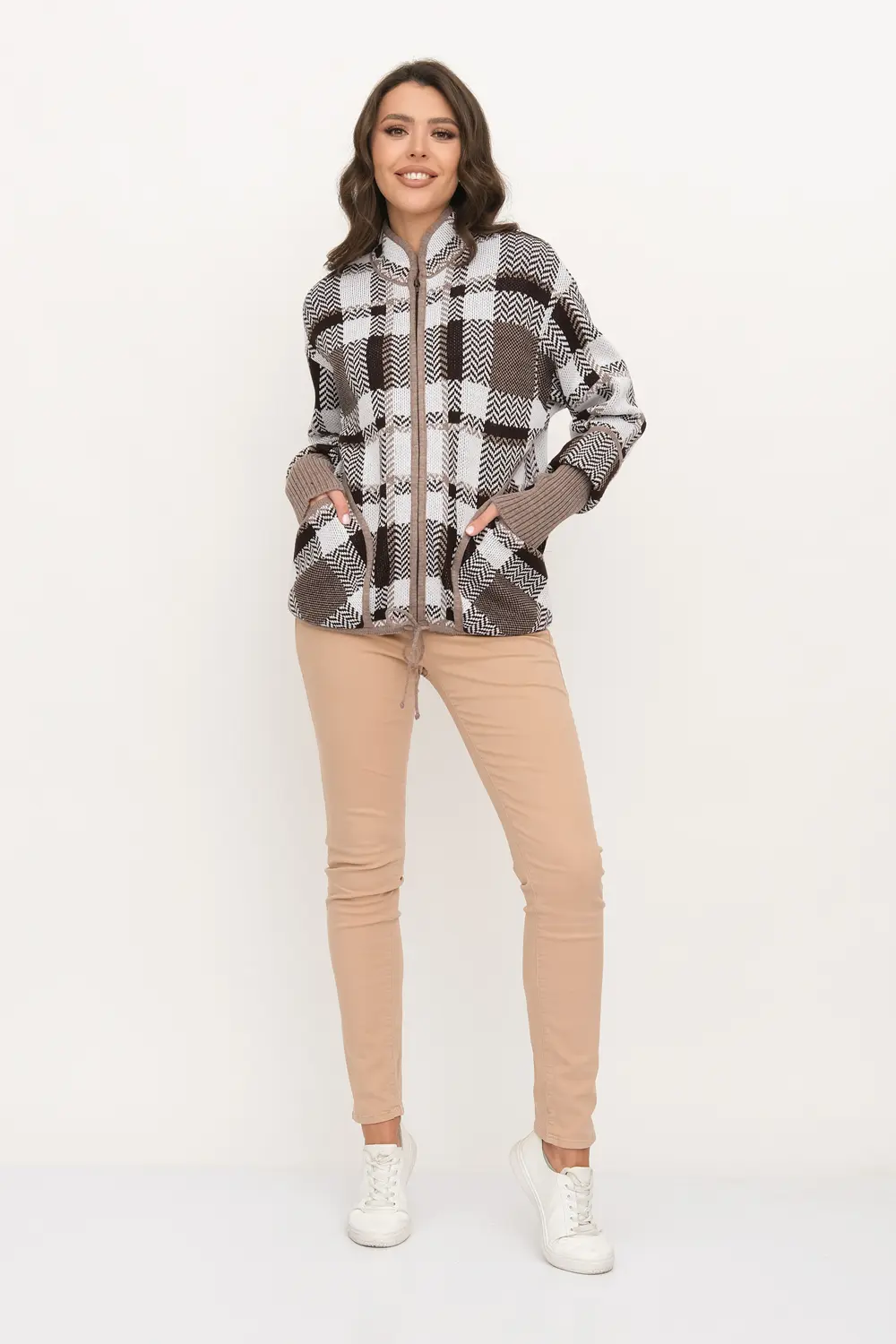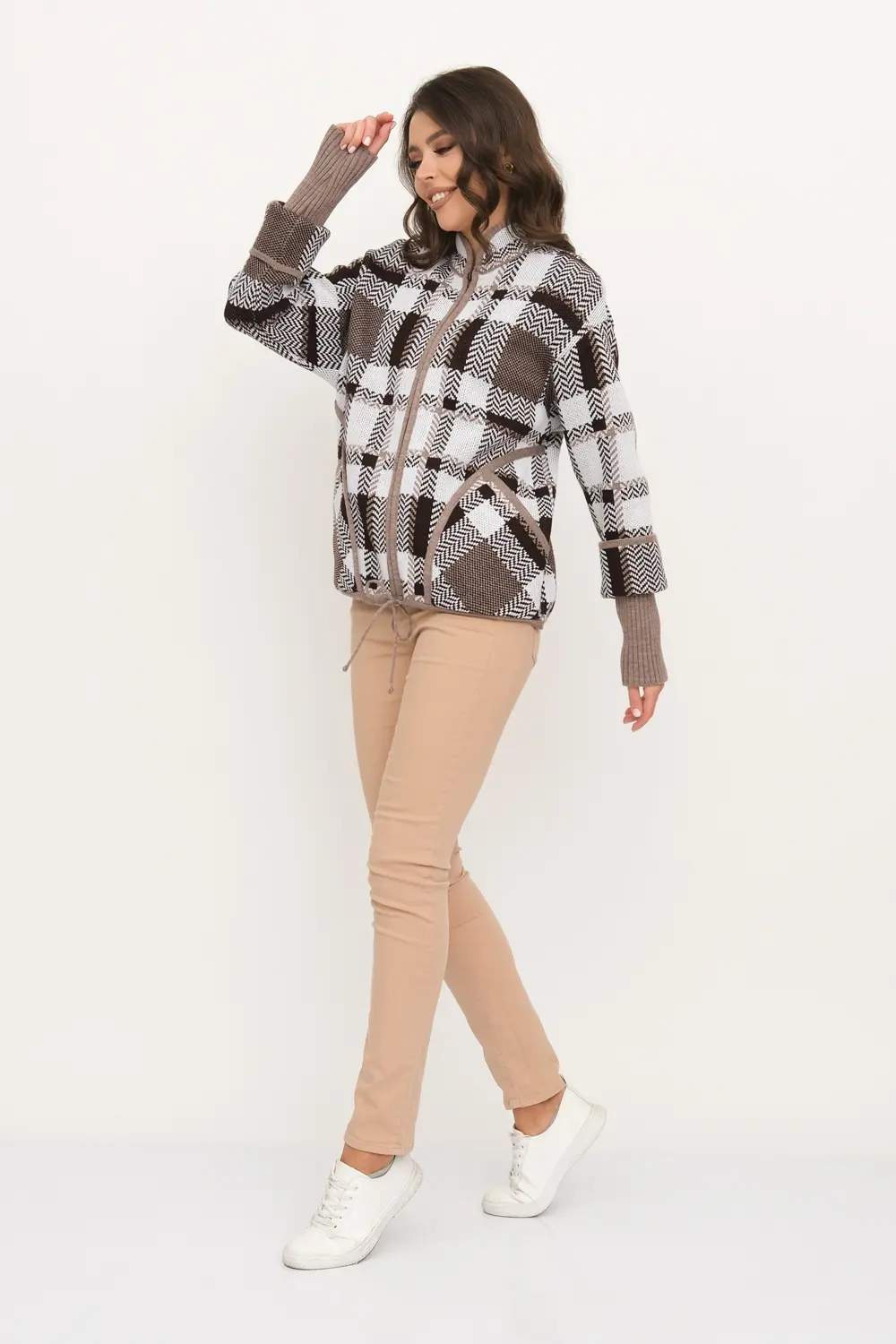 Жакет женский на молнии свободного силуэта с цельновывязанным рукавом 3/4 с удлиненными эластичными манжетами. Воротник-стойка, застежка на молнии. По бокам вязанного жакета два накладных кармана. По низу изделия проложен шнурок. Жаккардовый рисунок образует клетку.