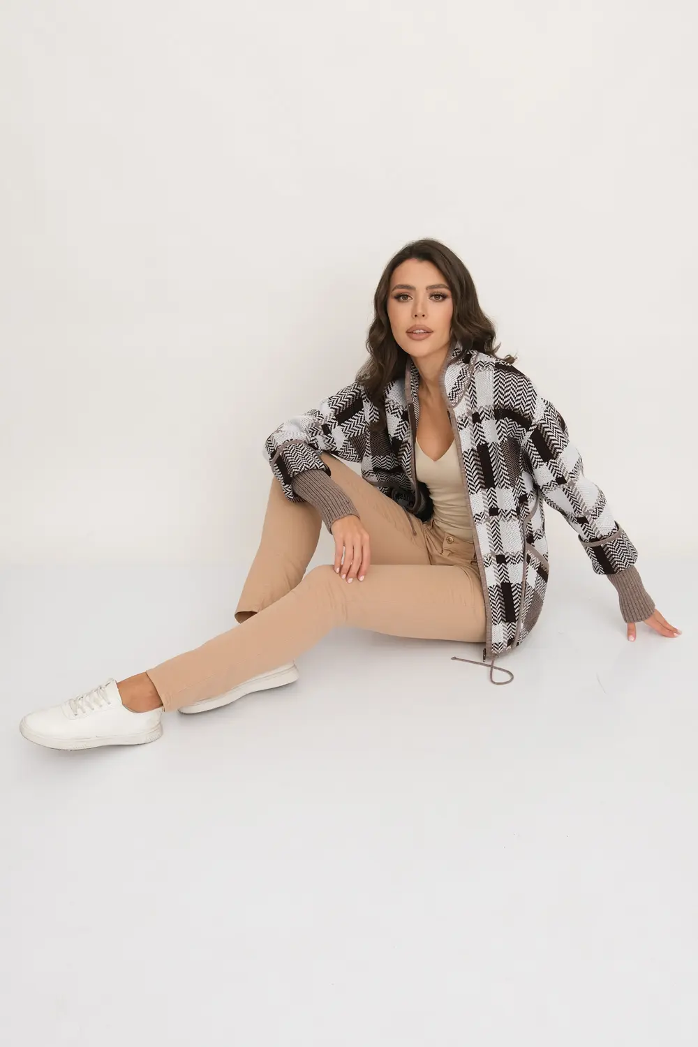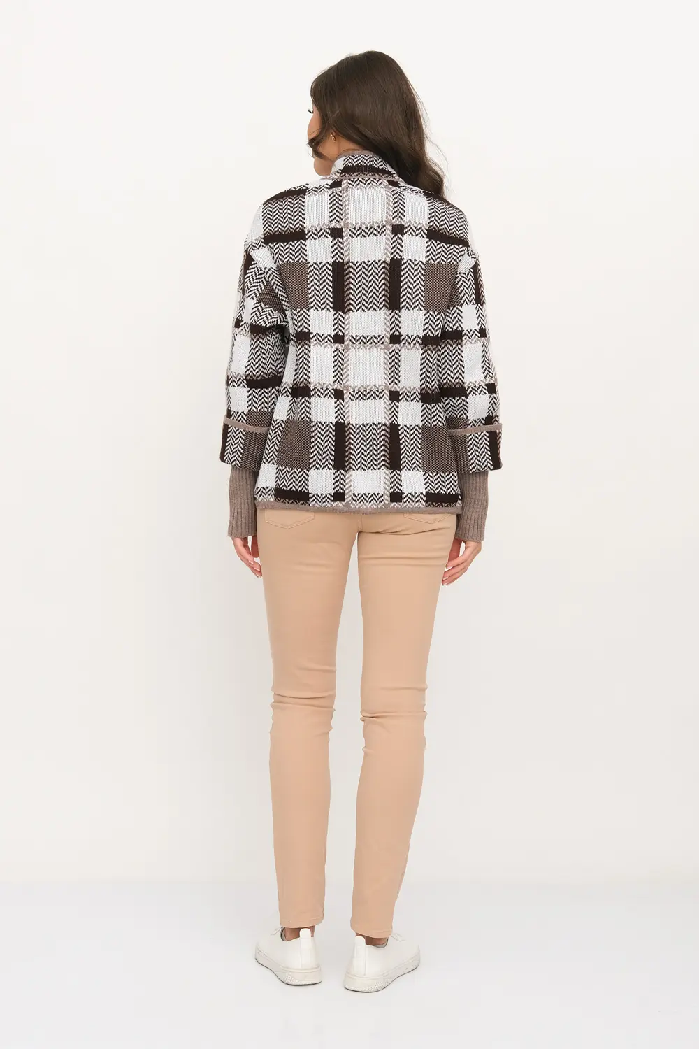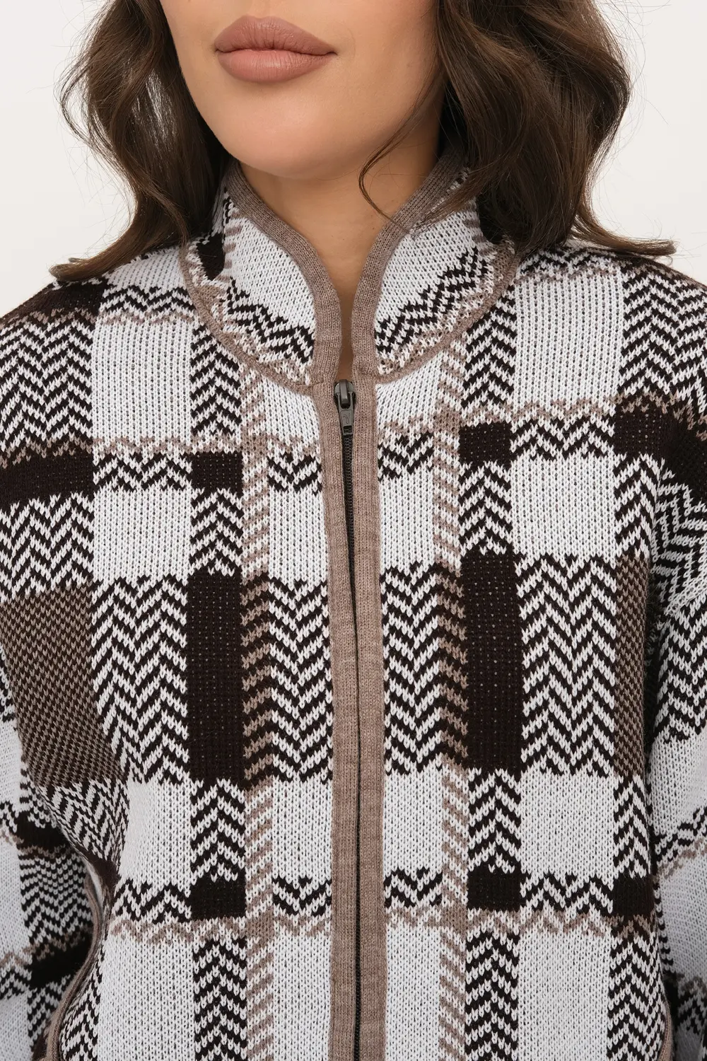 Жакет женский на молнии свободного силуэта с цельновывязанным рукавом 3/4 с удлиненными эластичными манжетами. Воротник-стойка, застежка на молнии. По бокам вязанного жакета два накладных кармана. По низу изделия проложен шнурок. Жаккардовый рисунок образует клетку.
