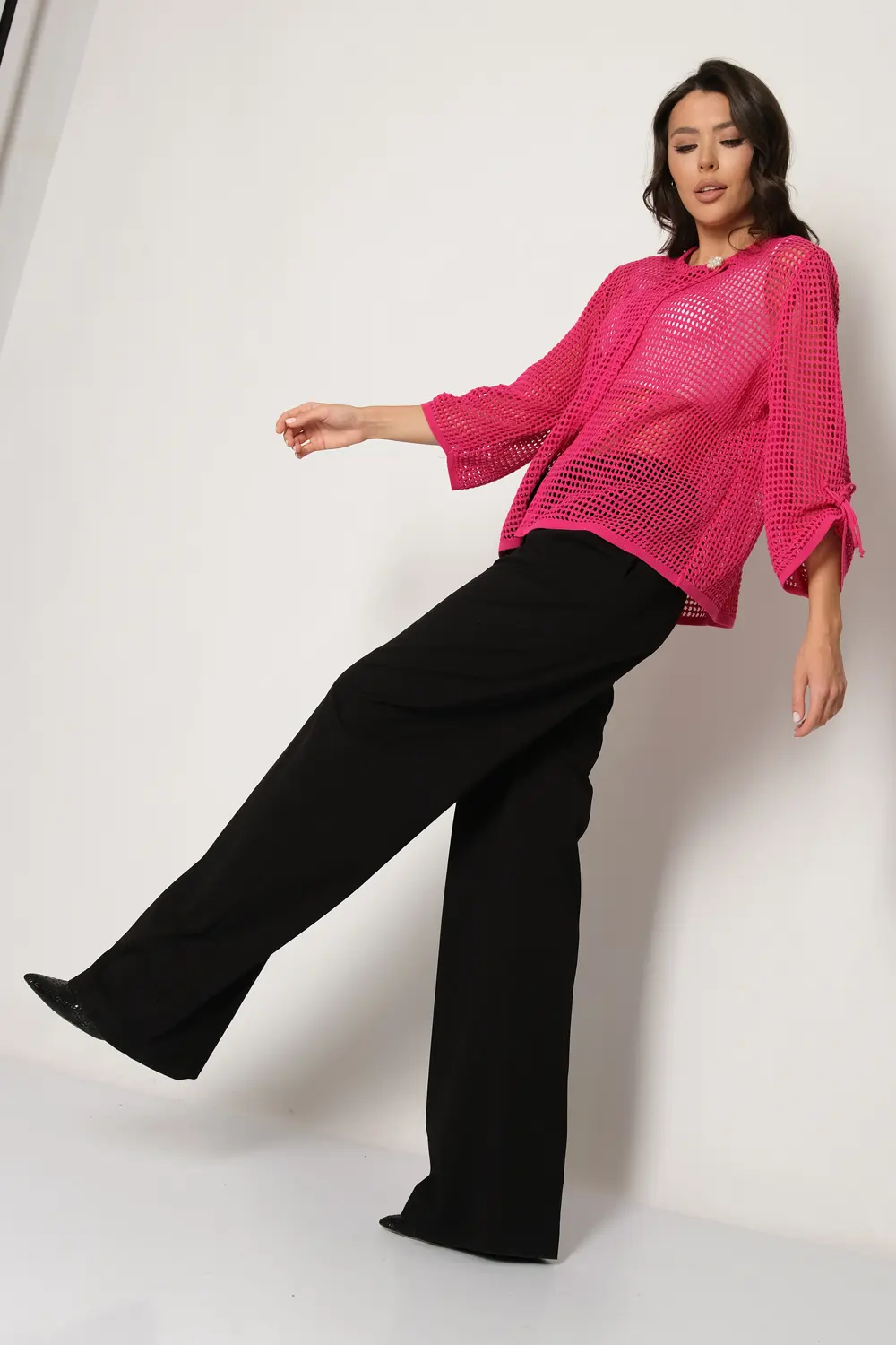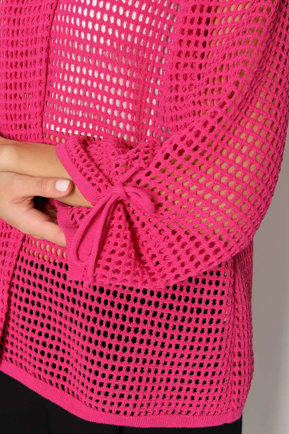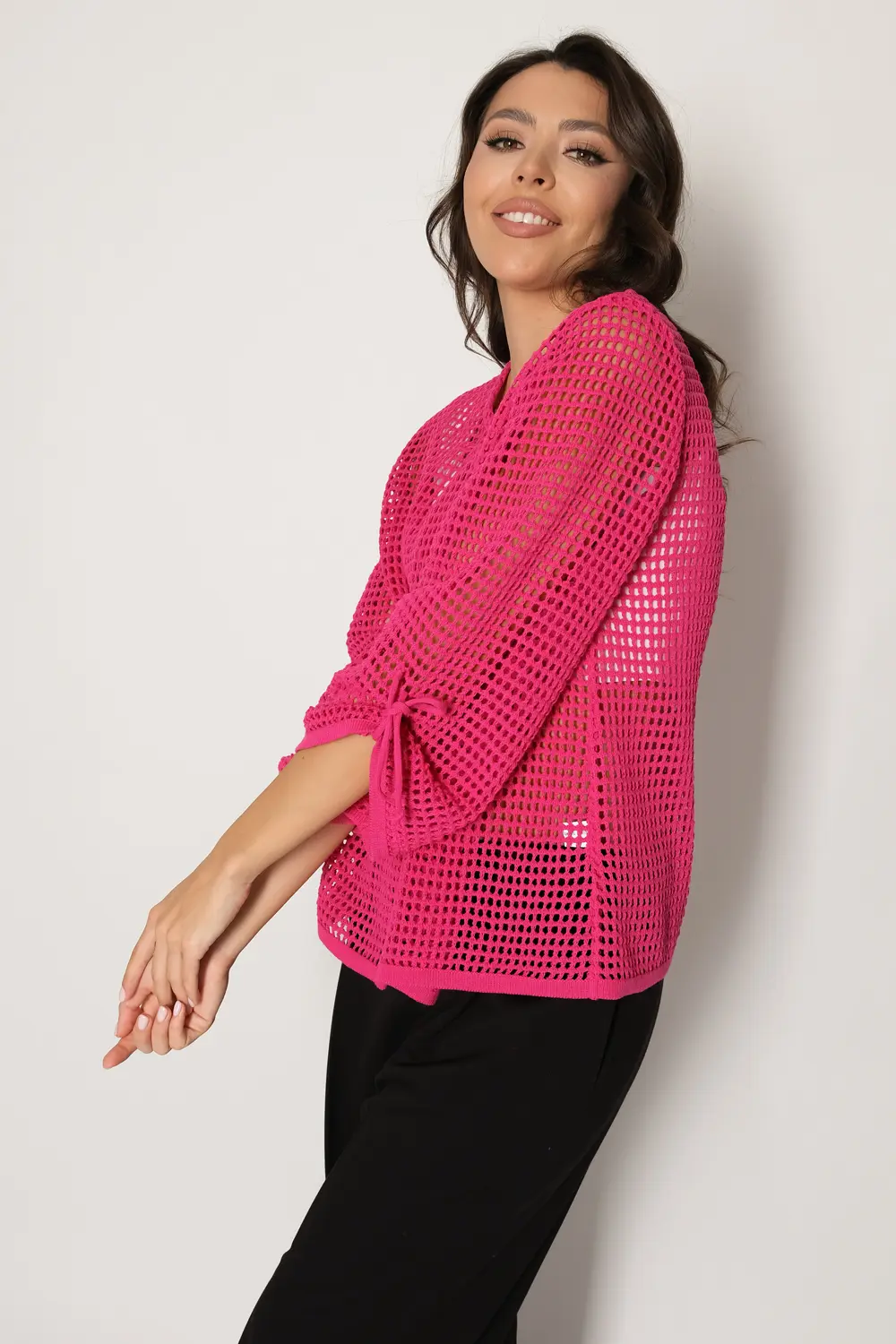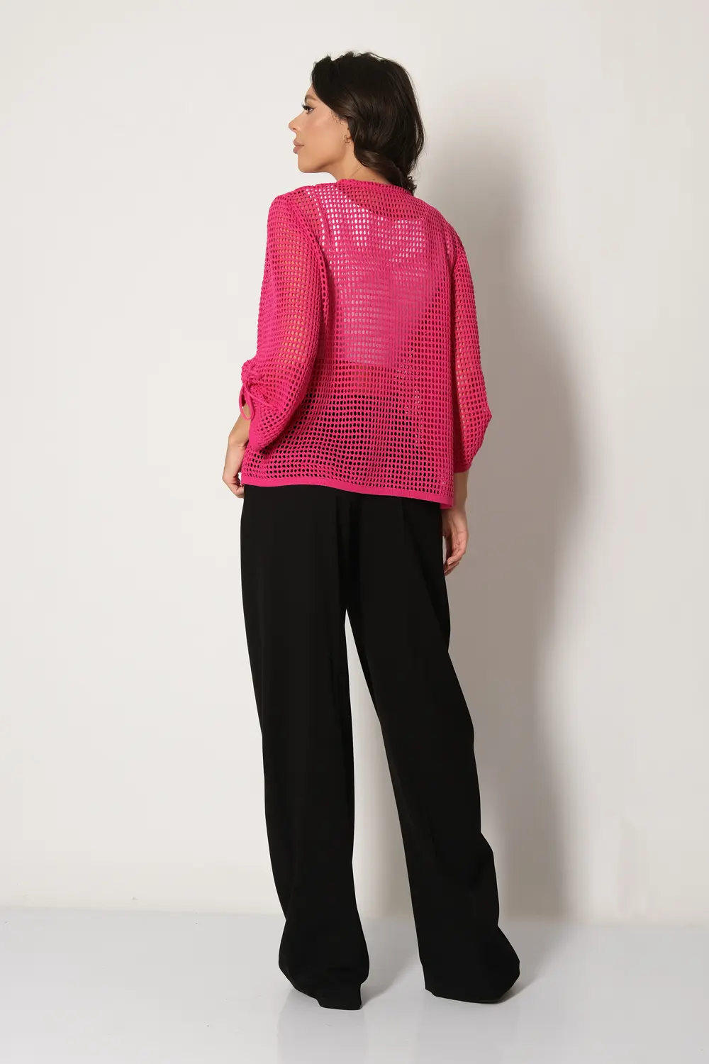 Жакет выполнен ажурной сеткой из смесовой пряжи с натуральным хлопком. Горловина круглая, рукава втачные длиной 7/8. Жакет застёгивается на одну пуговицу на горловине, вторая пуговица потайная расположена симметрично на передней планке изделия. Жакет можно носить в тёплое время года вторым слоем на топы, блузы, майки.