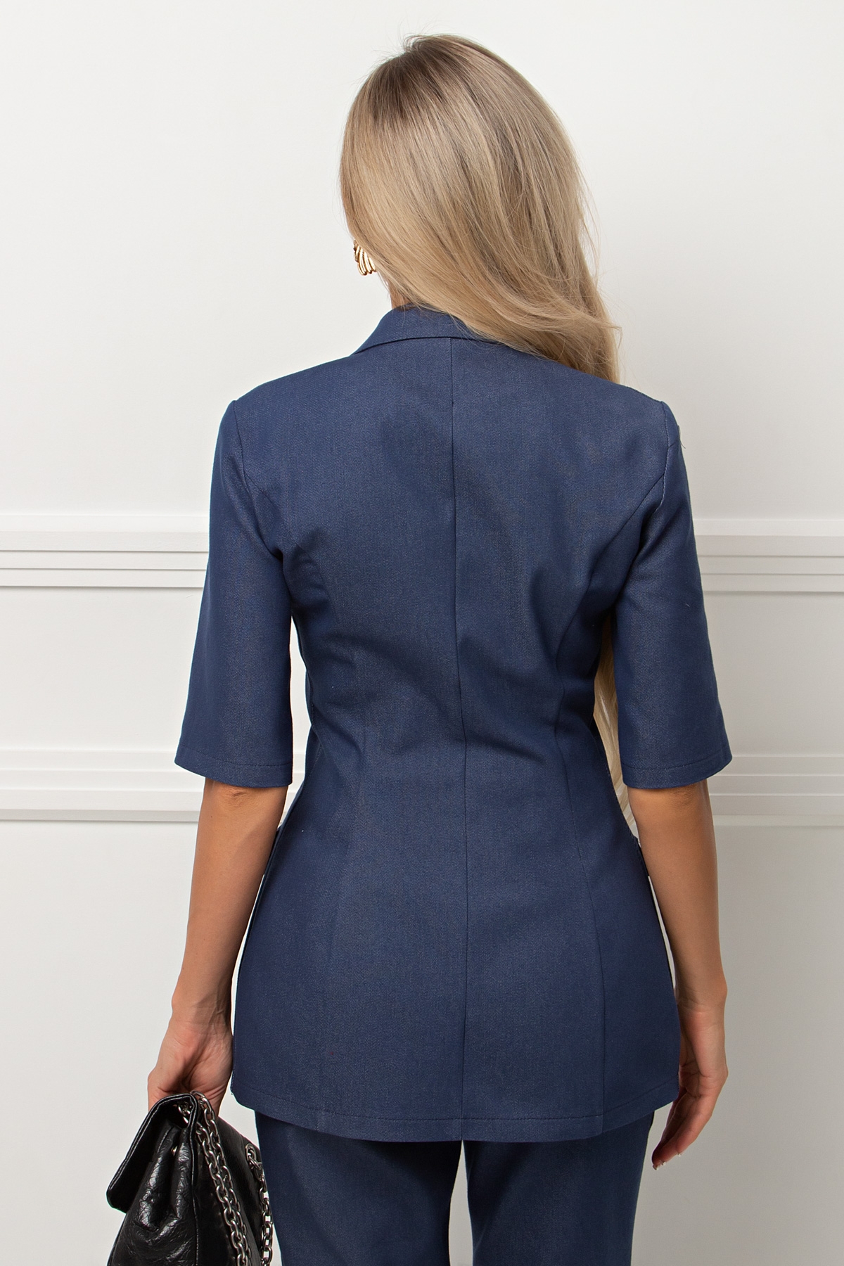 Стильный двубортный женский жакет приталенного силуэта из текстильного полотна. Жакет с коротким втачным рукавом. Английский отложной воротник. Асимметричный подборт с застёжкой на две пуговицы. Перед дополнен накладными карманами-клапаном. Тканевый пояс подчёркивает линию талии. Летний офисный жакет, также для праздника и торжества. Рекомендуемая стирка при t не более 30. Длина жакета: 70 см Длина рукава : 32 см Рост фотомодели: 168 см Размер фотомодели: 42 Ткань: джинса